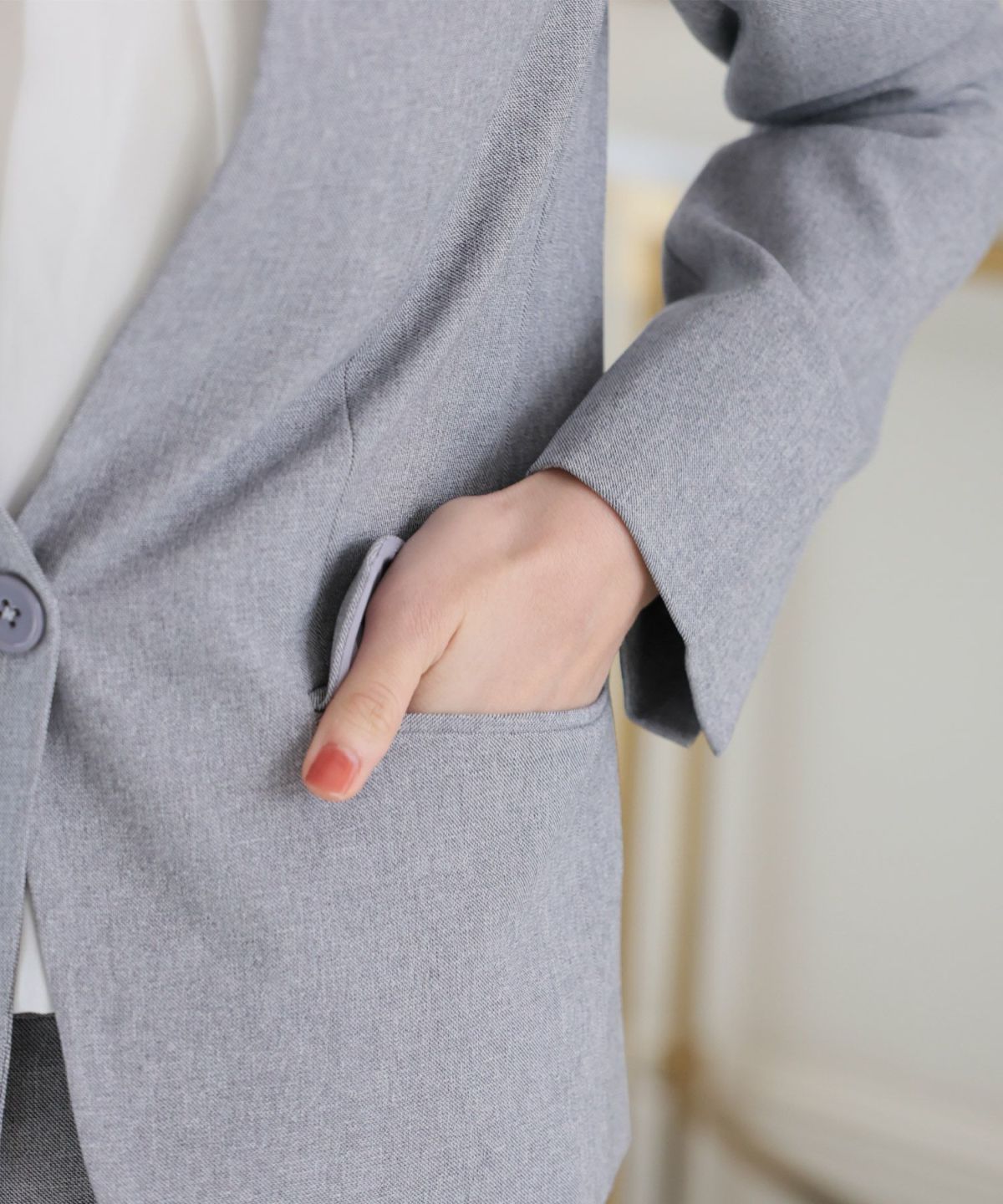 ノーカラーのジャケットで定番のスーツとは一味違うデザインに。