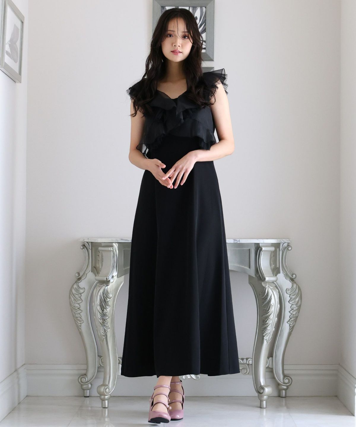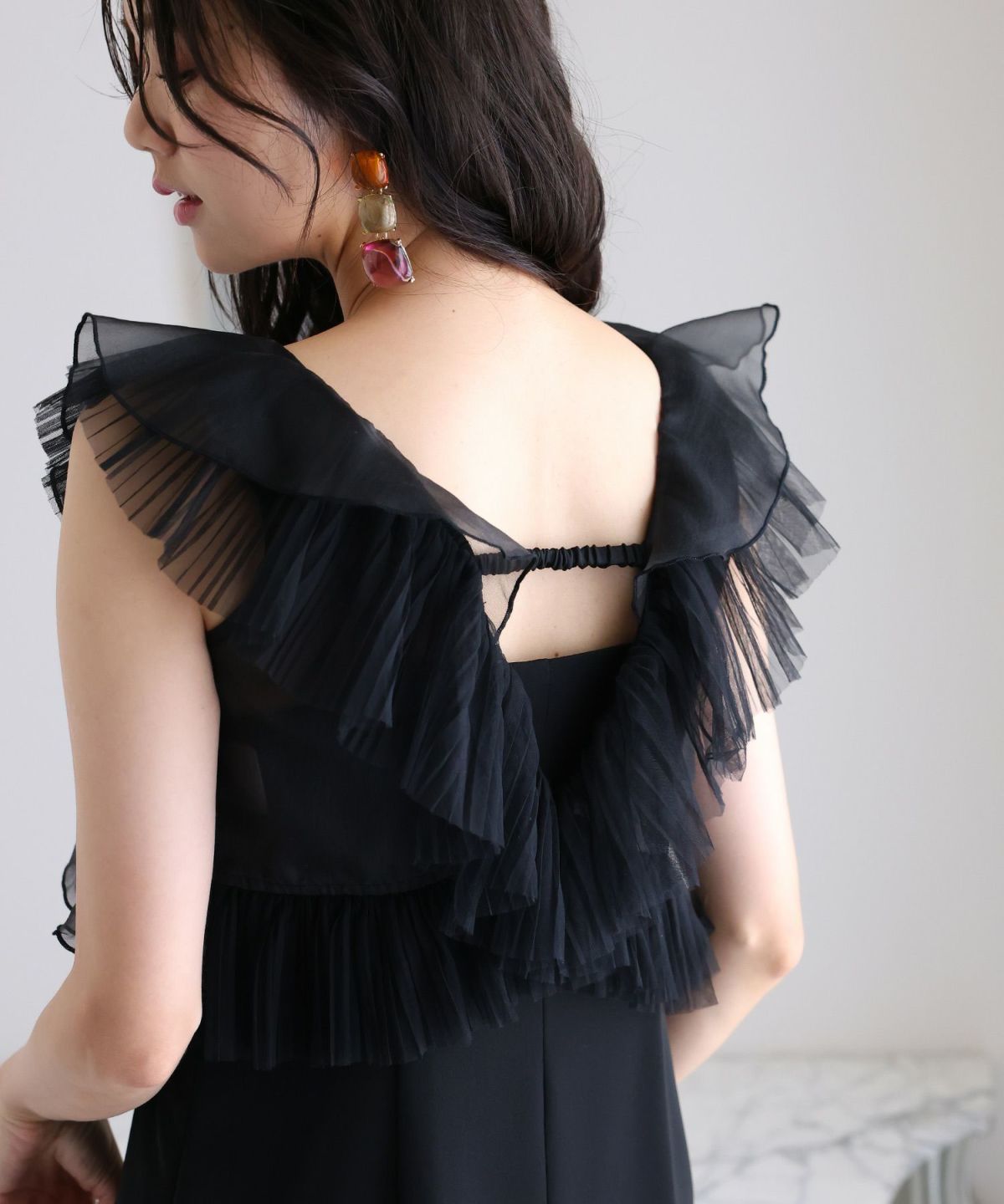 ラッフルとプリーツの異素材ミックスが映えるトップスと、フレアラインのキャミドレスが美しい一枚。