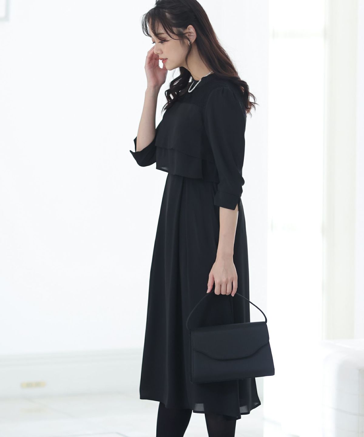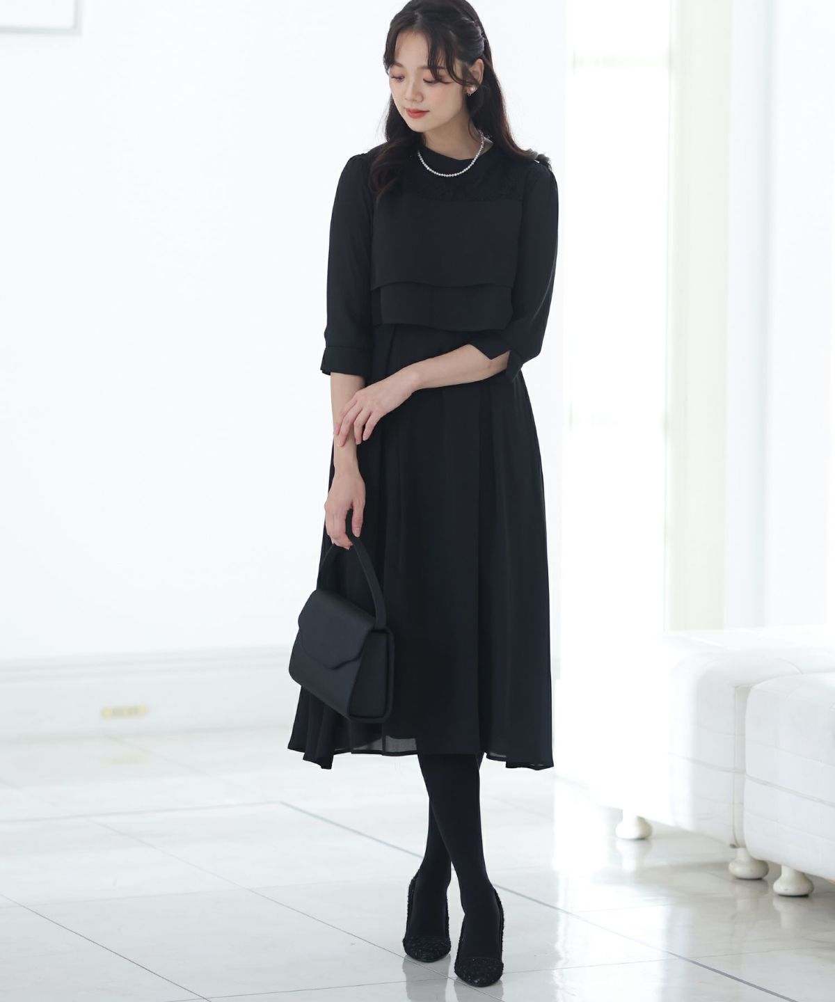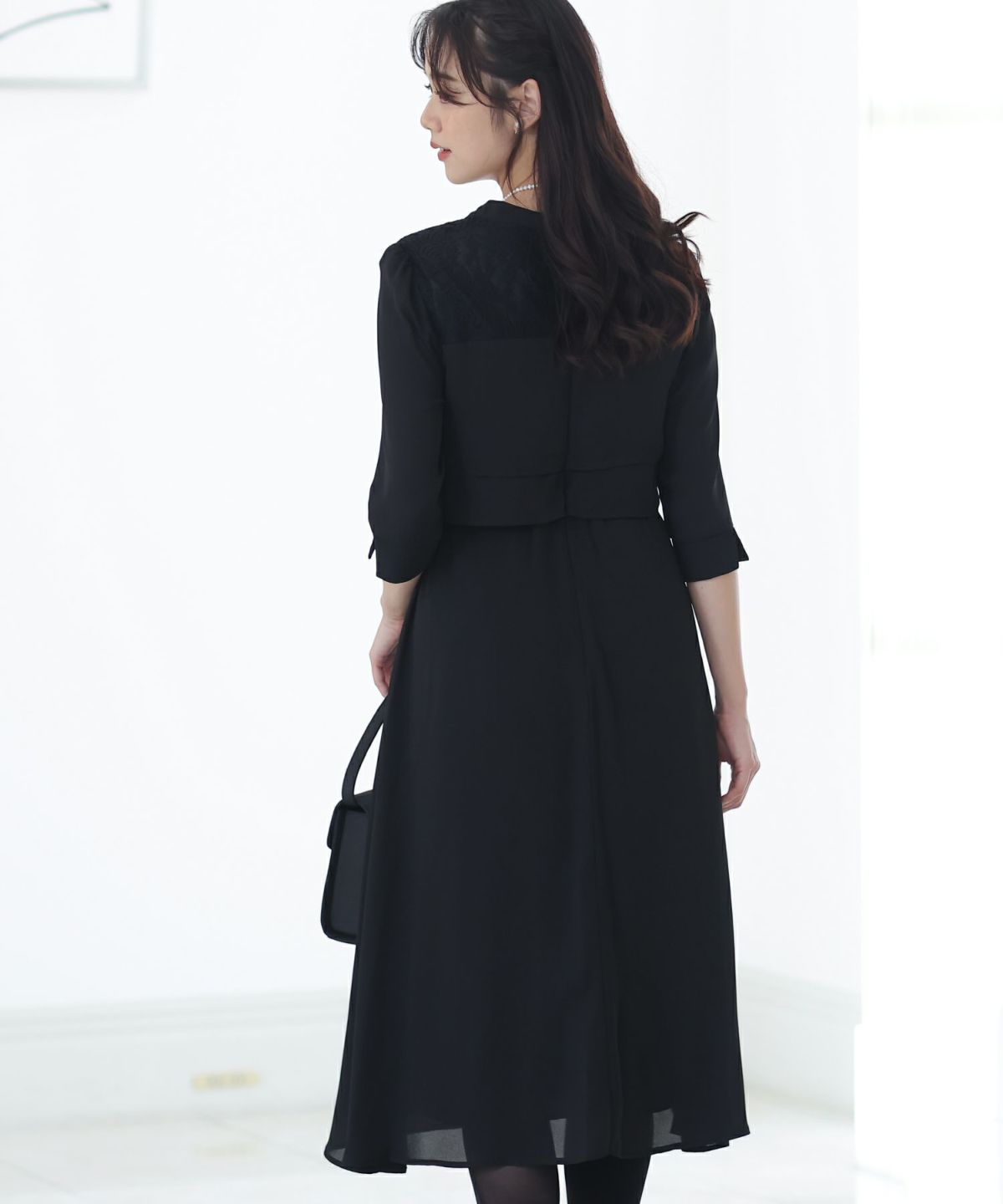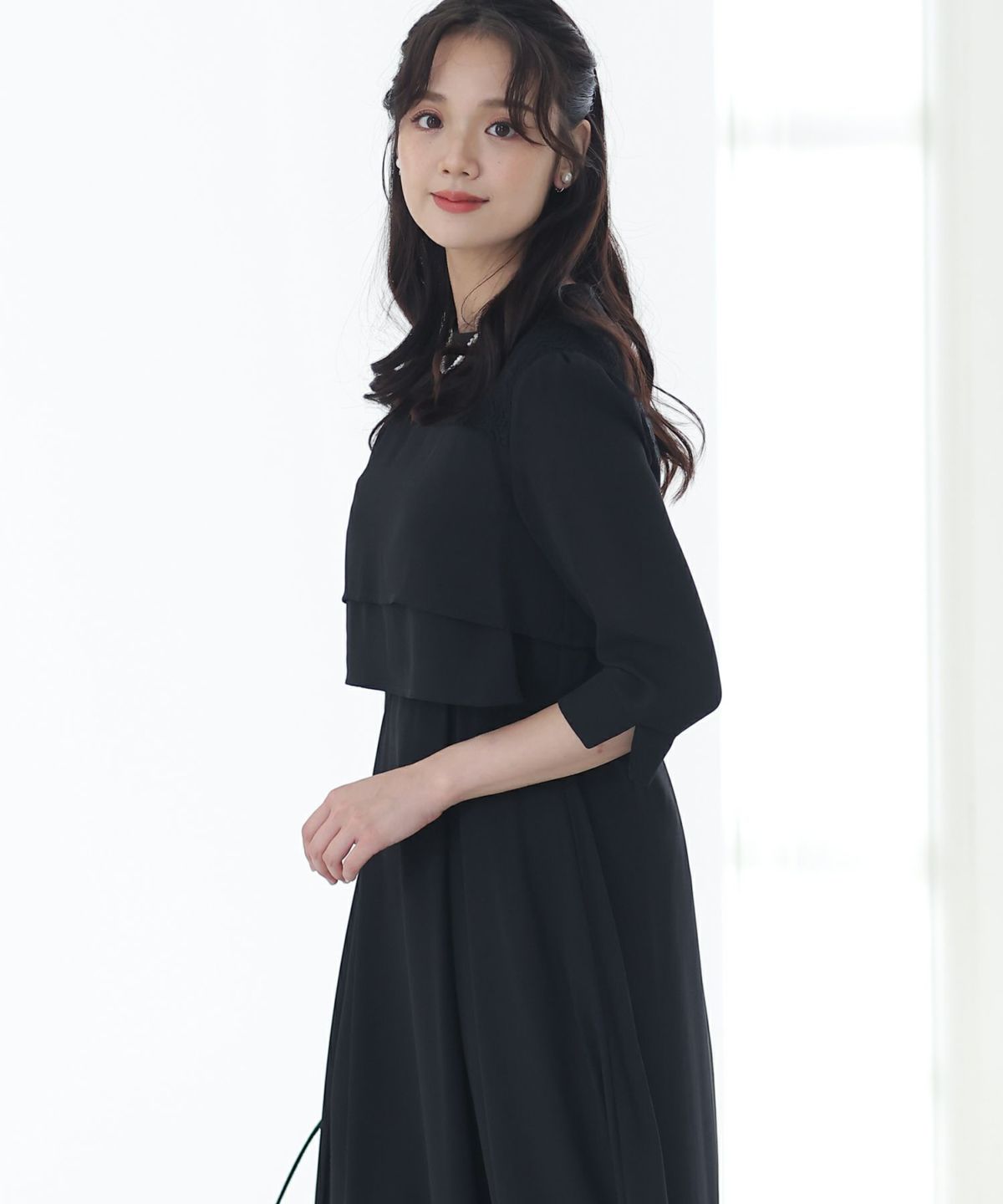 ■レース×シフォンレースとシフォンの切り替えが可愛いブラックワンピース。柔らかいシフォン生地で優しい雰囲気を演出します。バスト部分にはファスナーが付いており、授乳中の方におすすめです。冠婚葬祭はもちろん、シンプルなデザインで使いやすいアイテムです。