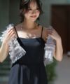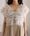 ノースリーブの肌見せで軽やかな印象に。チュールのボリュームたっぷりトップスが顔周りを華やかに見せつつ、小顔効果も期待できます。