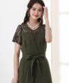 ■デコルテ部分がレースの透け感ですっきり。体型カバーポイント:【二の腕】【脚】【ウエスト】【ヒップ】レースの袖付きでさり気なく二の腕をカバー。付属のウエストリボンで細身効果。