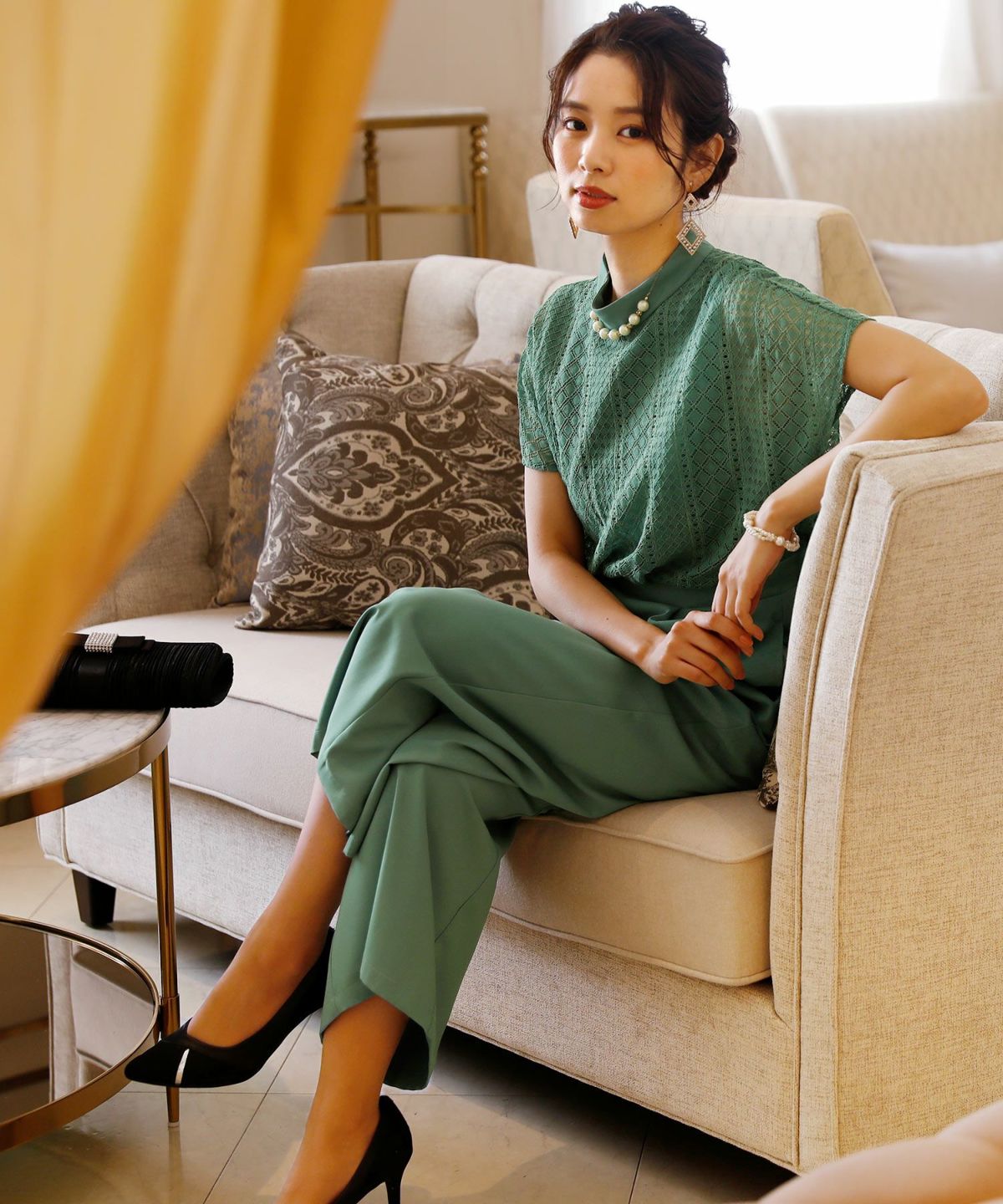 スタイリッシュに決まる上品パンツドレス ハイネック&レース ワイドパンツドレス