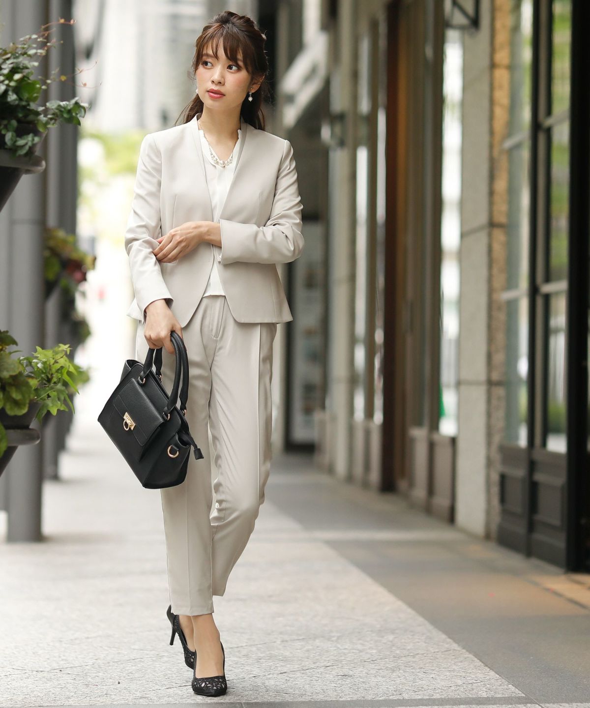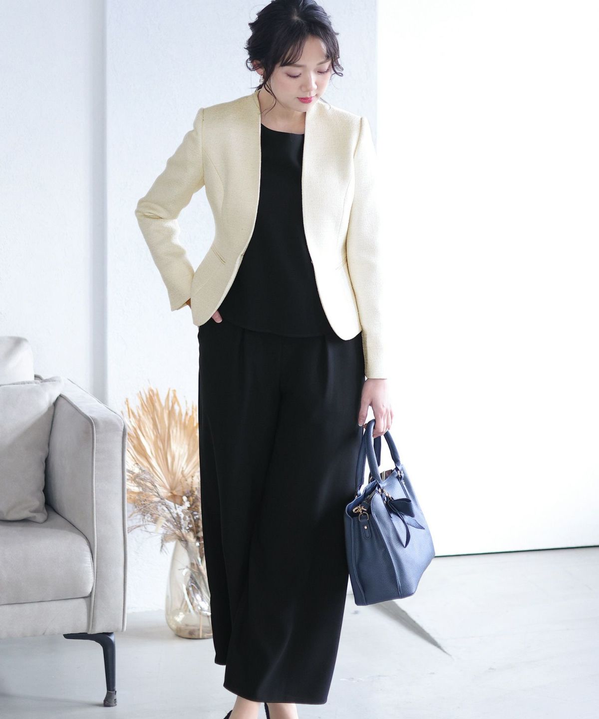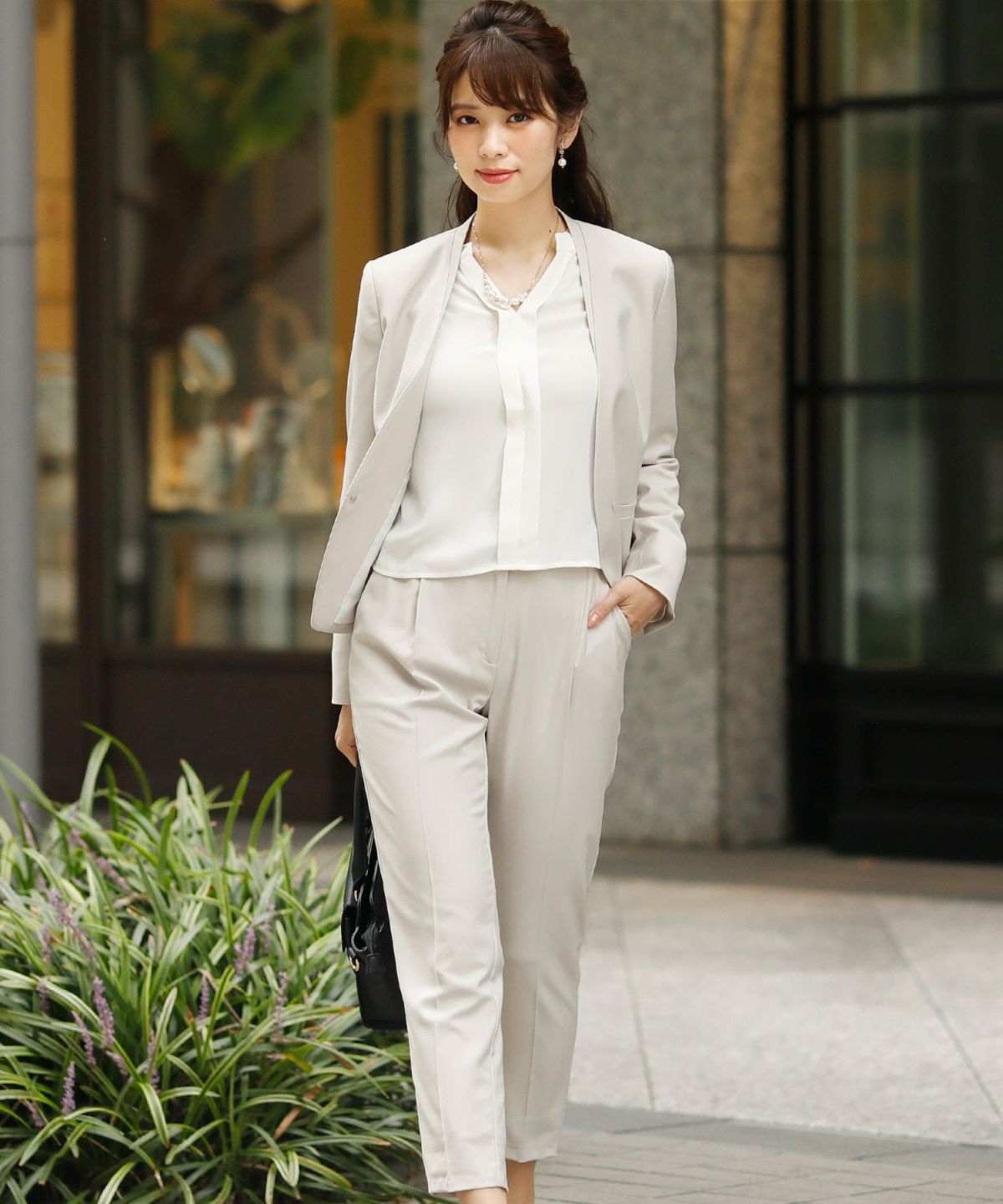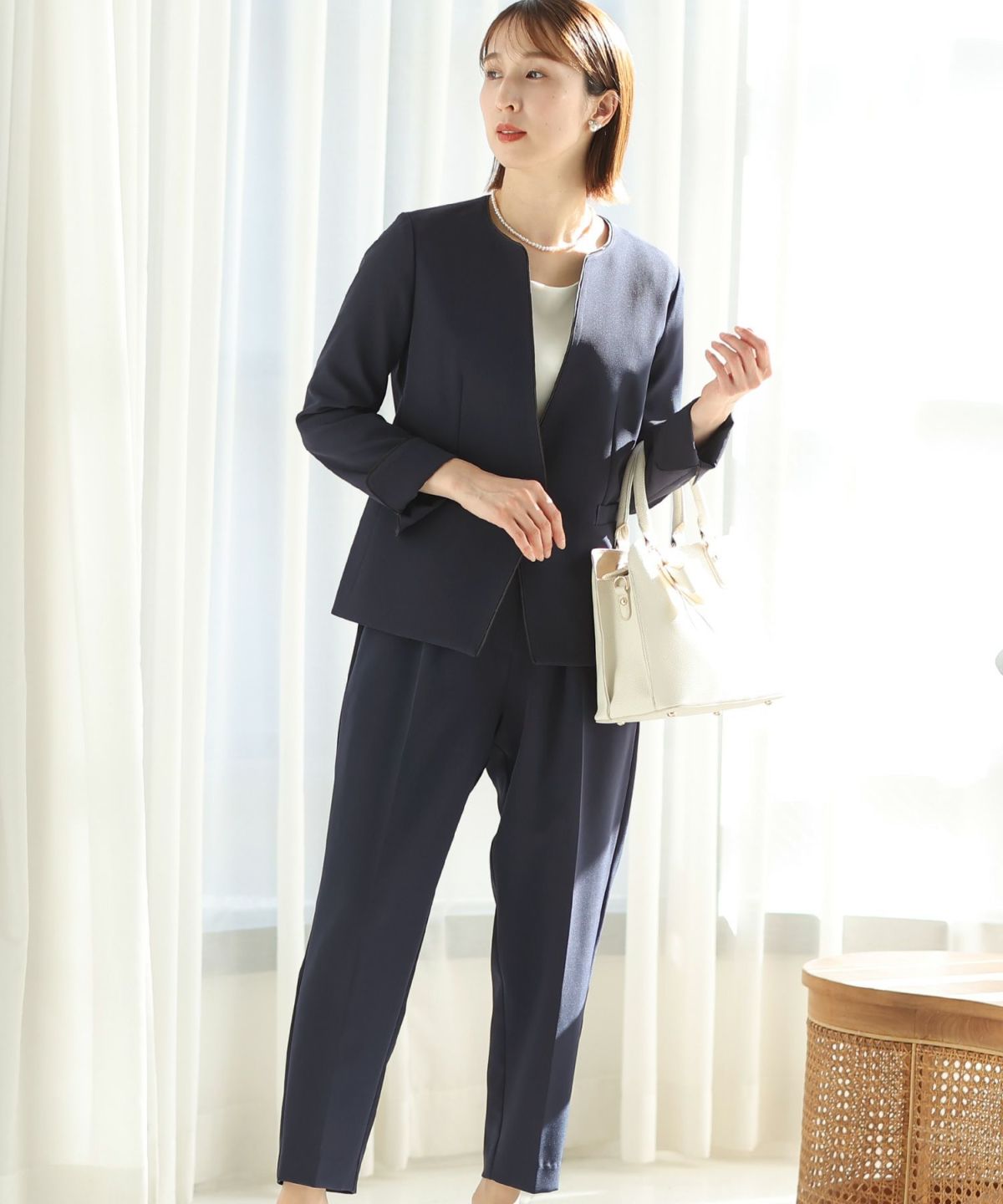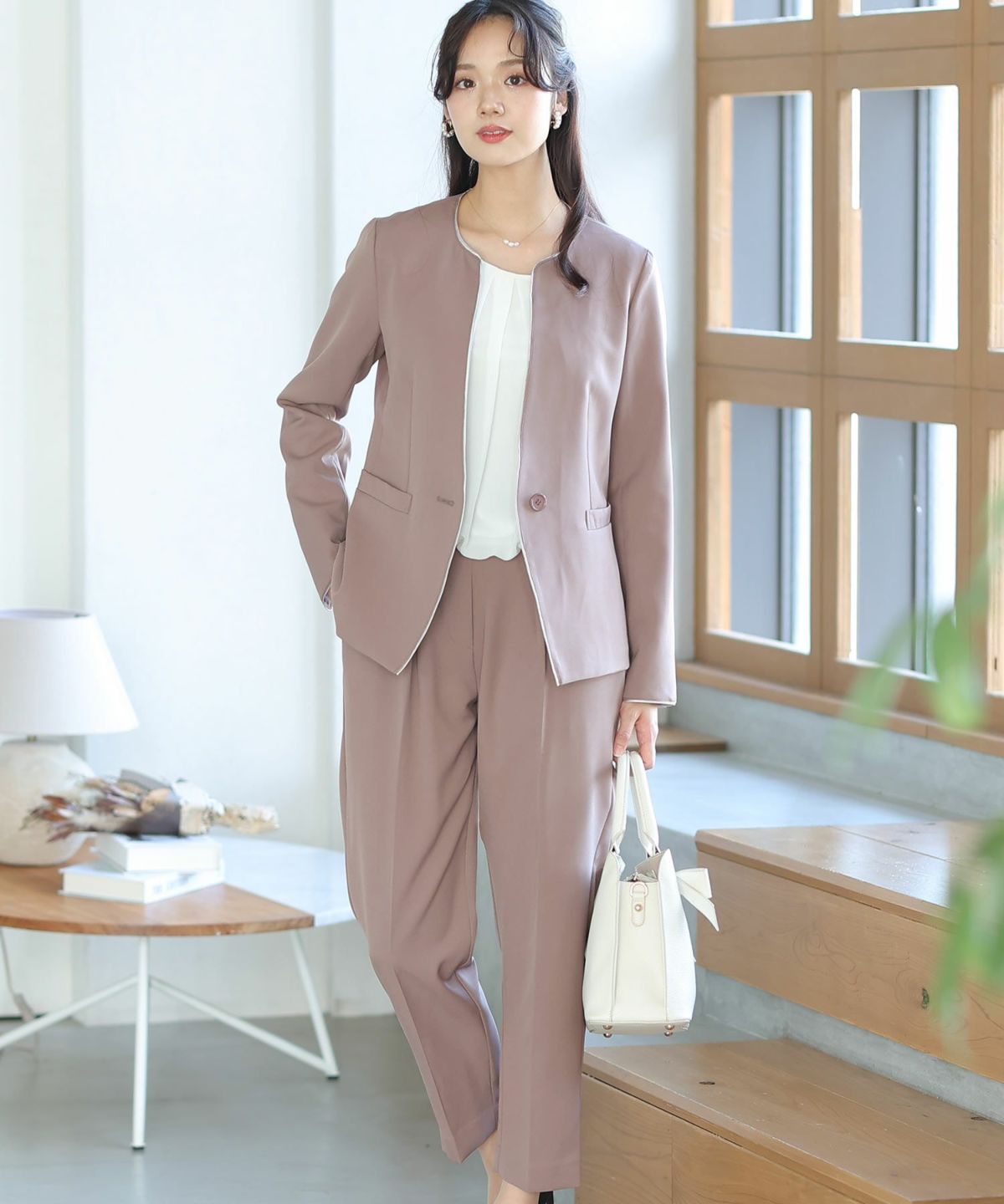 オフの日やカジュアルなイベントには、リラックス感のあるスーツがおすすめです。軽やかな素材と明るいカラーで、柔らかい雰囲気をプラス。