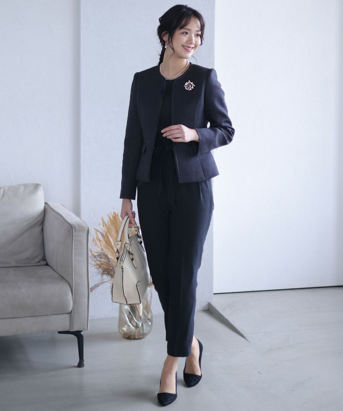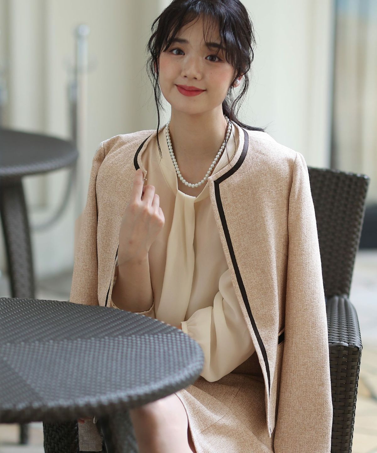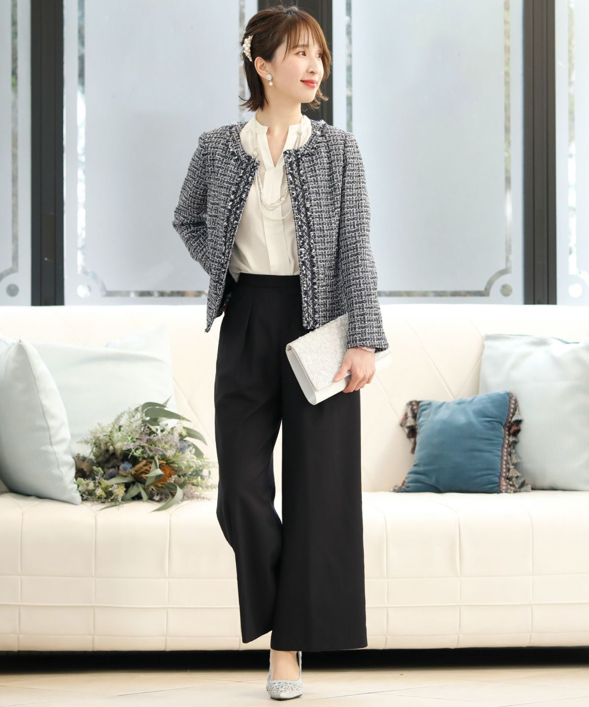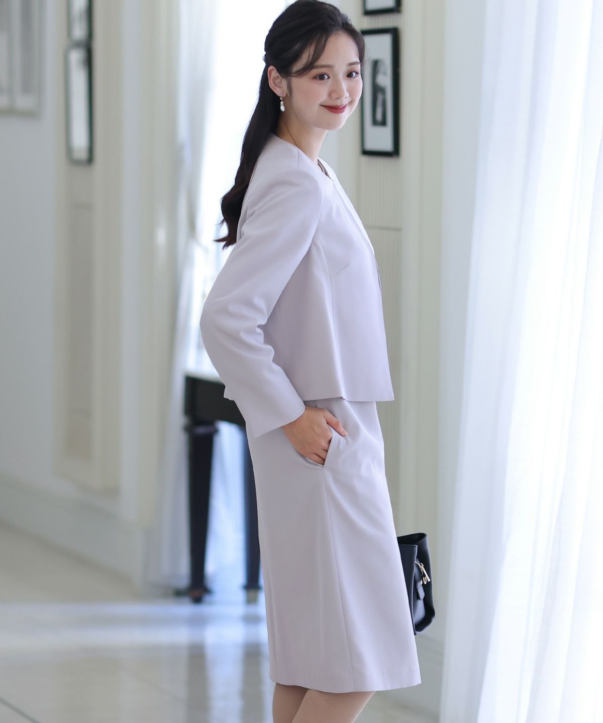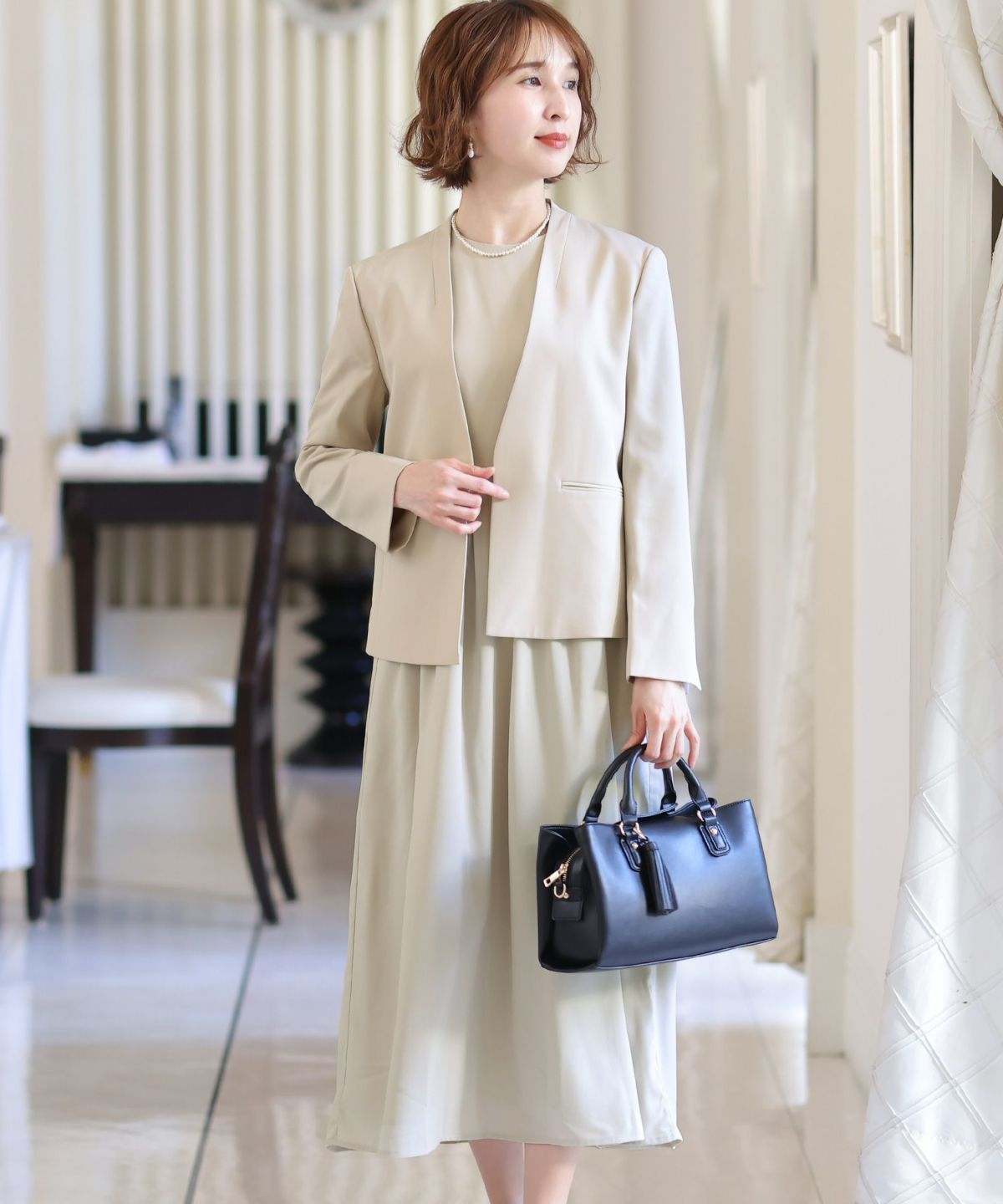 オフの日やカジュアルなイベントには、リラックス感のあるスーツがおすすめです。軽やかな素材と明るいカラーで、柔らかい雰囲気をプラス。