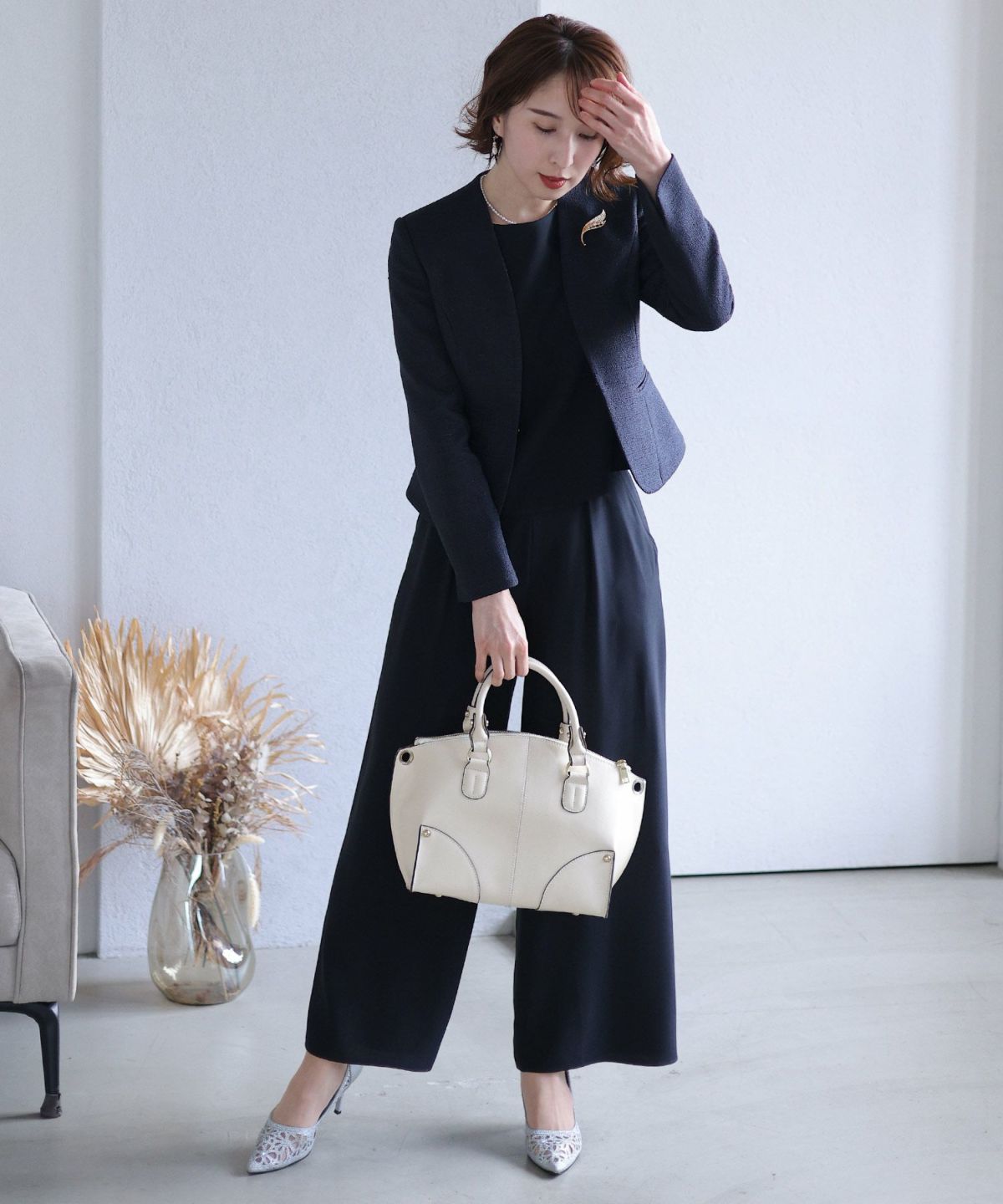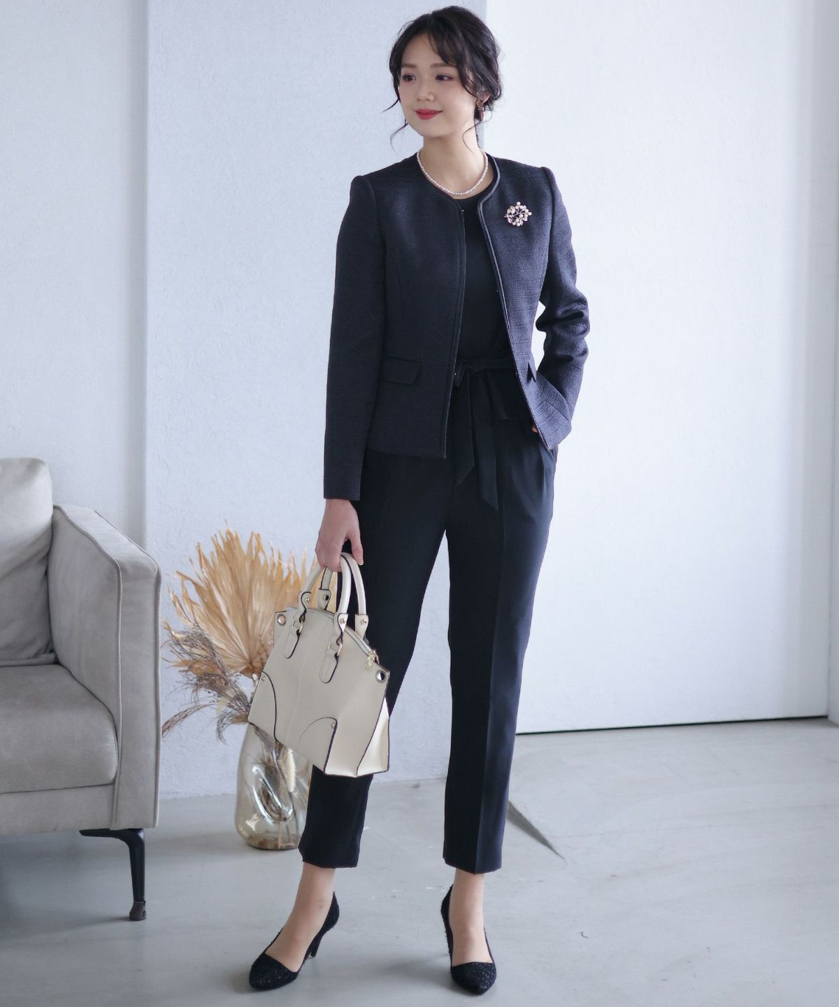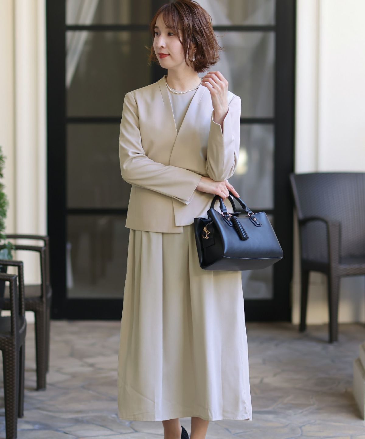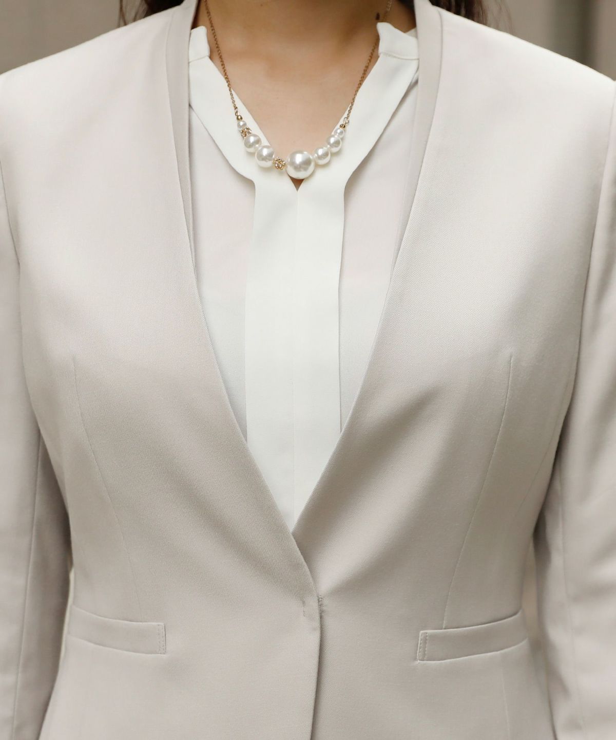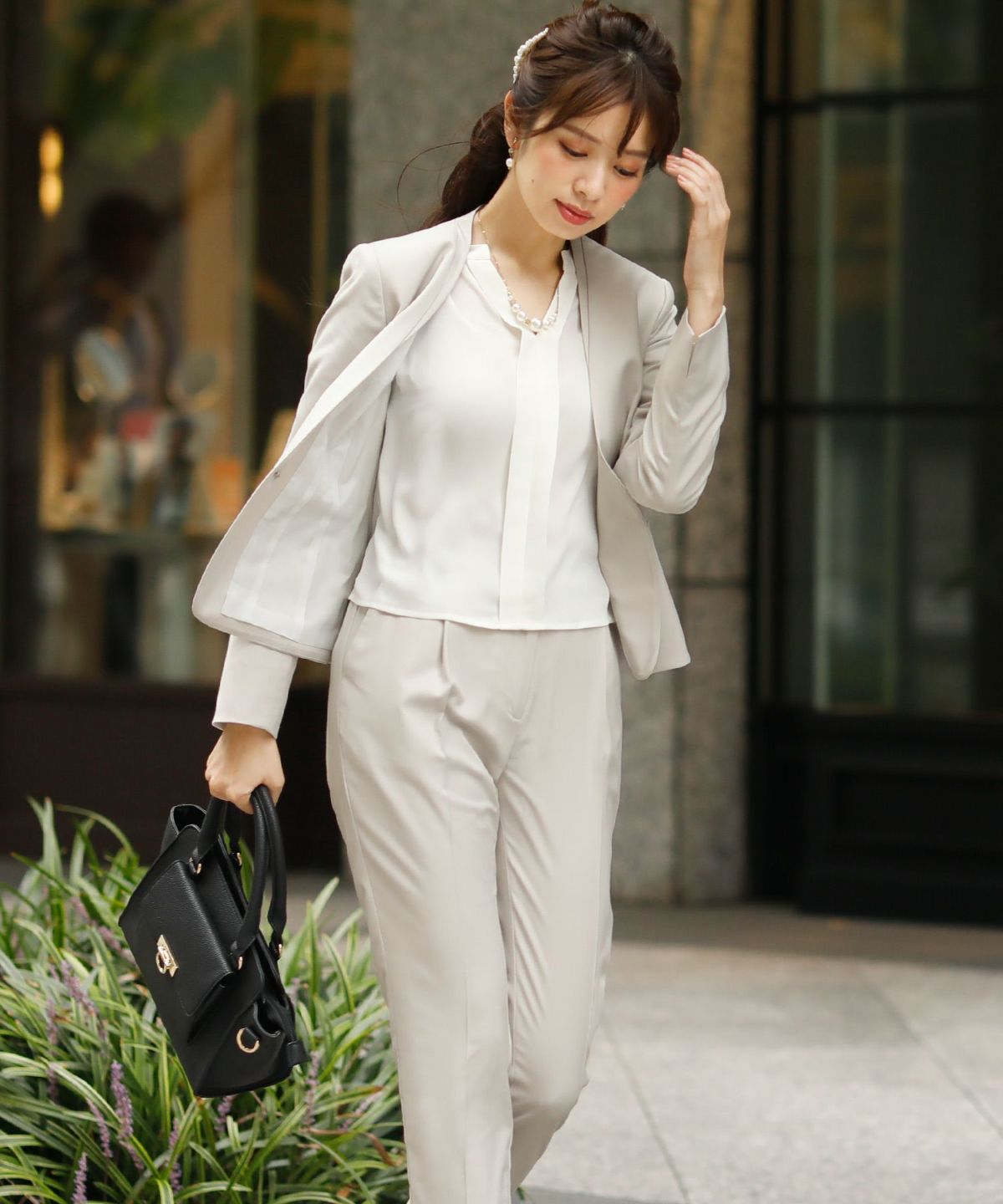 オフの日やカジュアルなイベントには、リラックス感のあるスーツがおすすめです。軽やかな素材と明るいカラーで、柔らかい雰囲気をプラス。