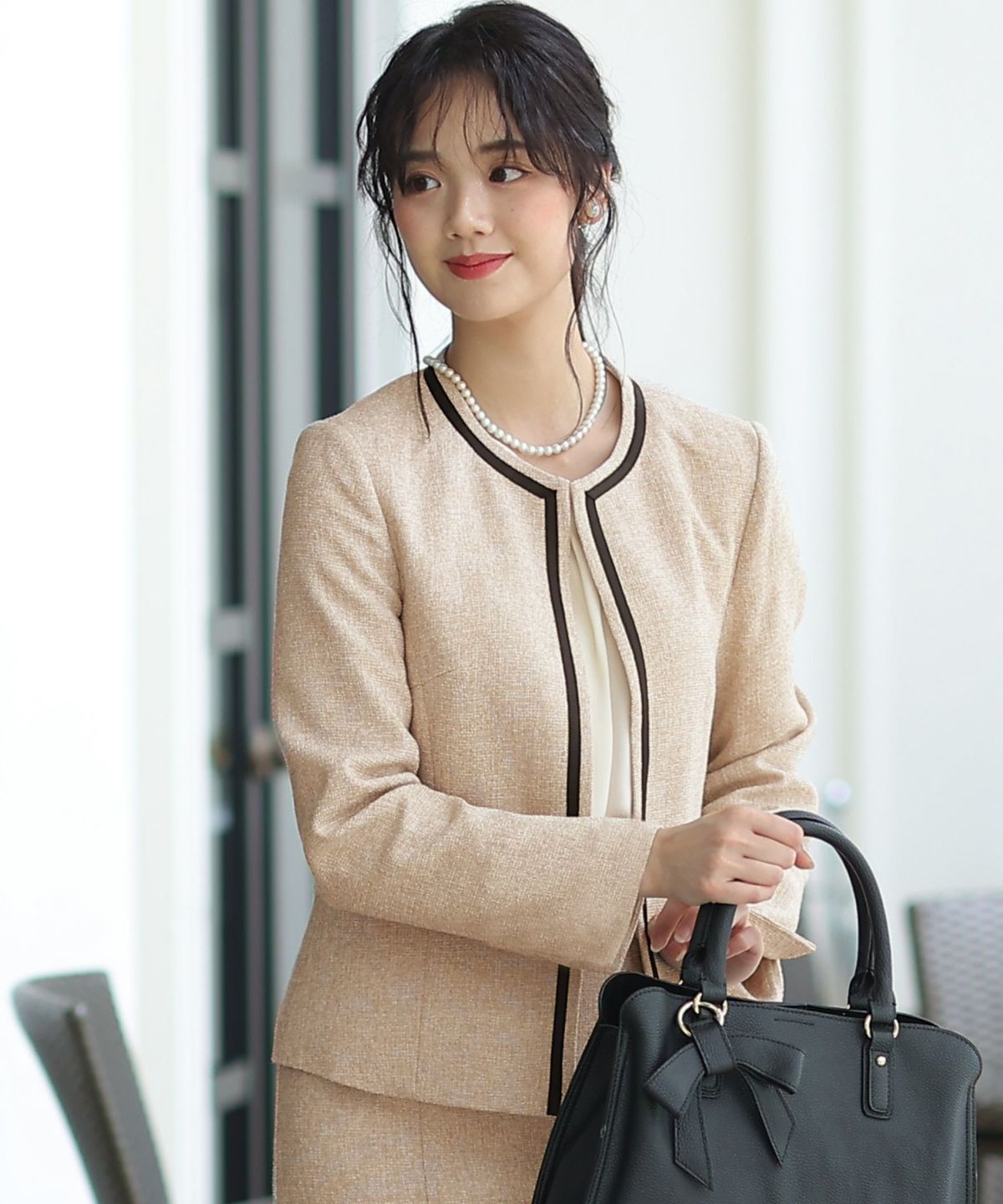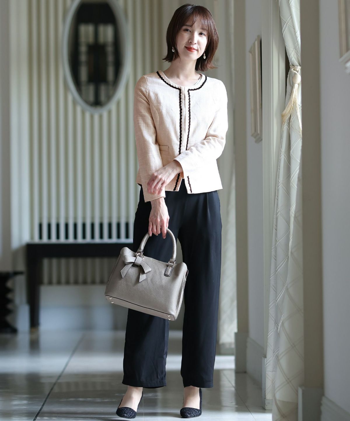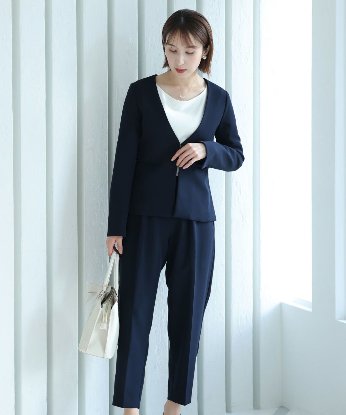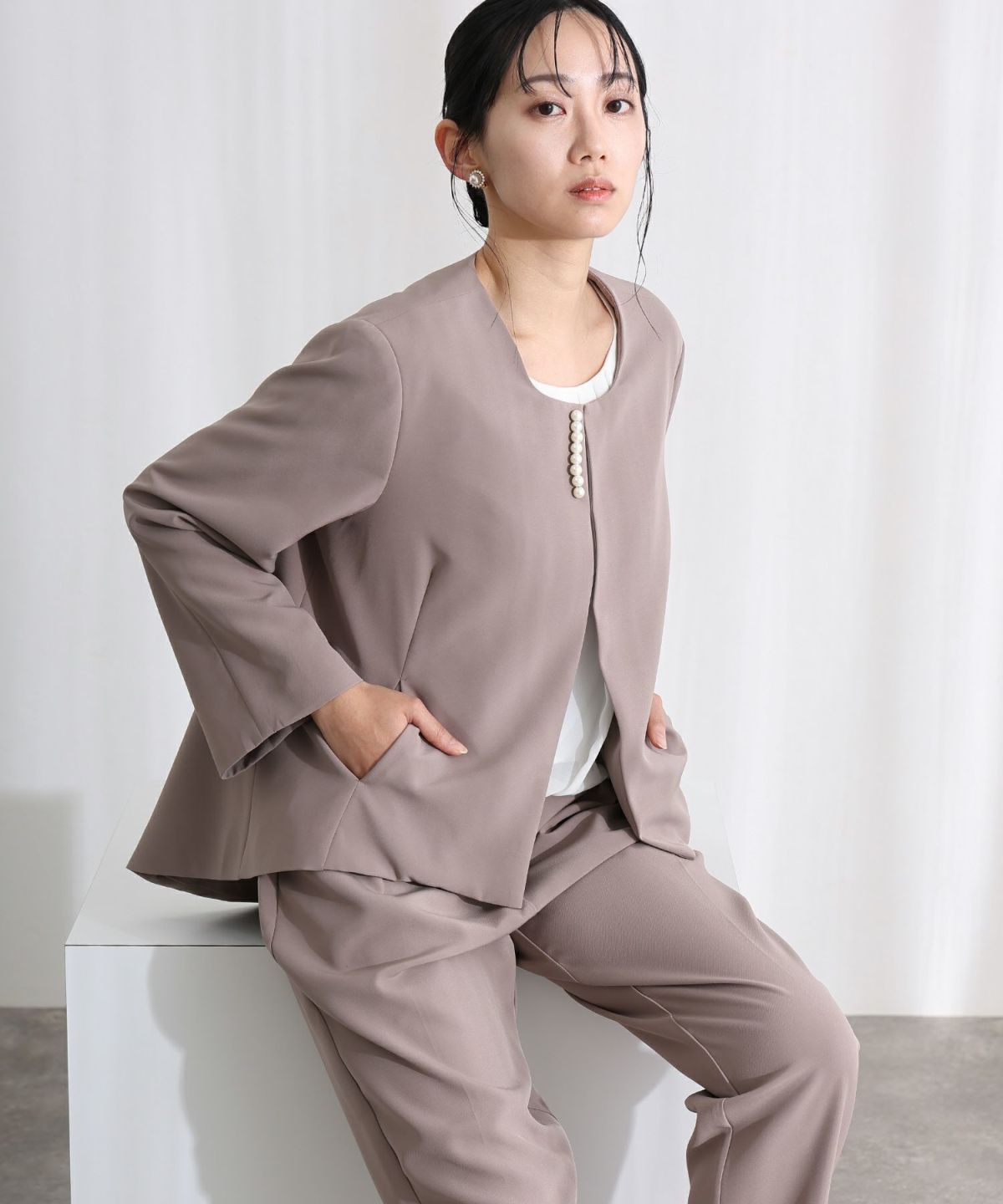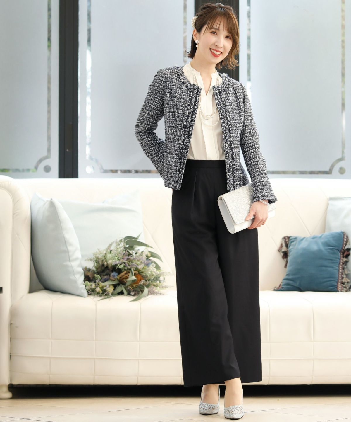 オフの日やカジュアルなイベントには、リラックス感のあるスーツがおすすめです。軽やかな素材と明るいカラーで、柔らかい雰囲気をプラス。