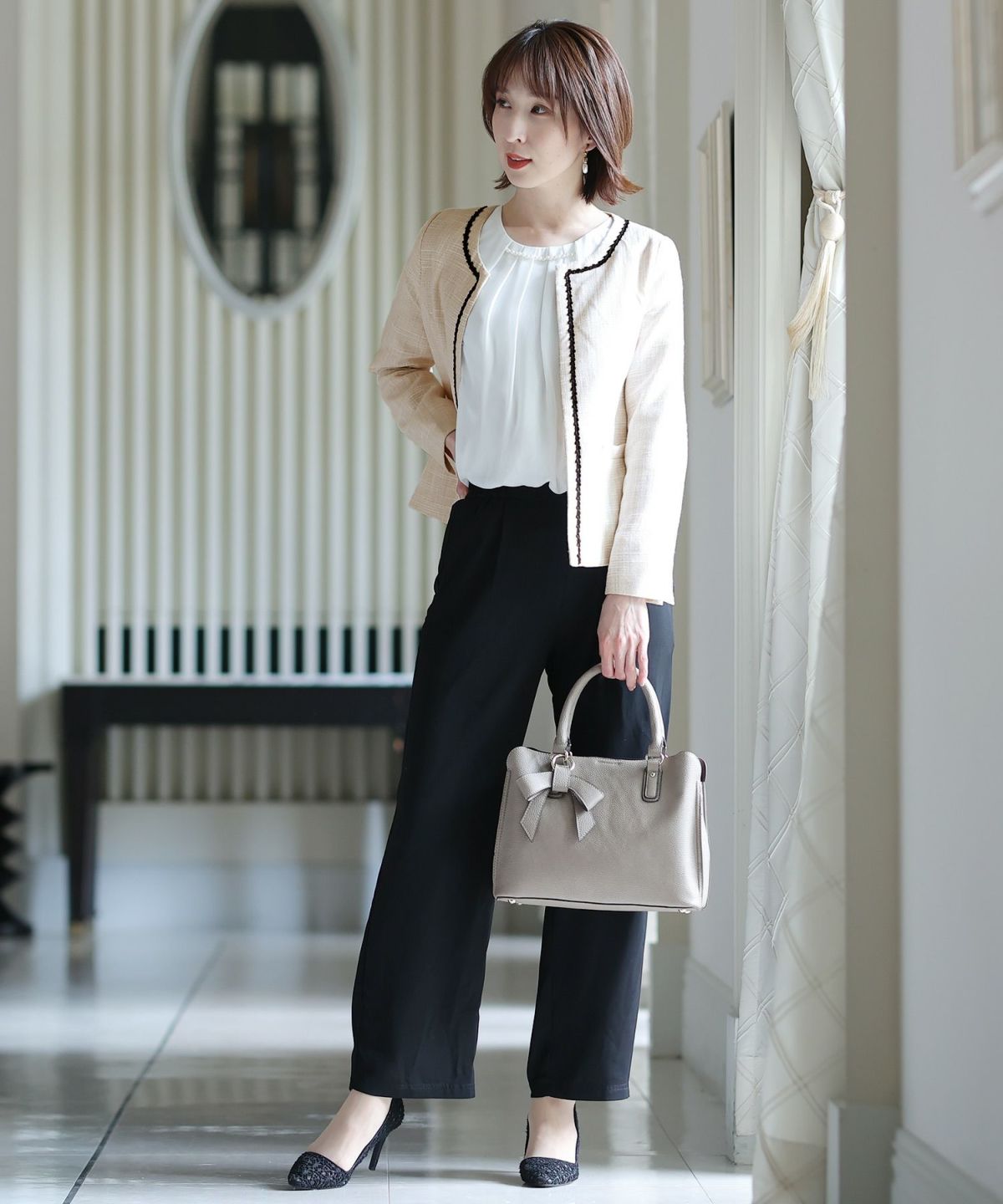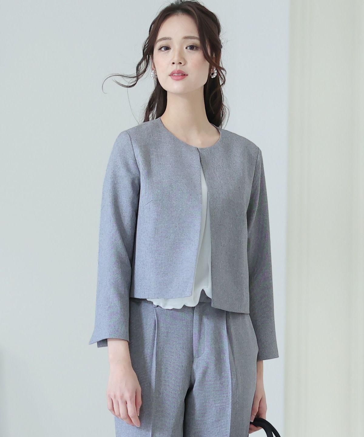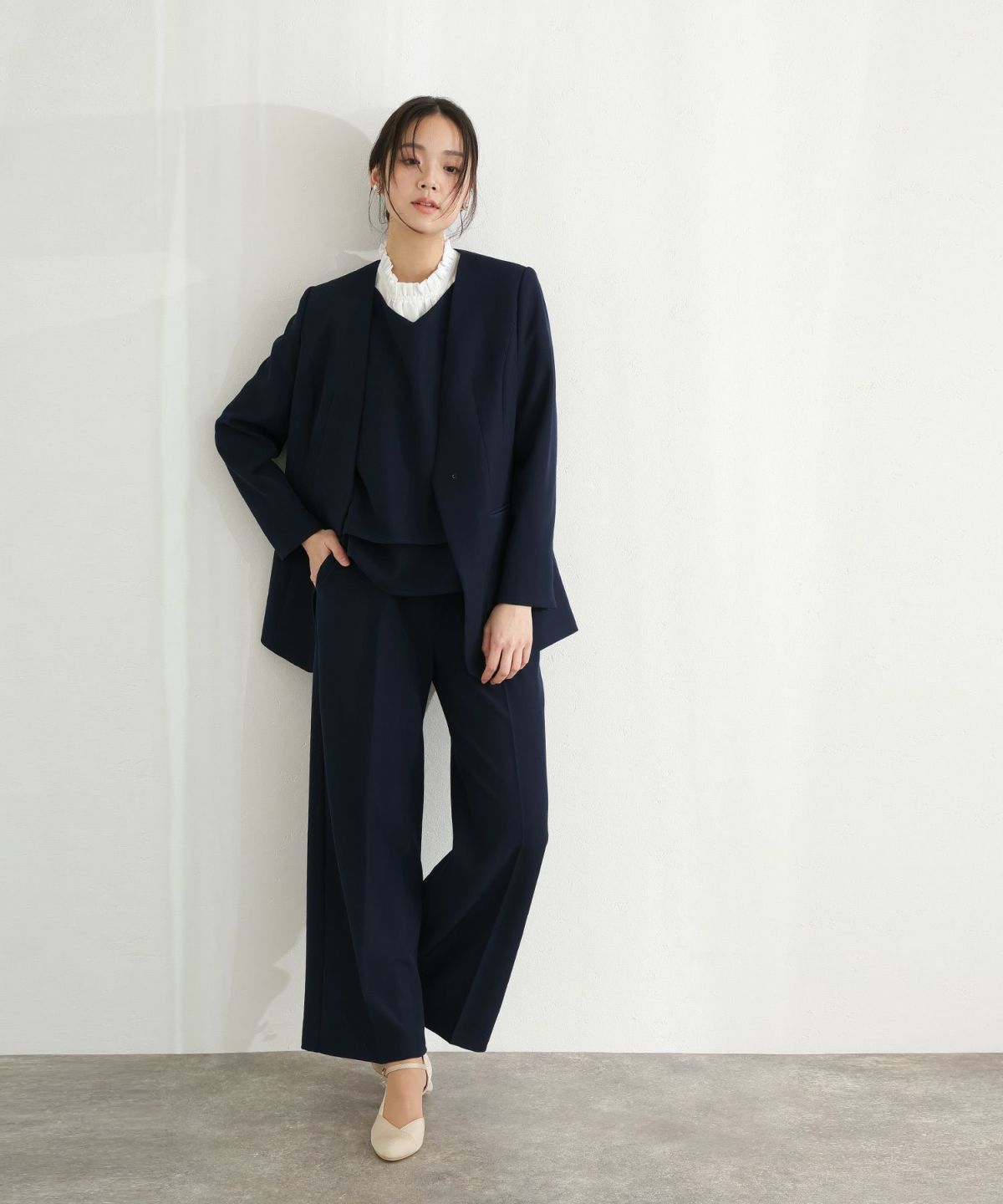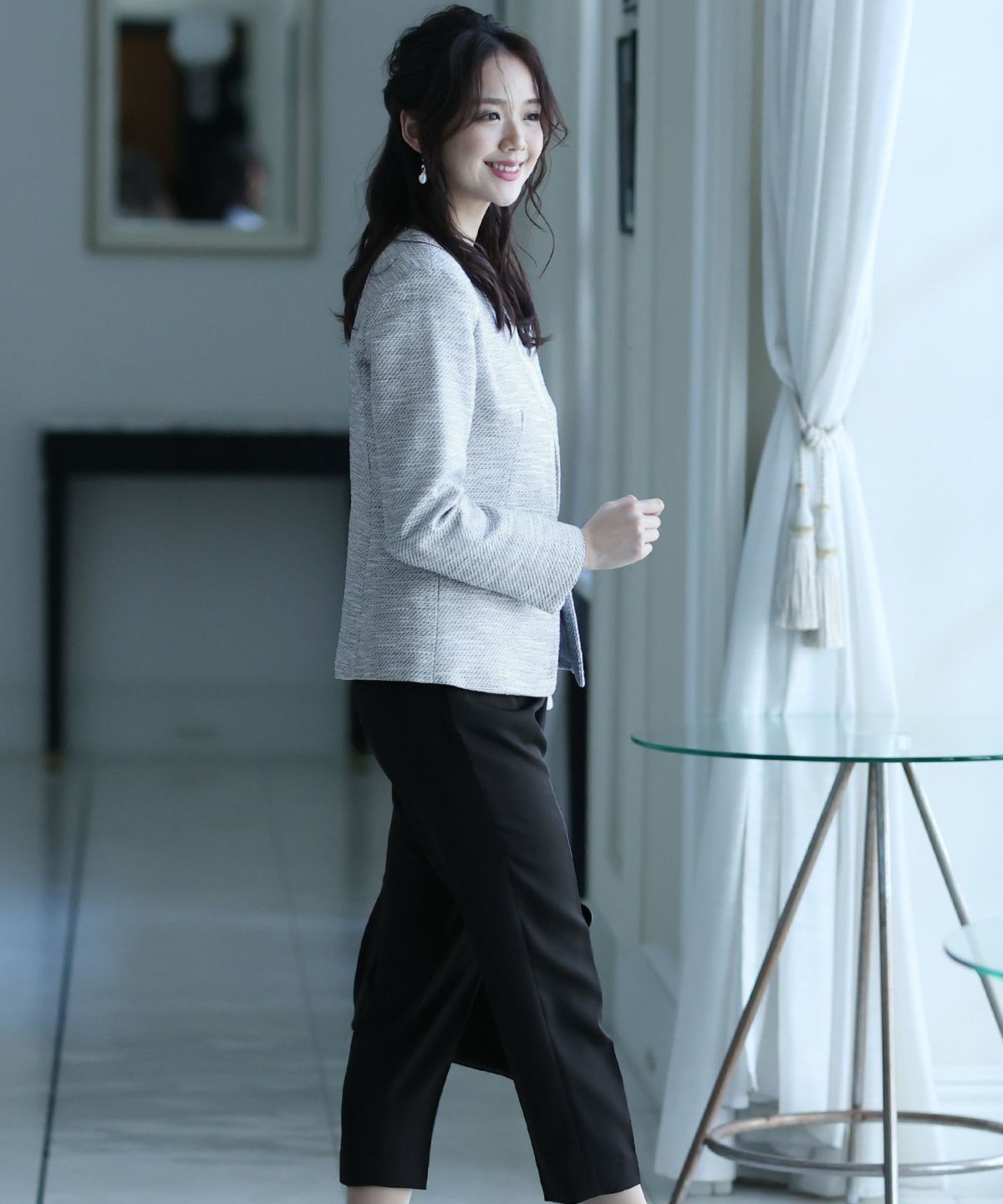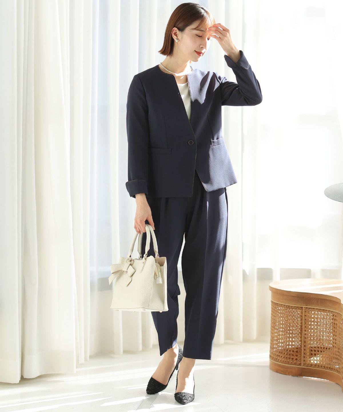 オフの日やカジュアルなイベントには、リラックス感のあるスーツがおすすめです。軽やかな素材と明るいカラーで、柔らかい雰囲気をプラス。