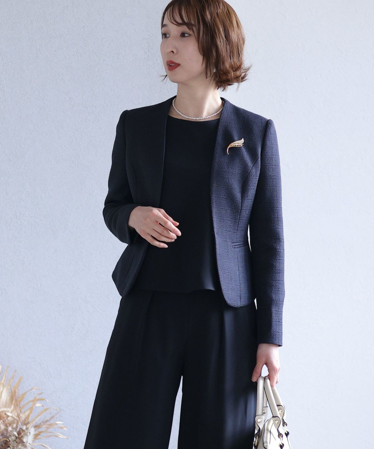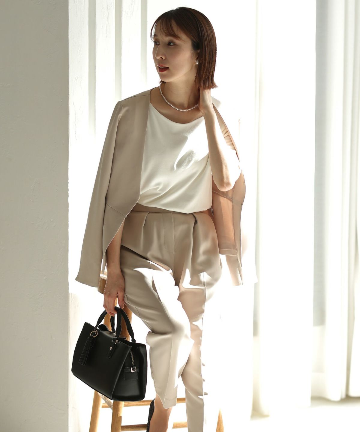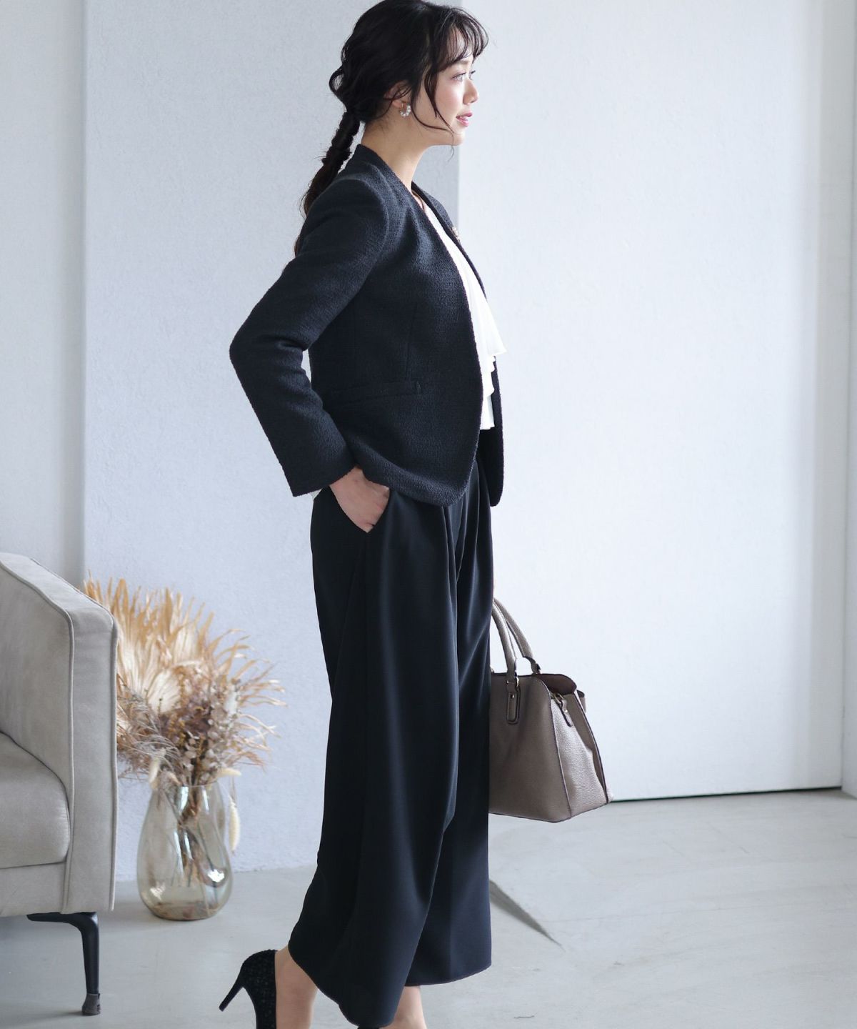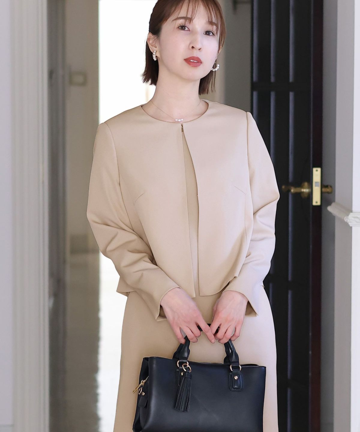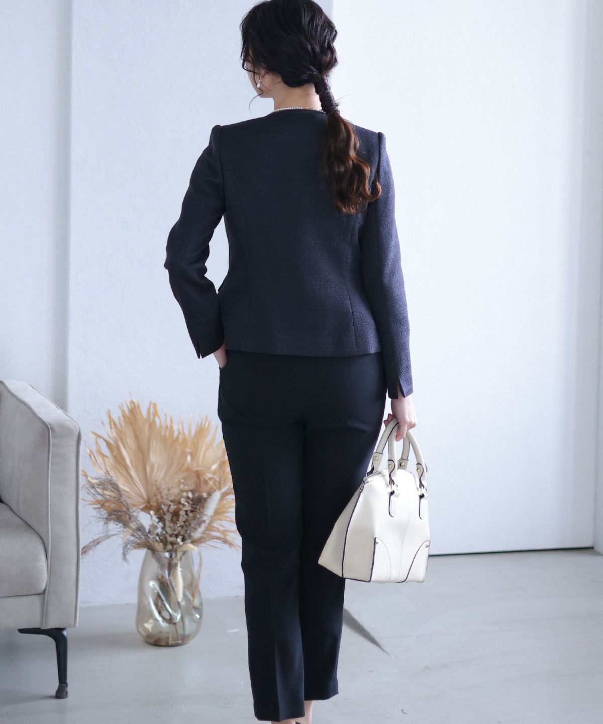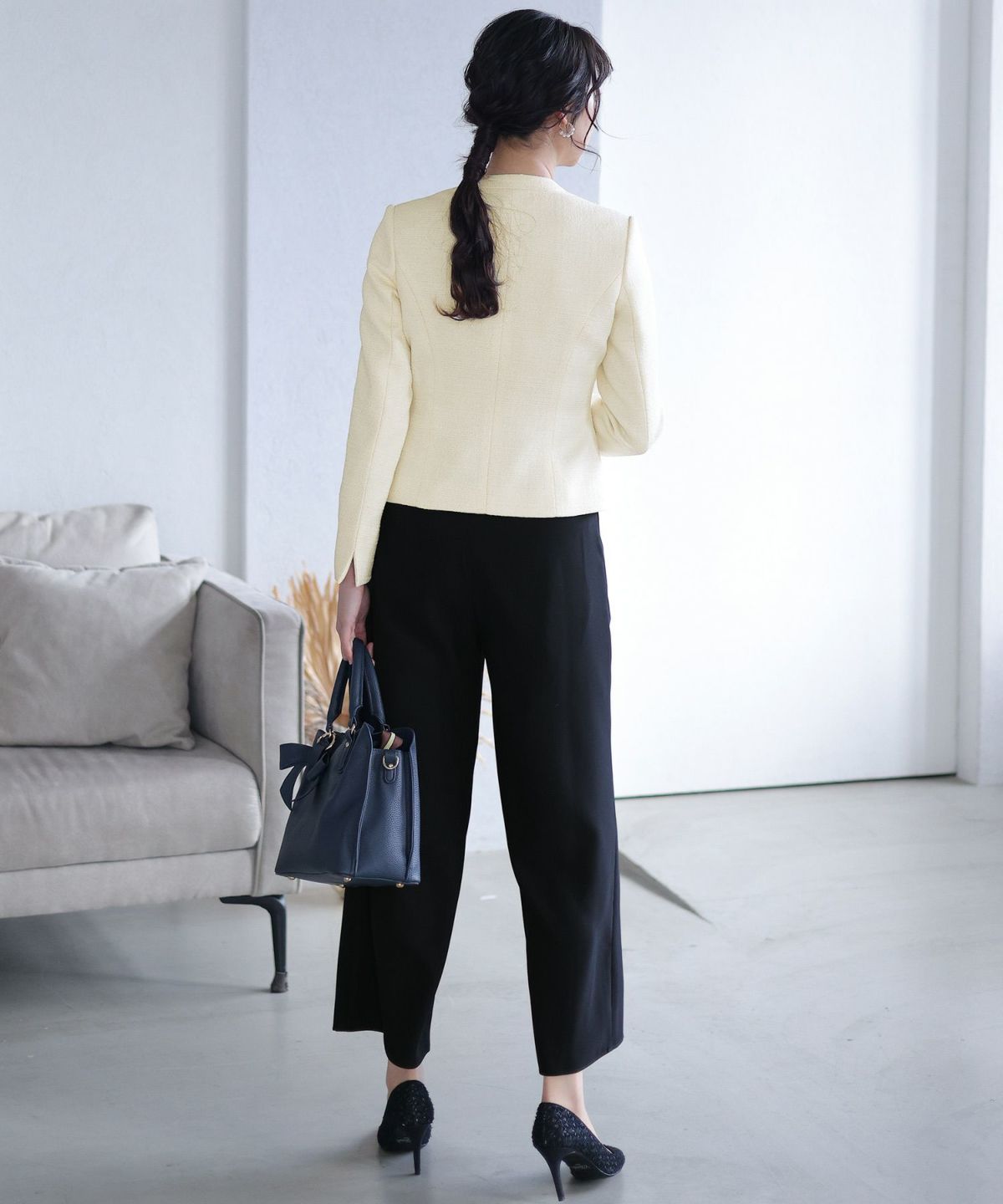 オフの日やカジュアルなイベントには、リラックス感のあるスーツがおすすめです。軽やかな素材と明るいカラーで、柔らかい雰囲気をプラス。