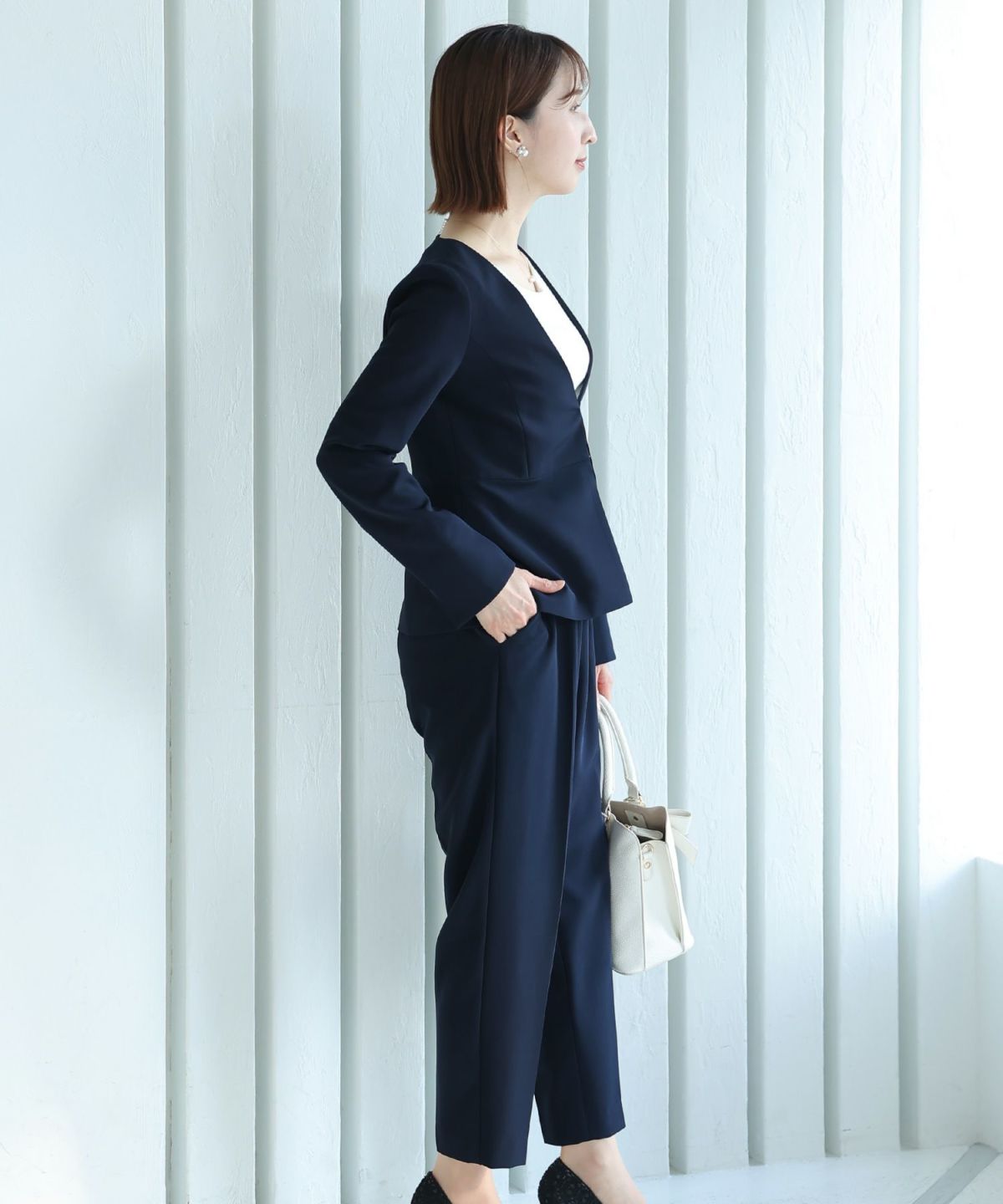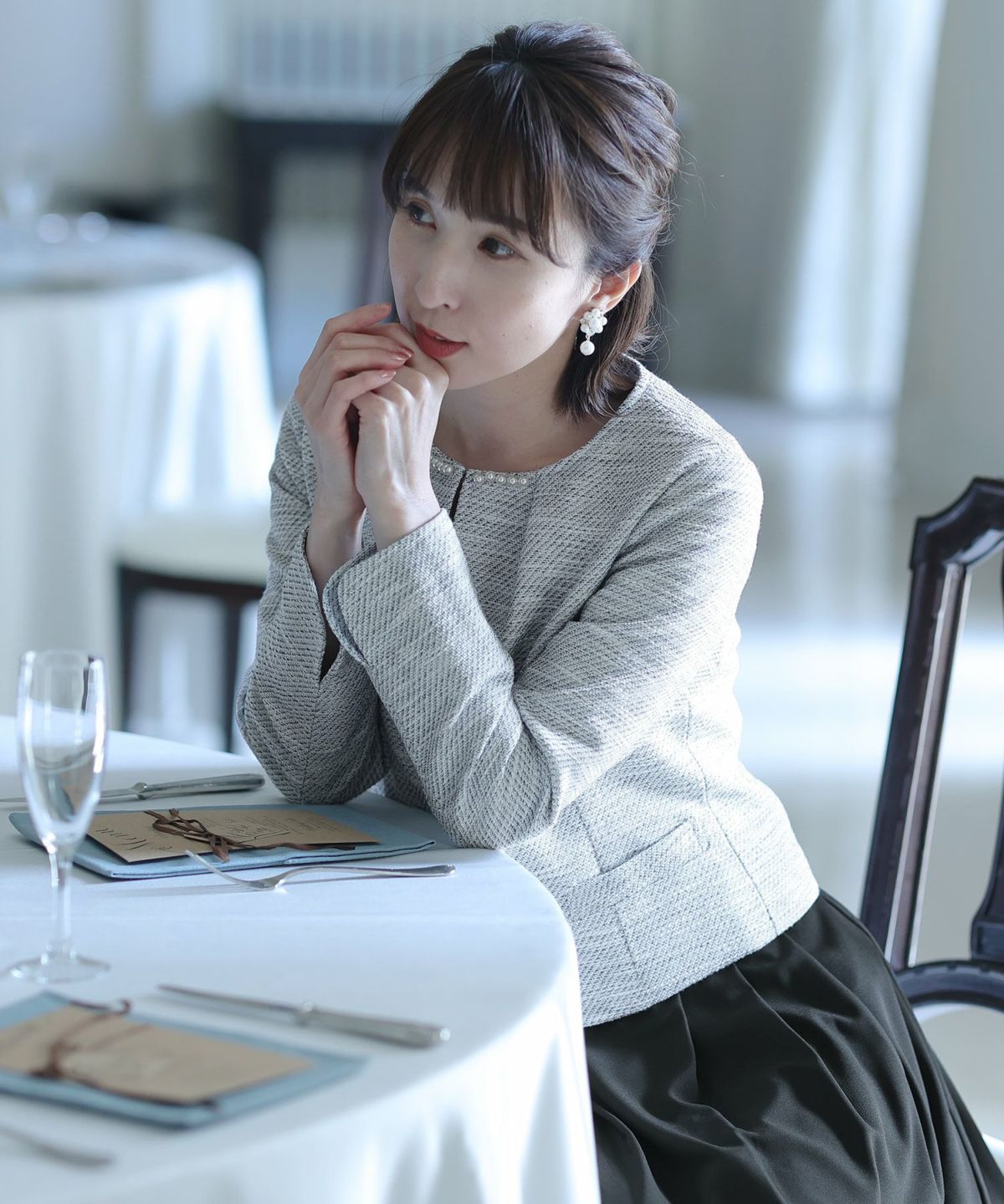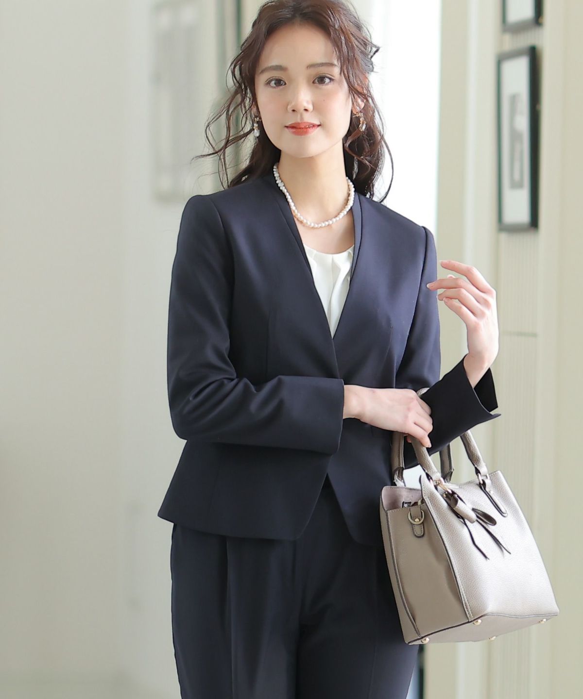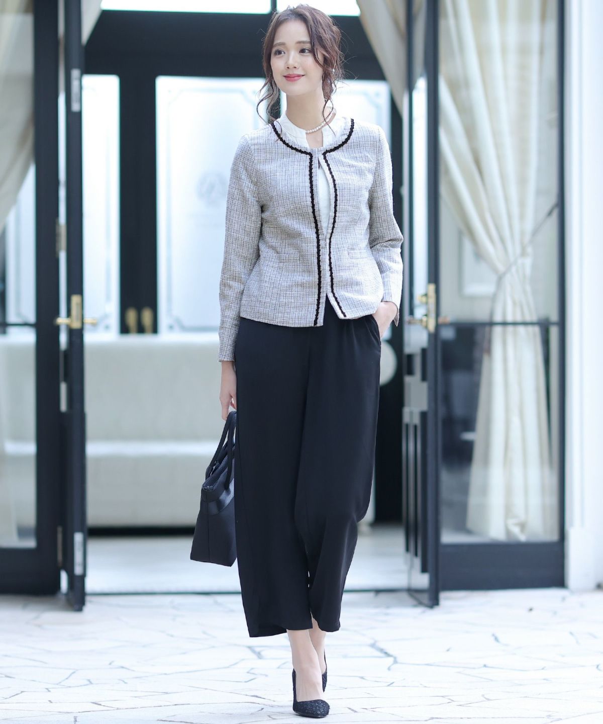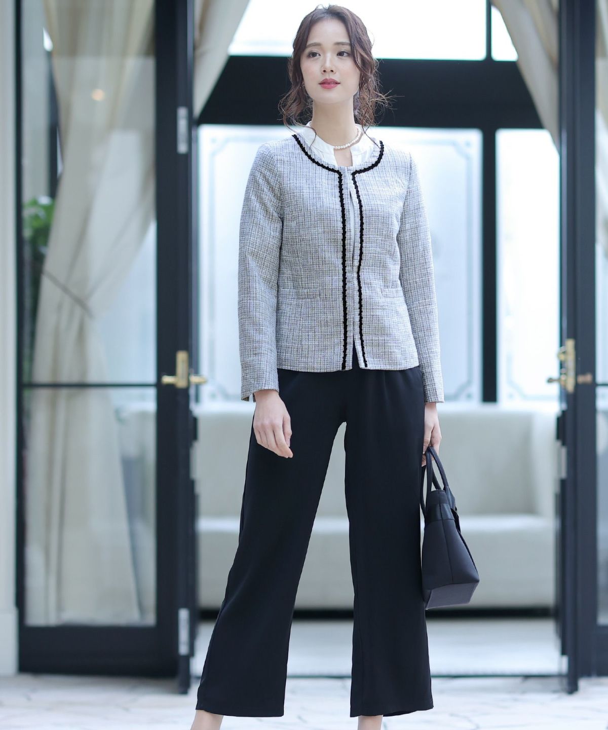 オフの日やカジュアルなイベントには、リラックス感のあるスーツがおすすめです。軽やかな素材と明るいカラーで、柔らかい雰囲気をプラス。
