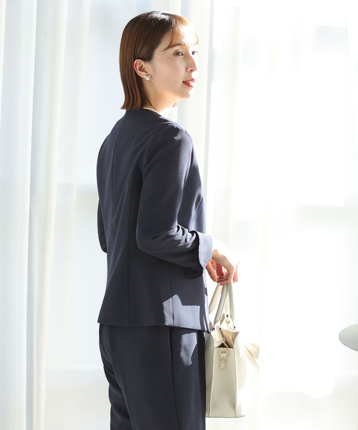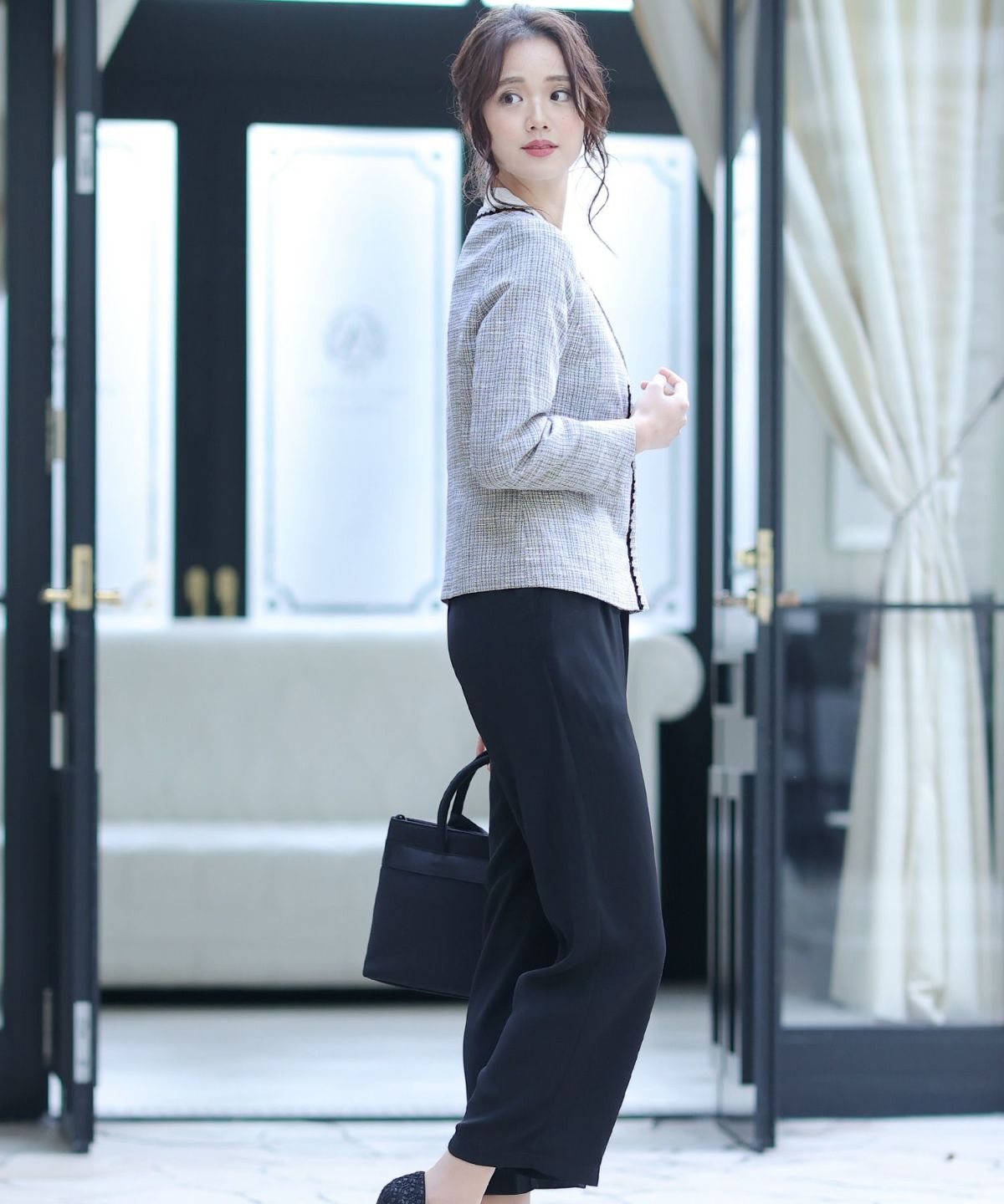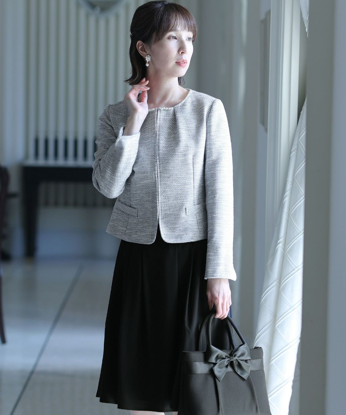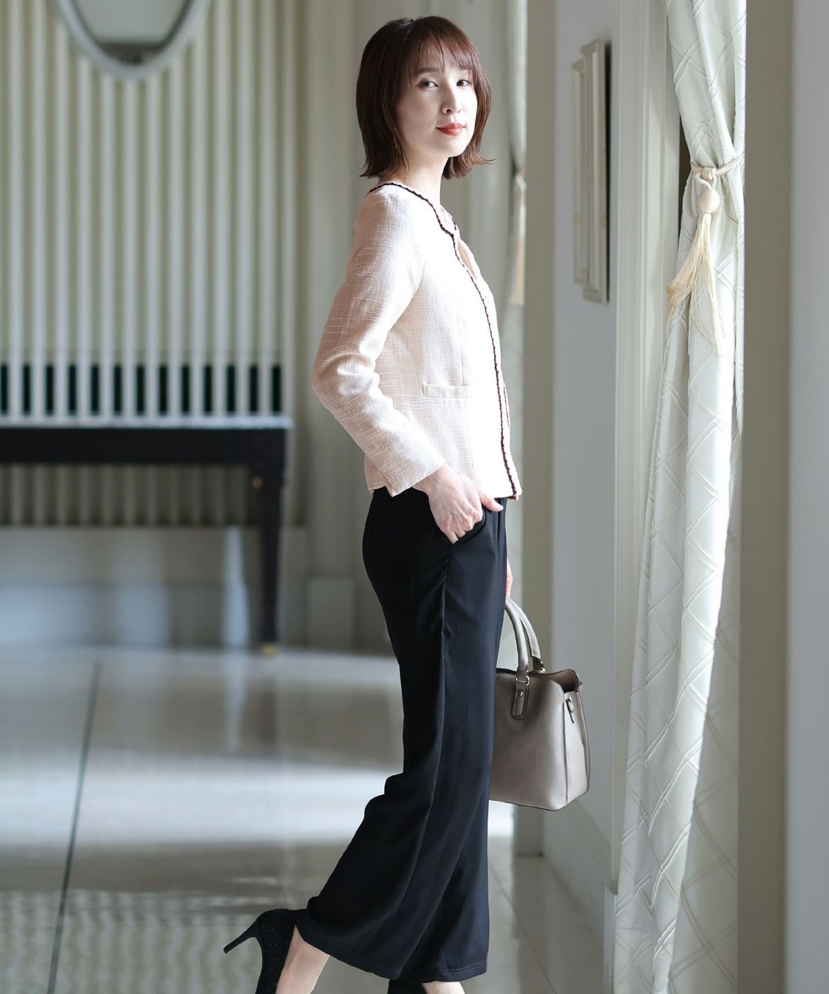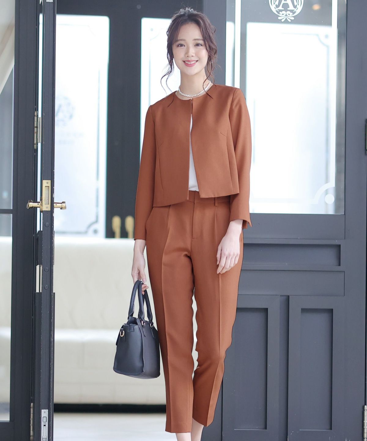 オフの日やカジュアルなイベントには、リラックス感のあるスーツがおすすめです。軽やかな素材と明るいカラーで、柔らかい雰囲気をプラス。