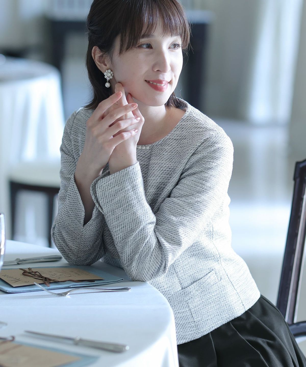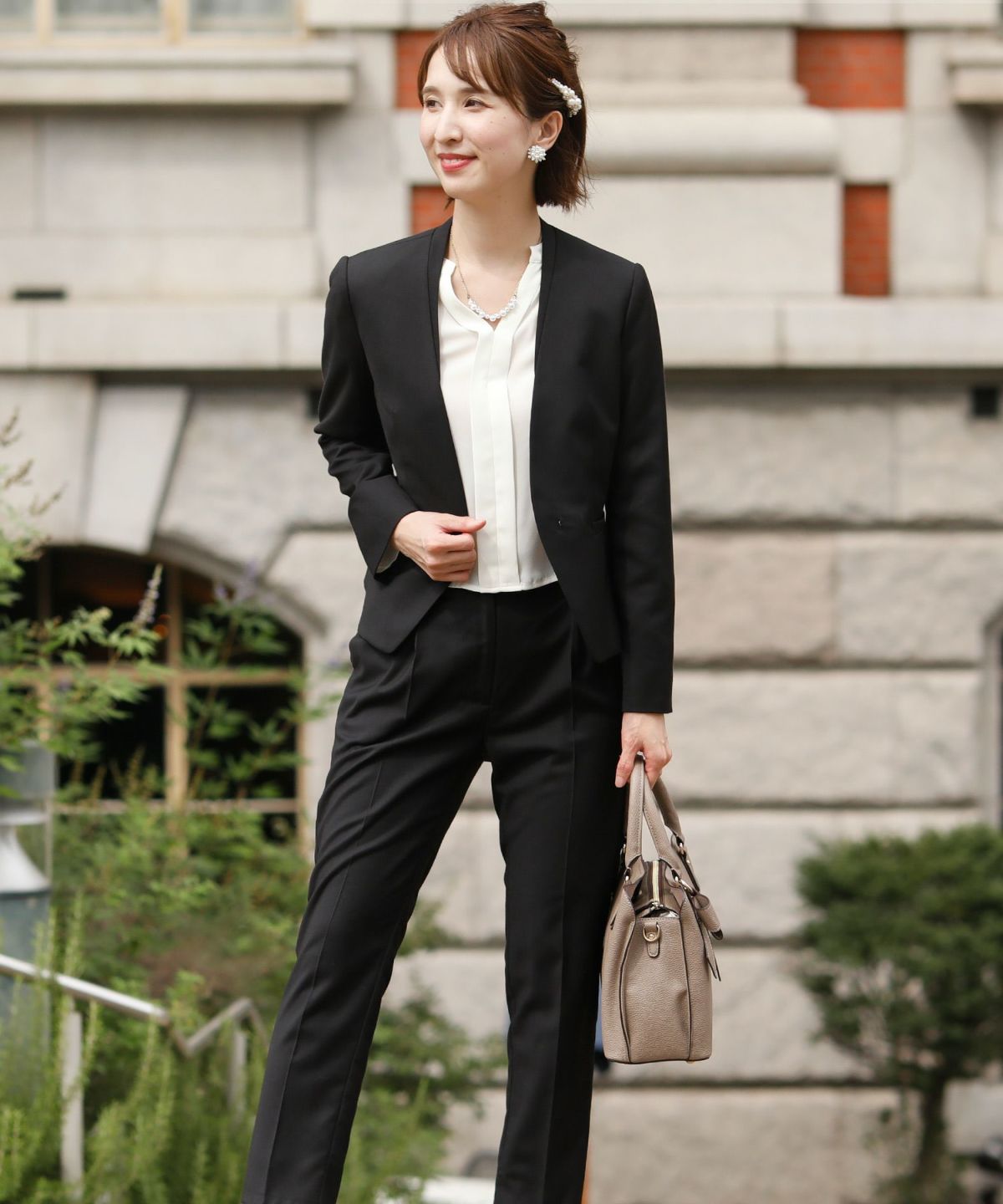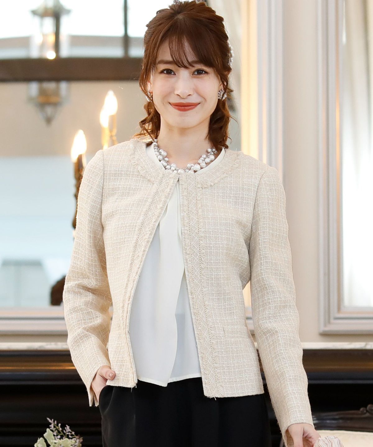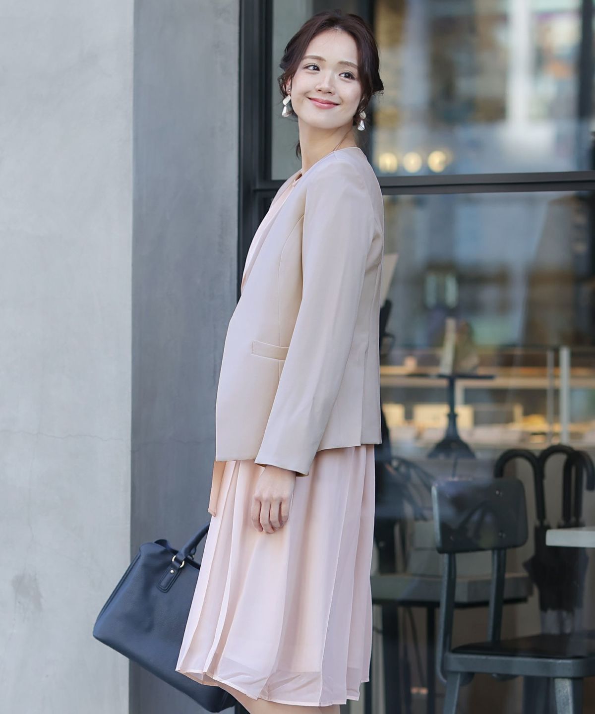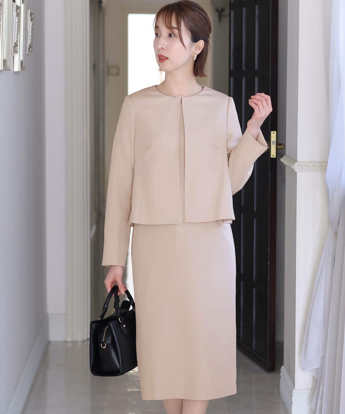 オフの日やカジュアルなイベントには、リラックス感のあるスーツがおすすめです。軽やかな素材と明るいカラーで、柔らかい雰囲気をプラス。
