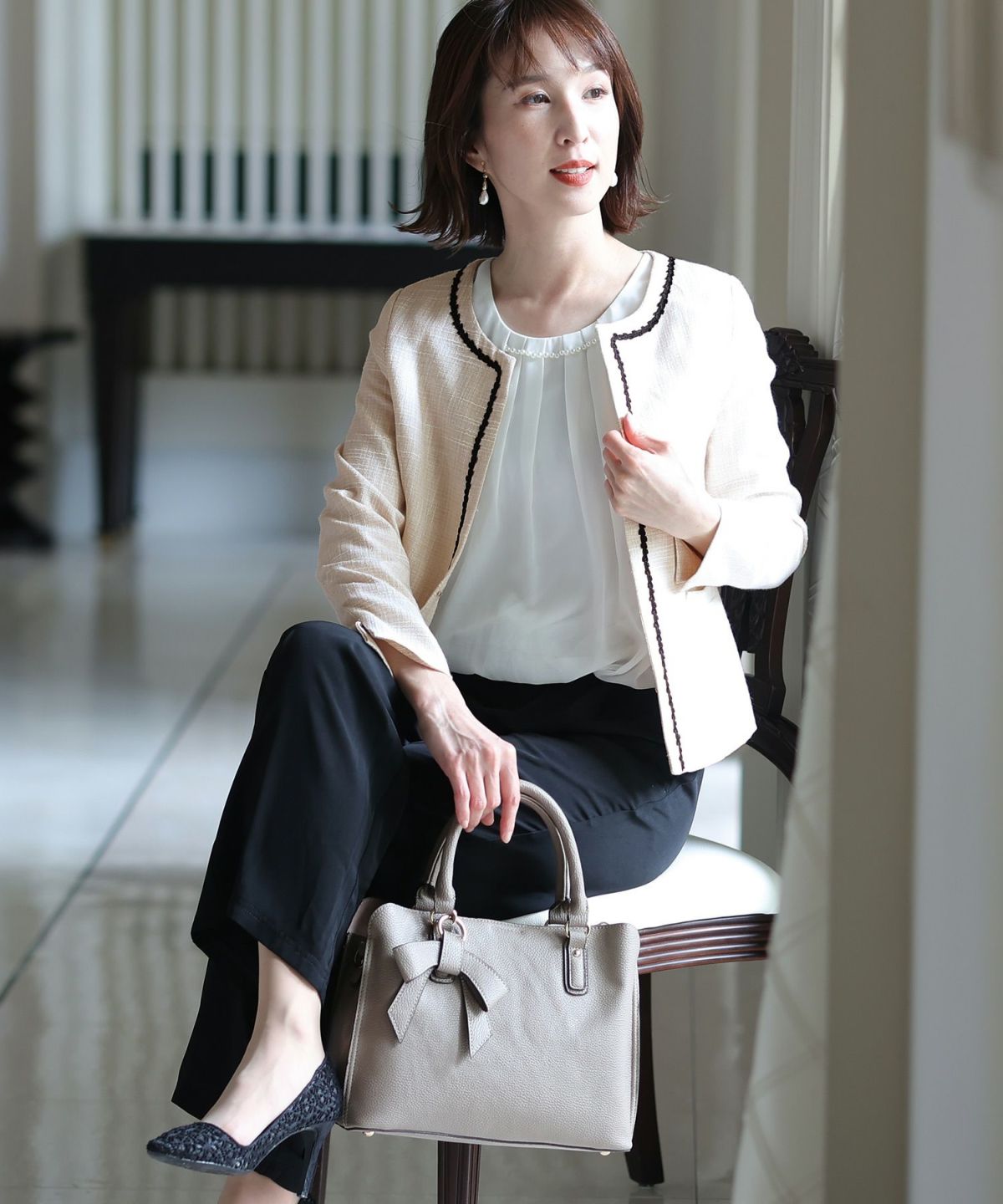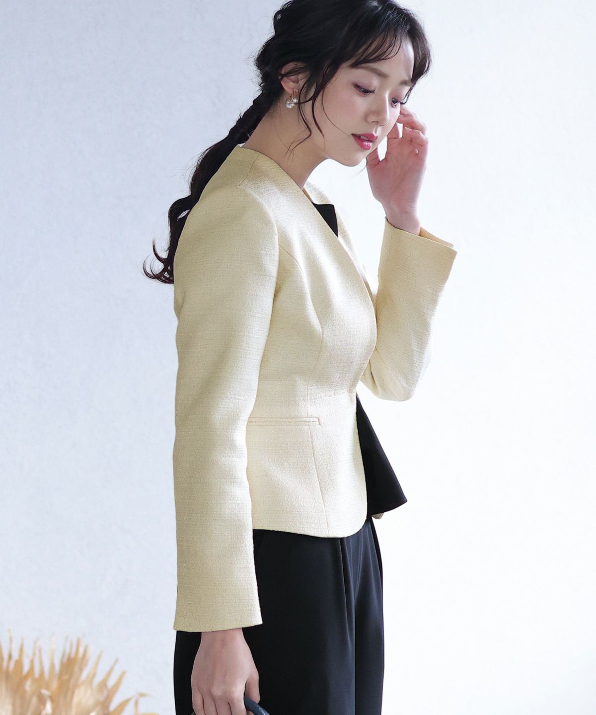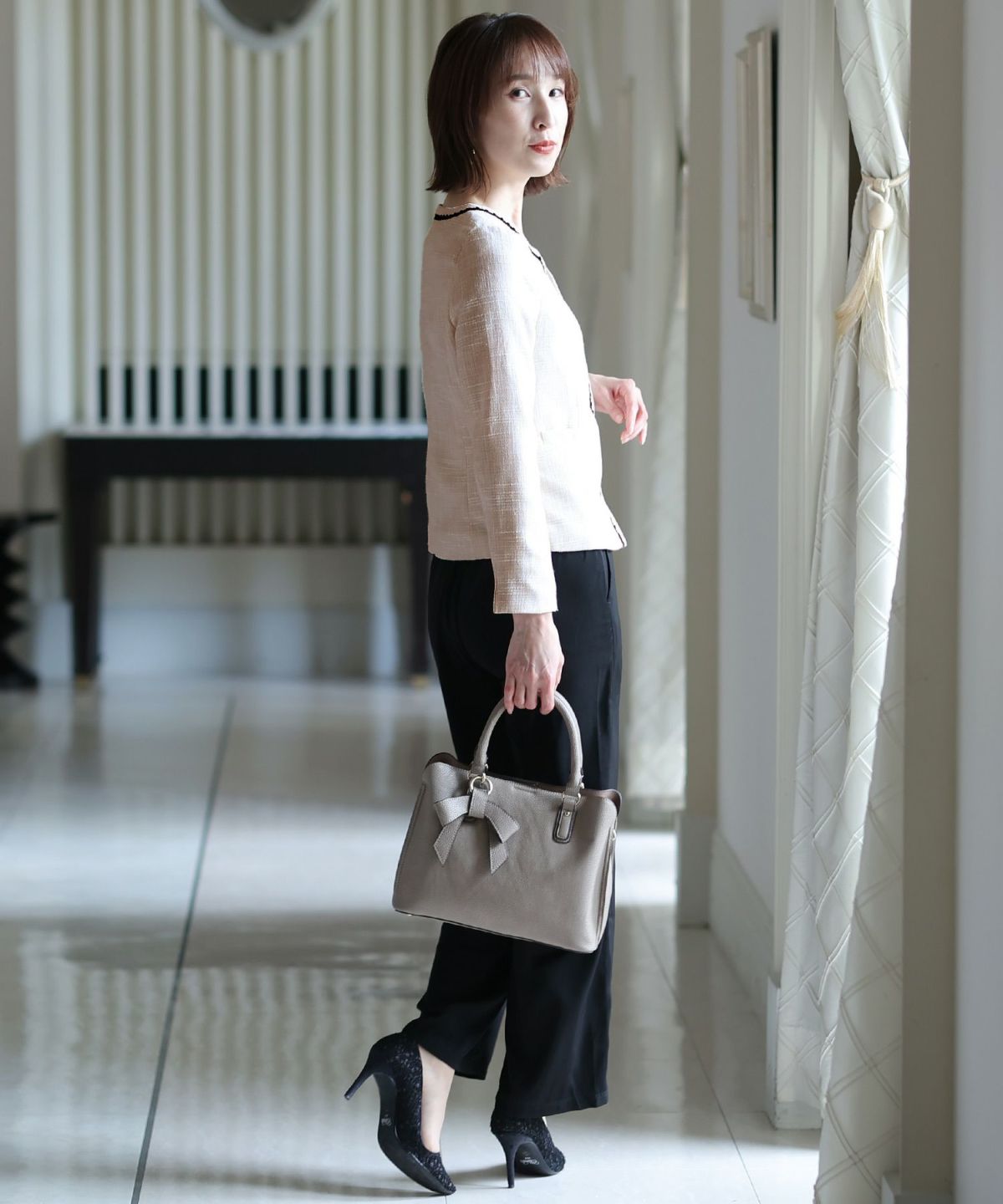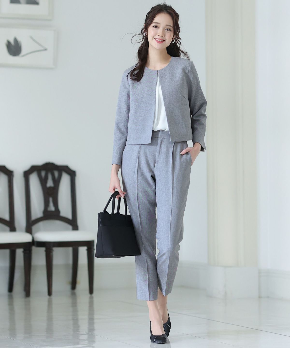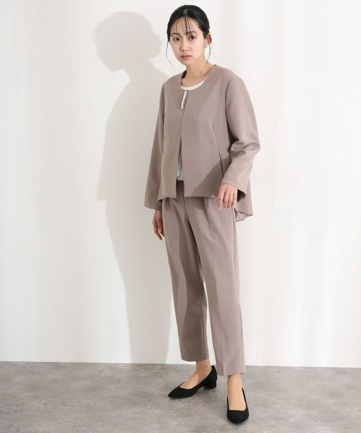 オフの日やカジュアルなイベントには、リラックス感のあるスーツがおすすめです。軽やかな素材と明るいカラーで、柔らかい雰囲気をプラス。
