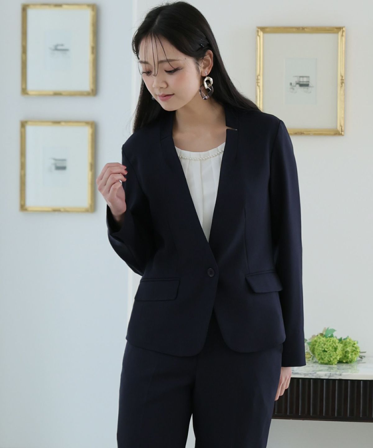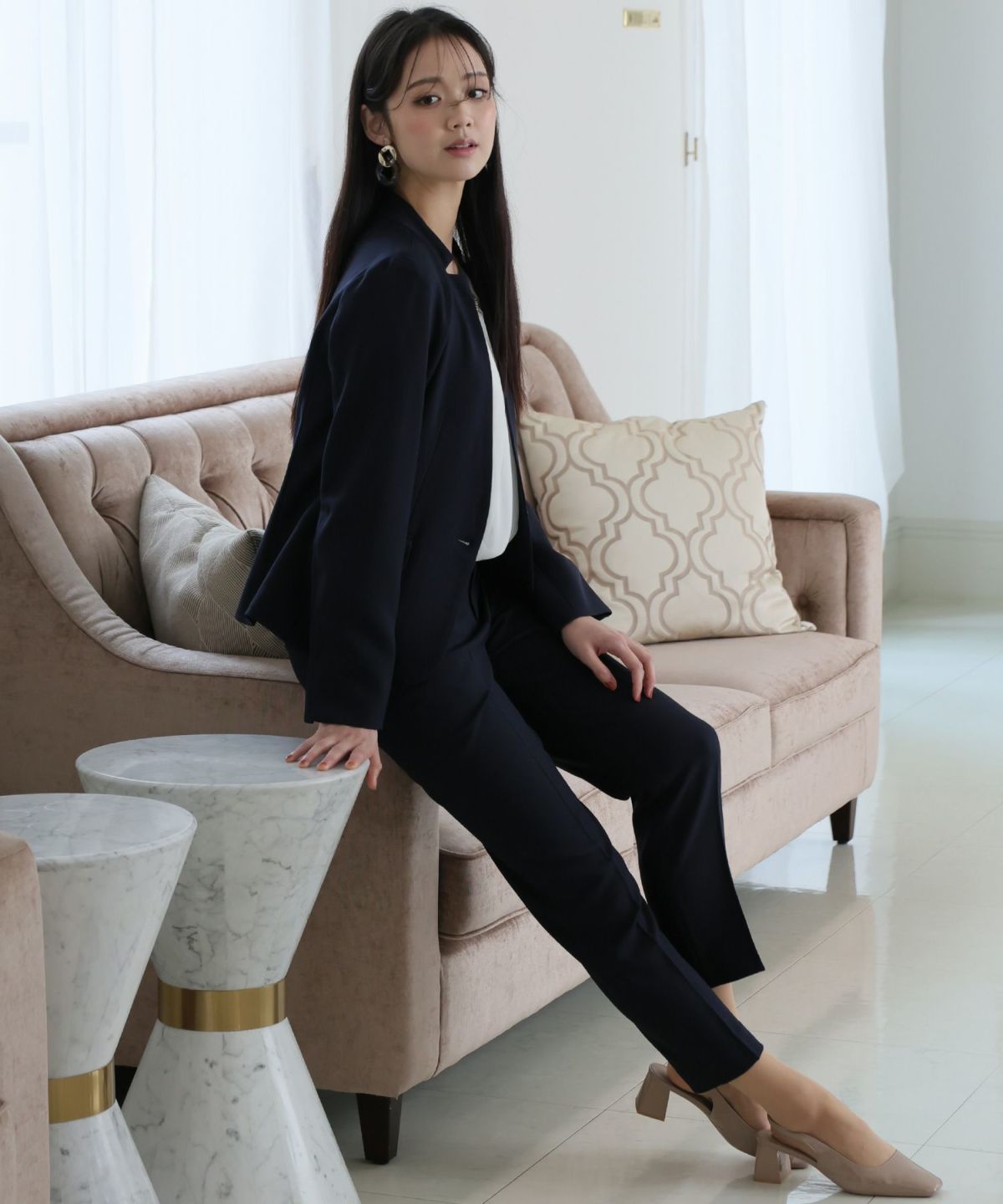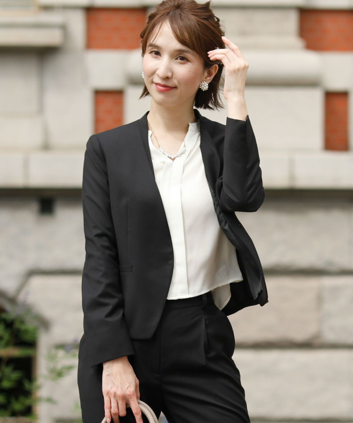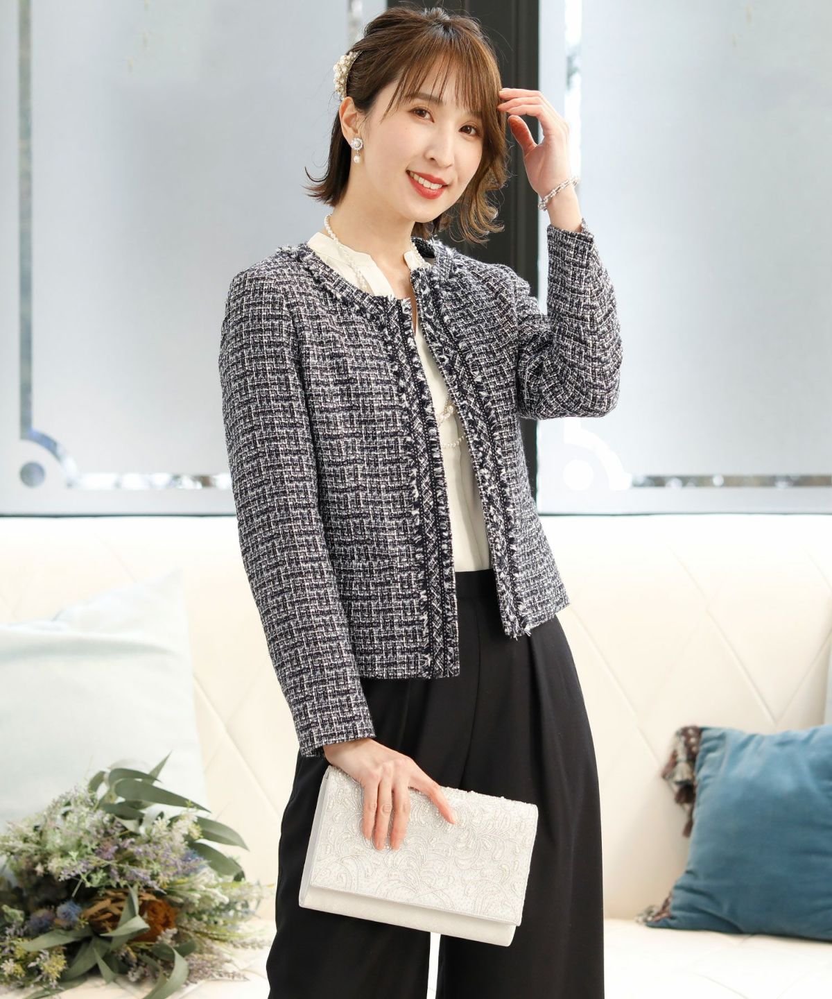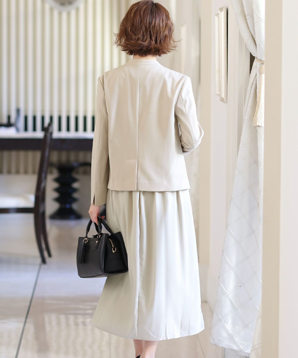 オフの日やカジュアルなイベントには、リラックス感のあるスーツがおすすめです。軽やかな素材と明るいカラーで、柔らかい雰囲気をプラス。