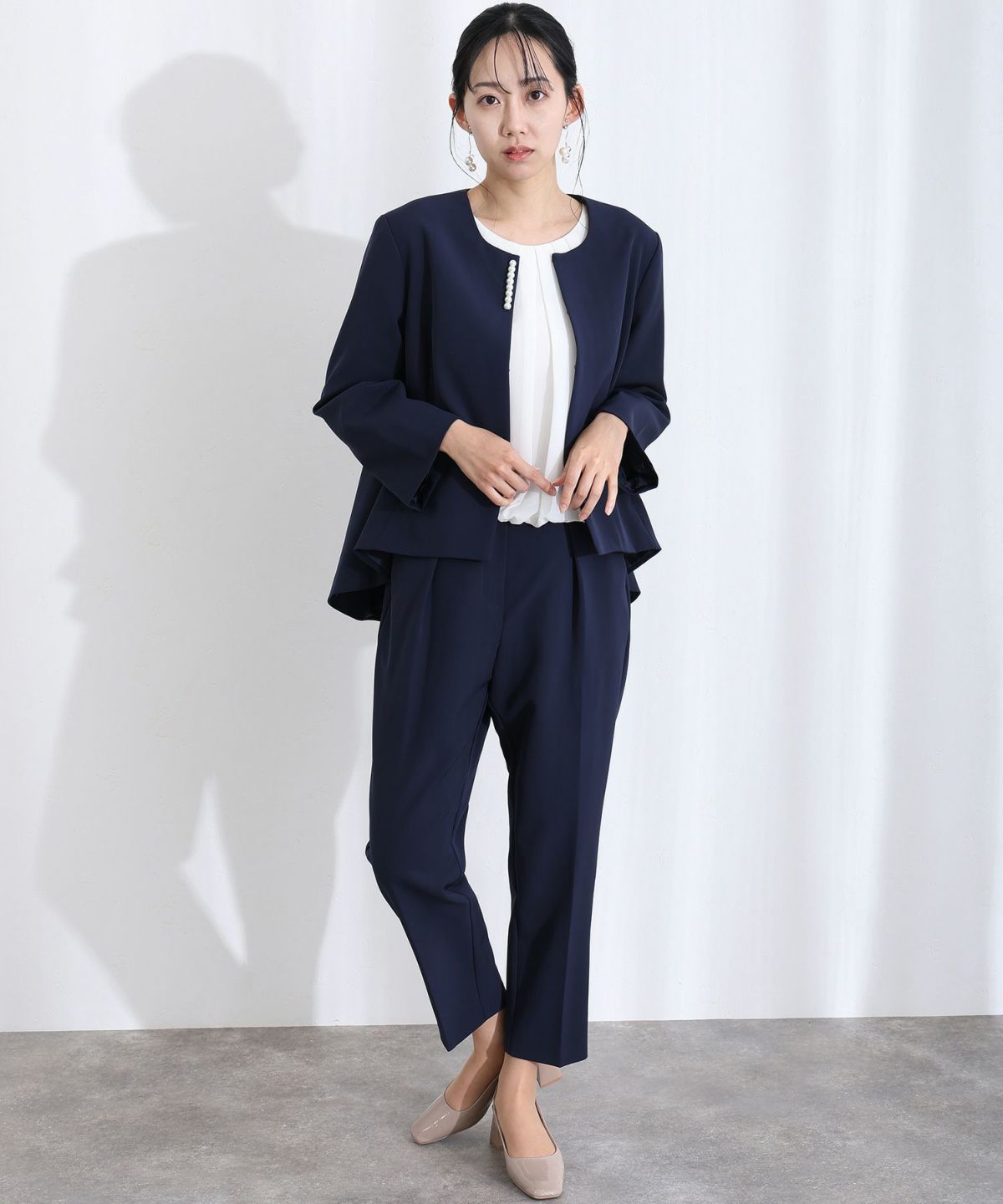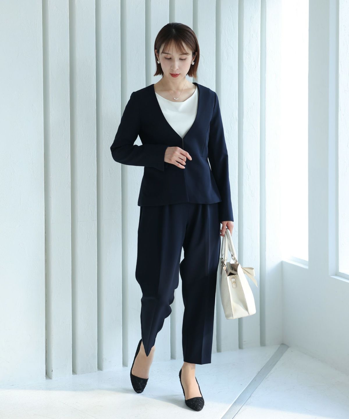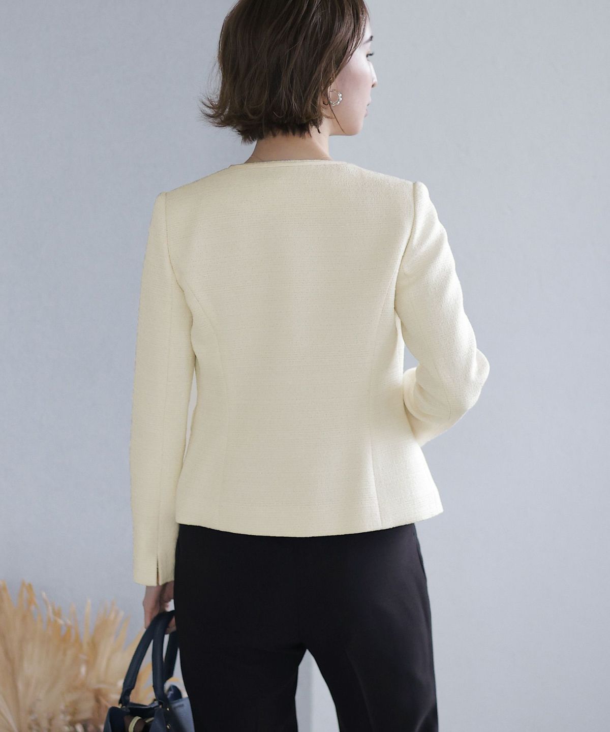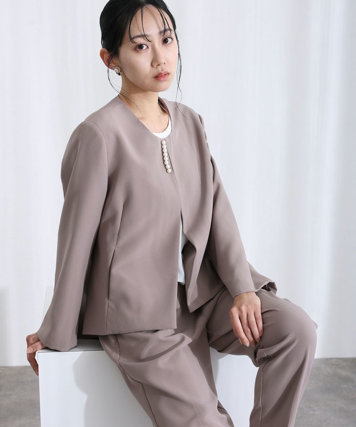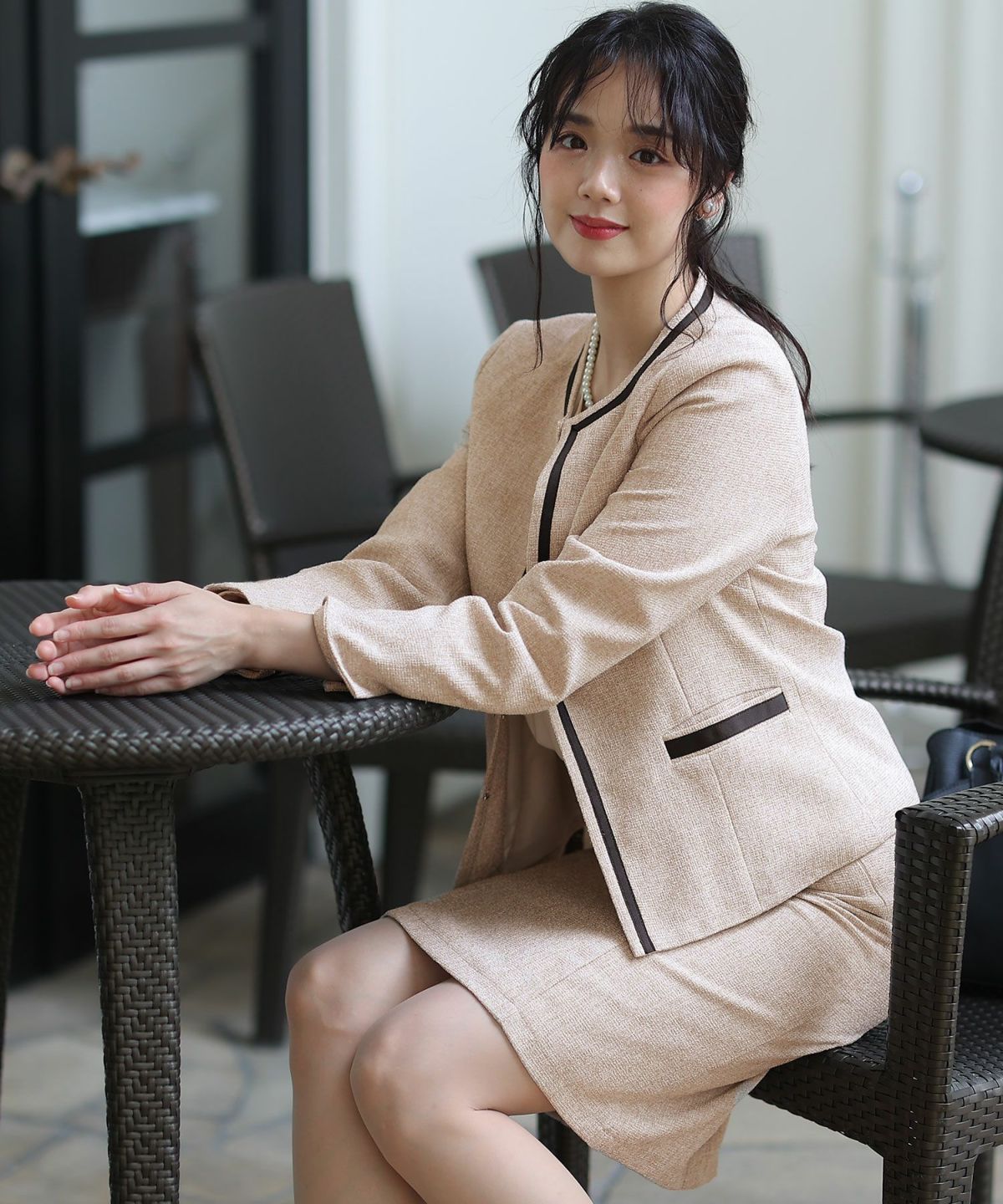 オフの日やカジュアルなイベントには、リラックス感のあるスーツがおすすめです。軽やかな素材と明るいカラーで、柔らかい雰囲気をプラス。