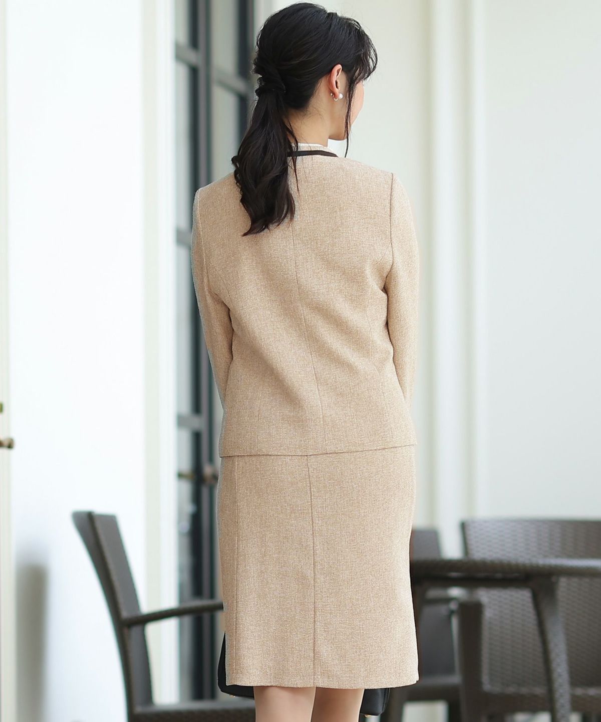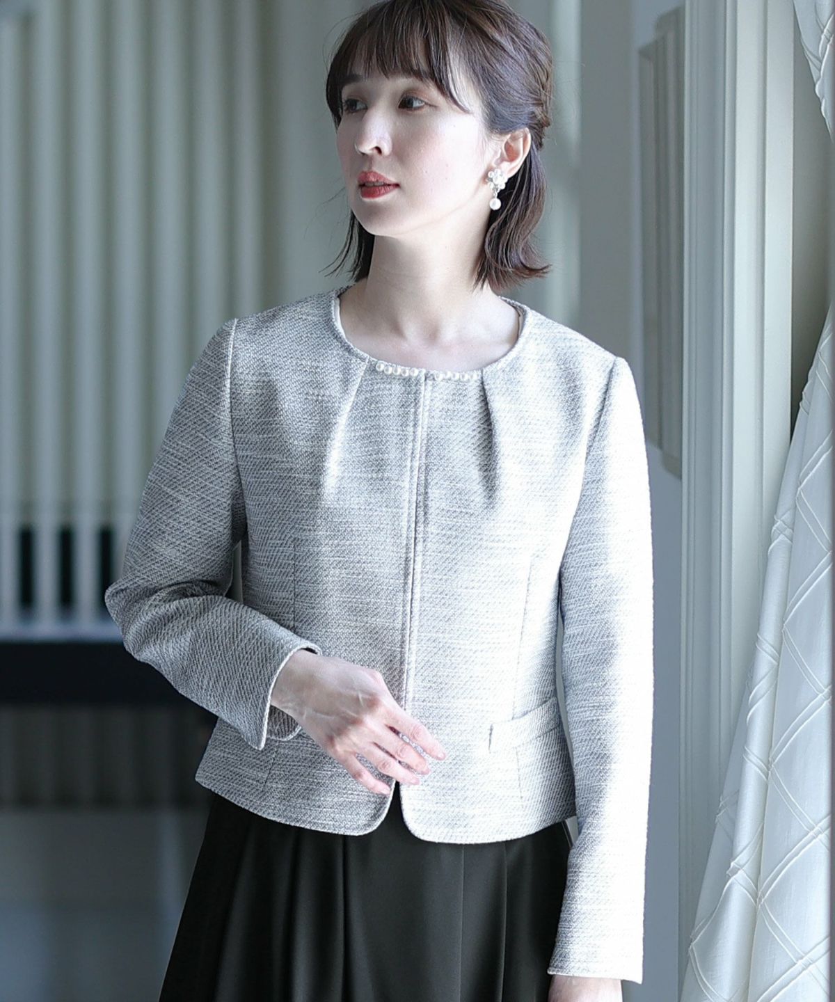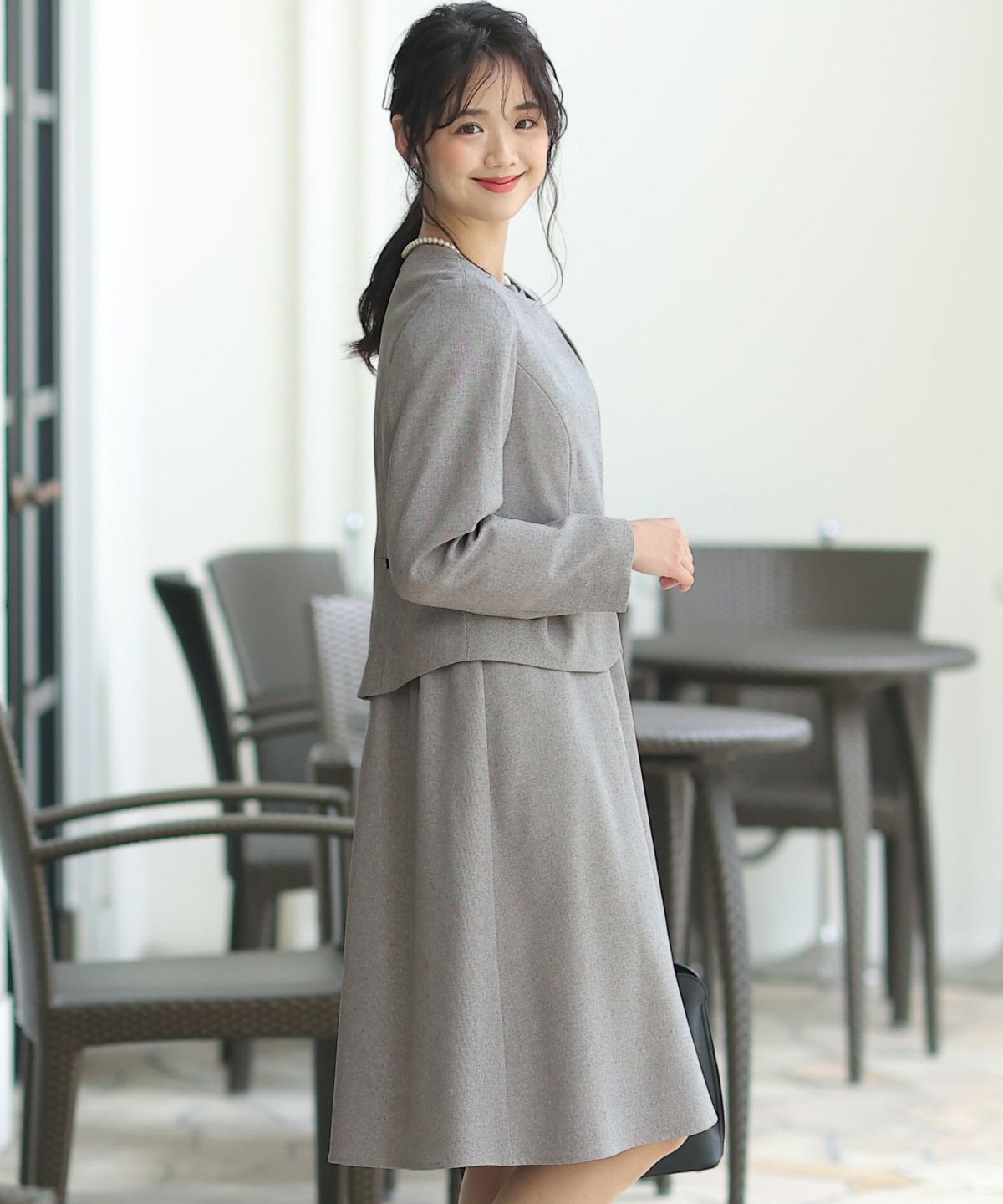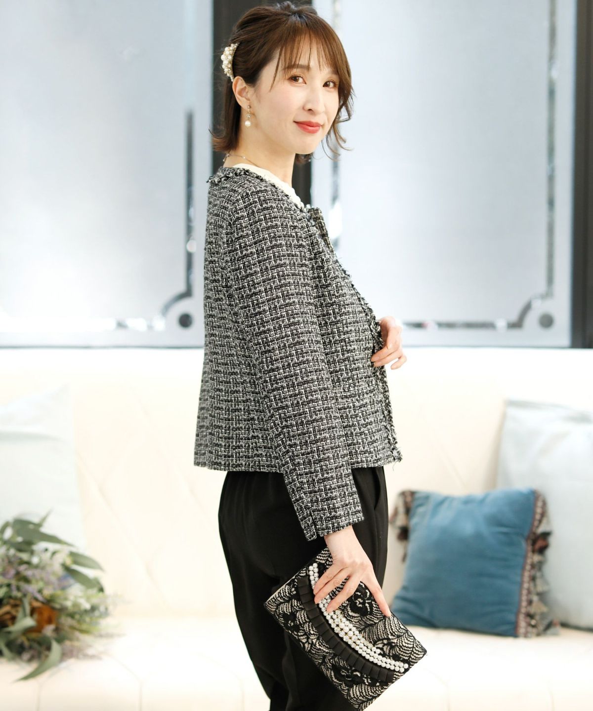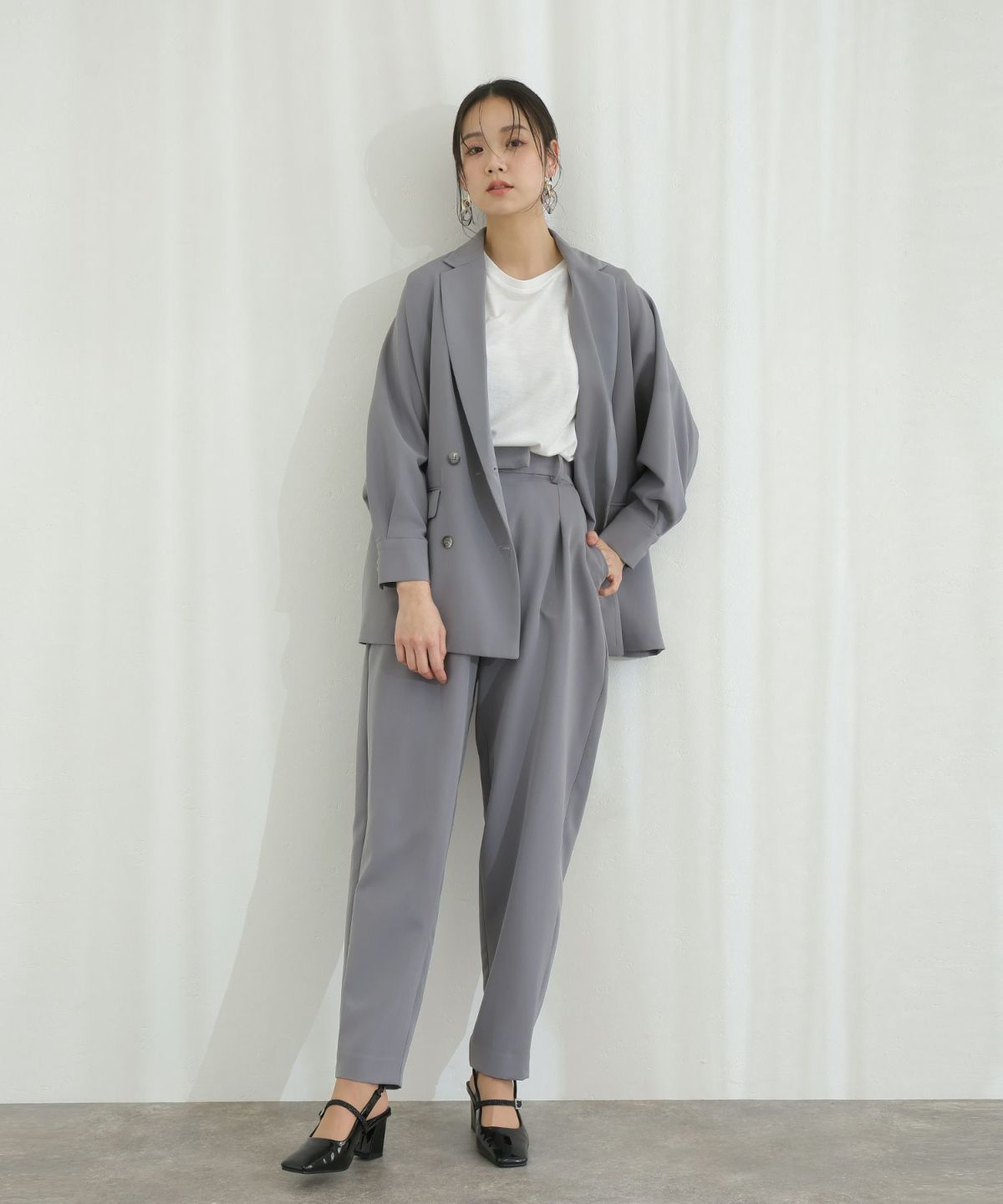 オフの日やカジュアルなイベントには、リラックス感のあるスーツがおすすめです。軽やかな素材と明るいカラーで、柔らかい雰囲気をプラス。