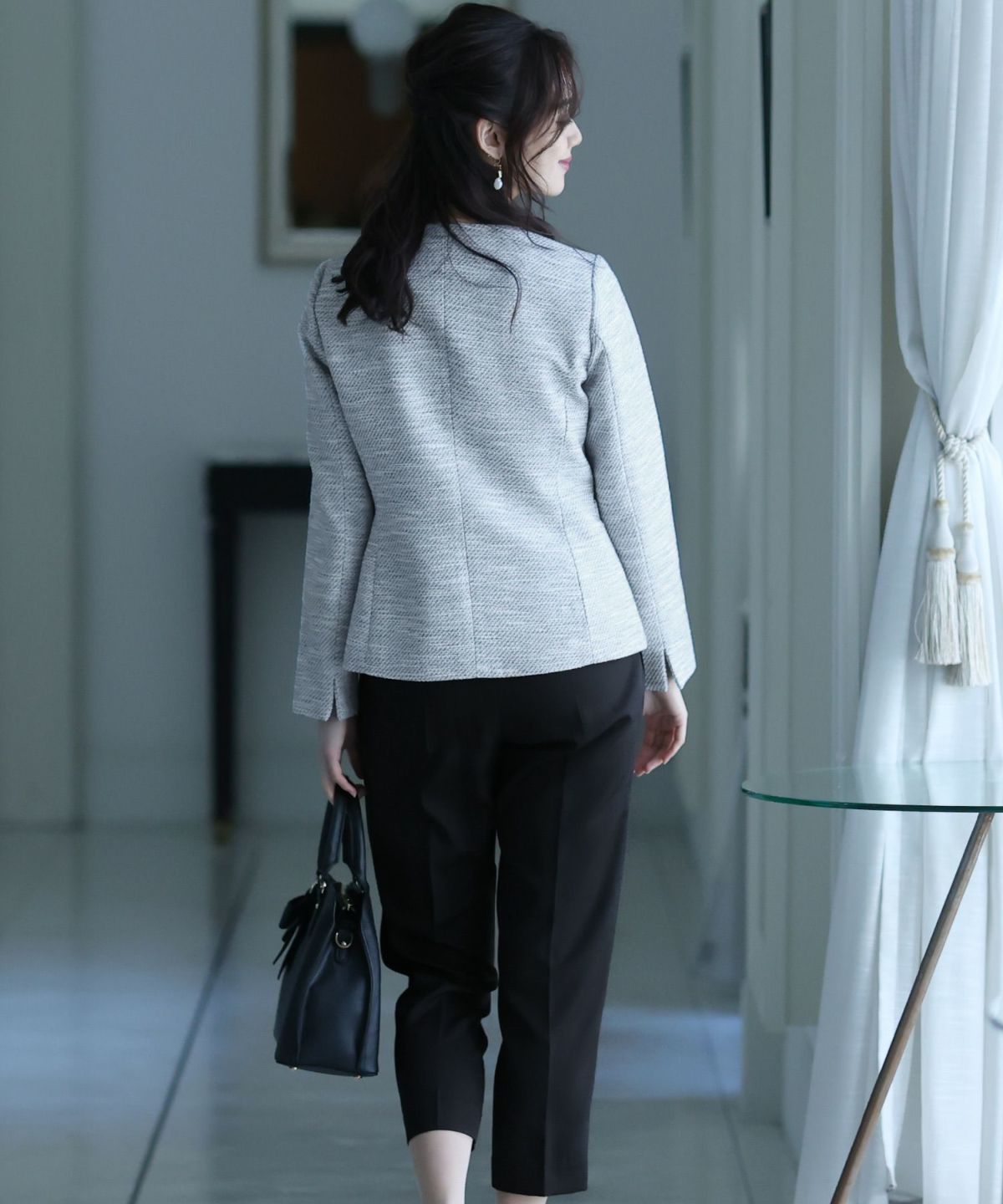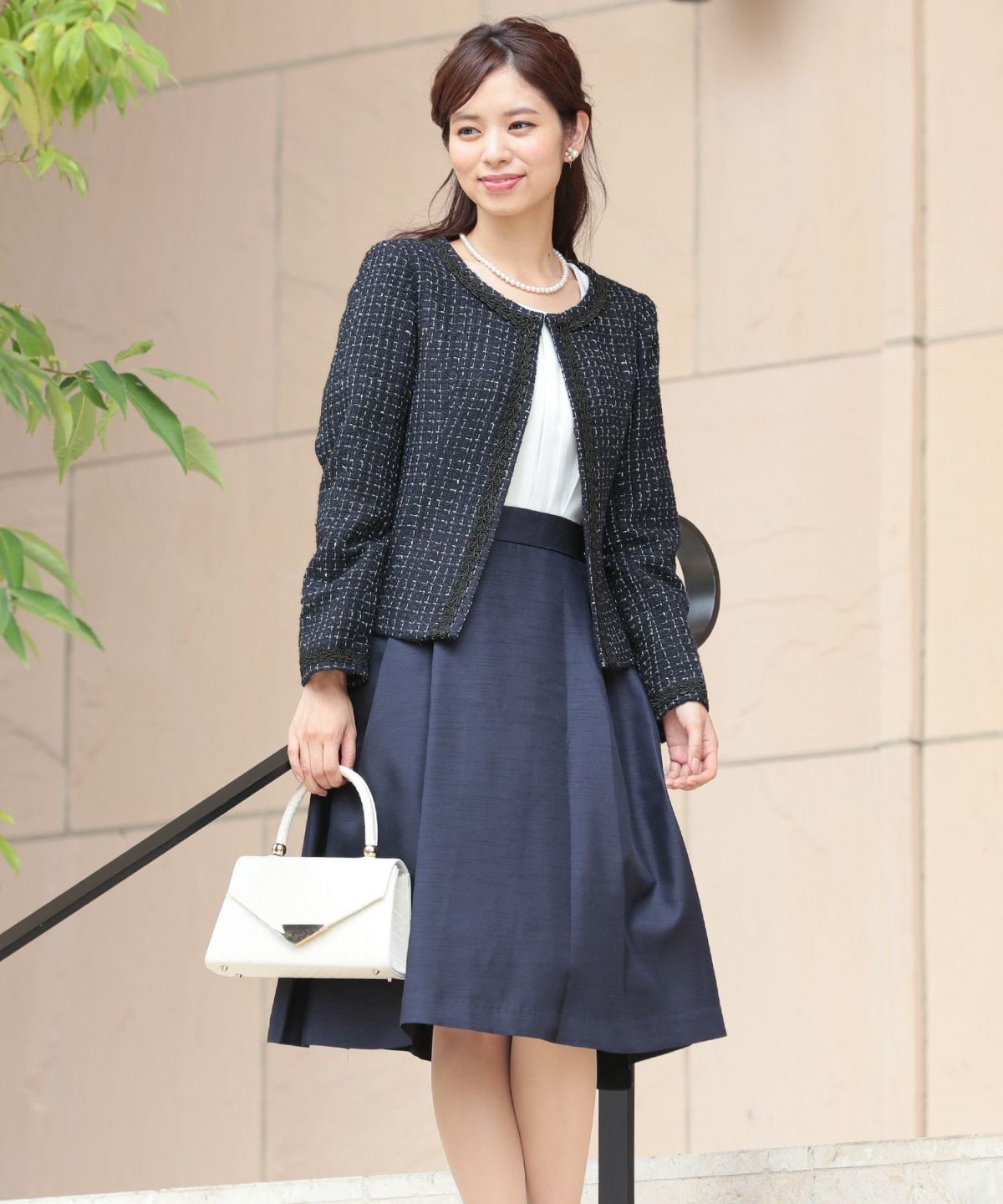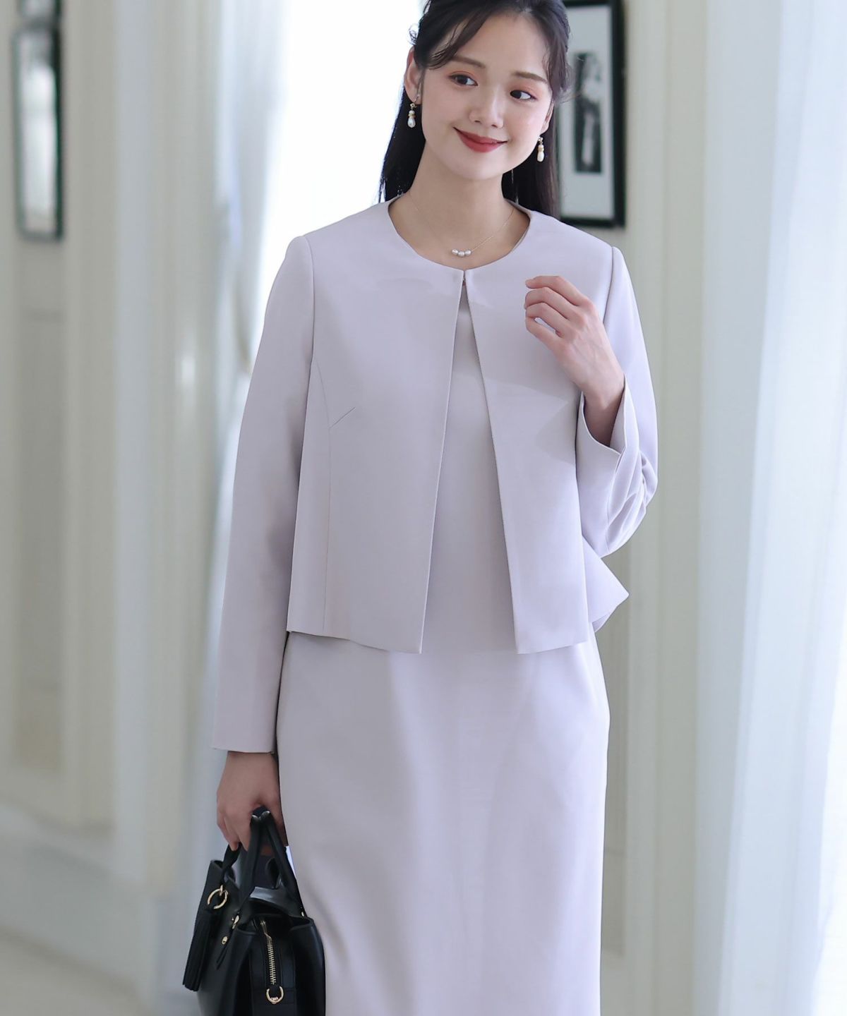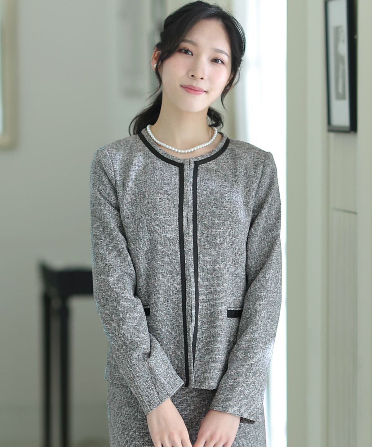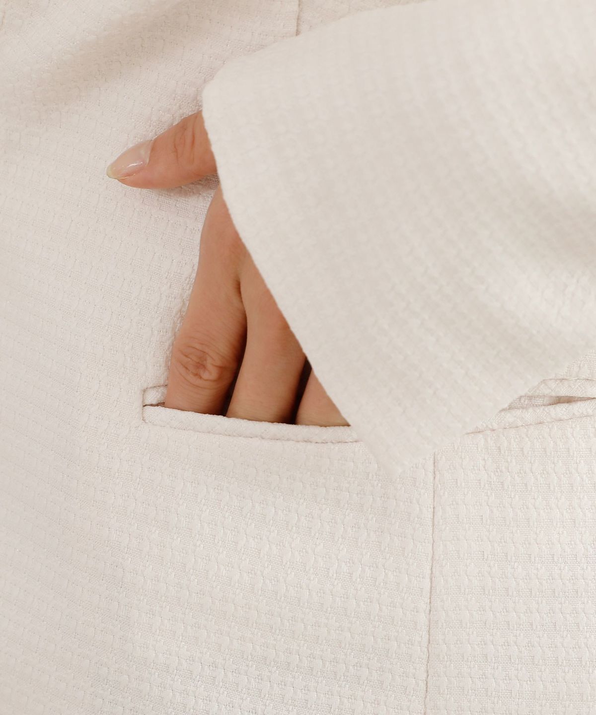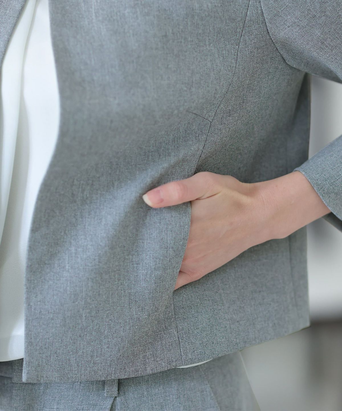 オフの日やカジュアルなイベントには、リラックス感のあるスーツがおすすめです。軽やかな素材と明るいカラーで、柔らかい雰囲気をプラス。