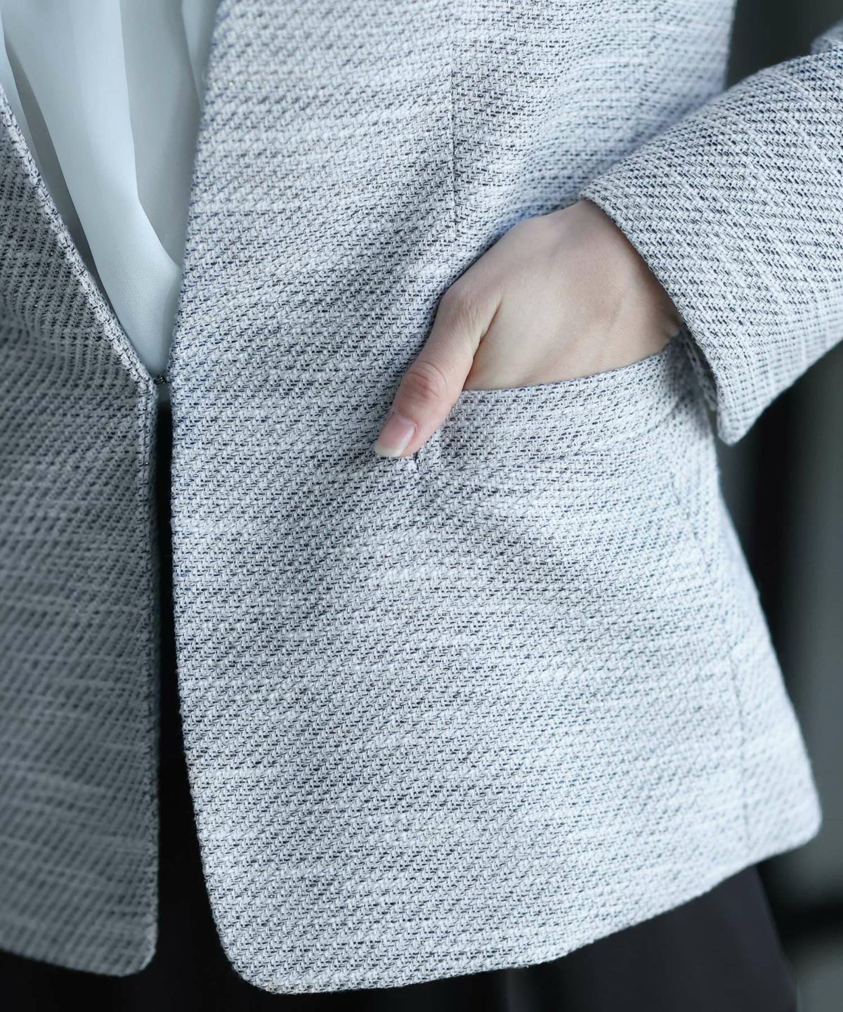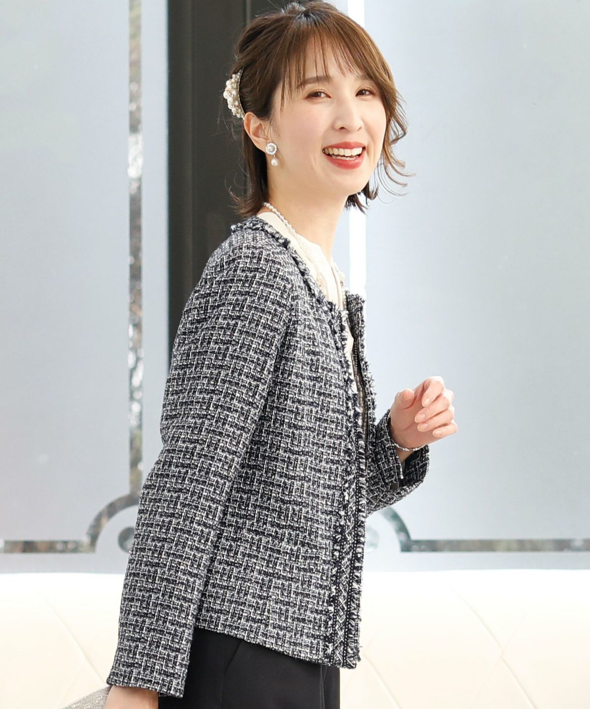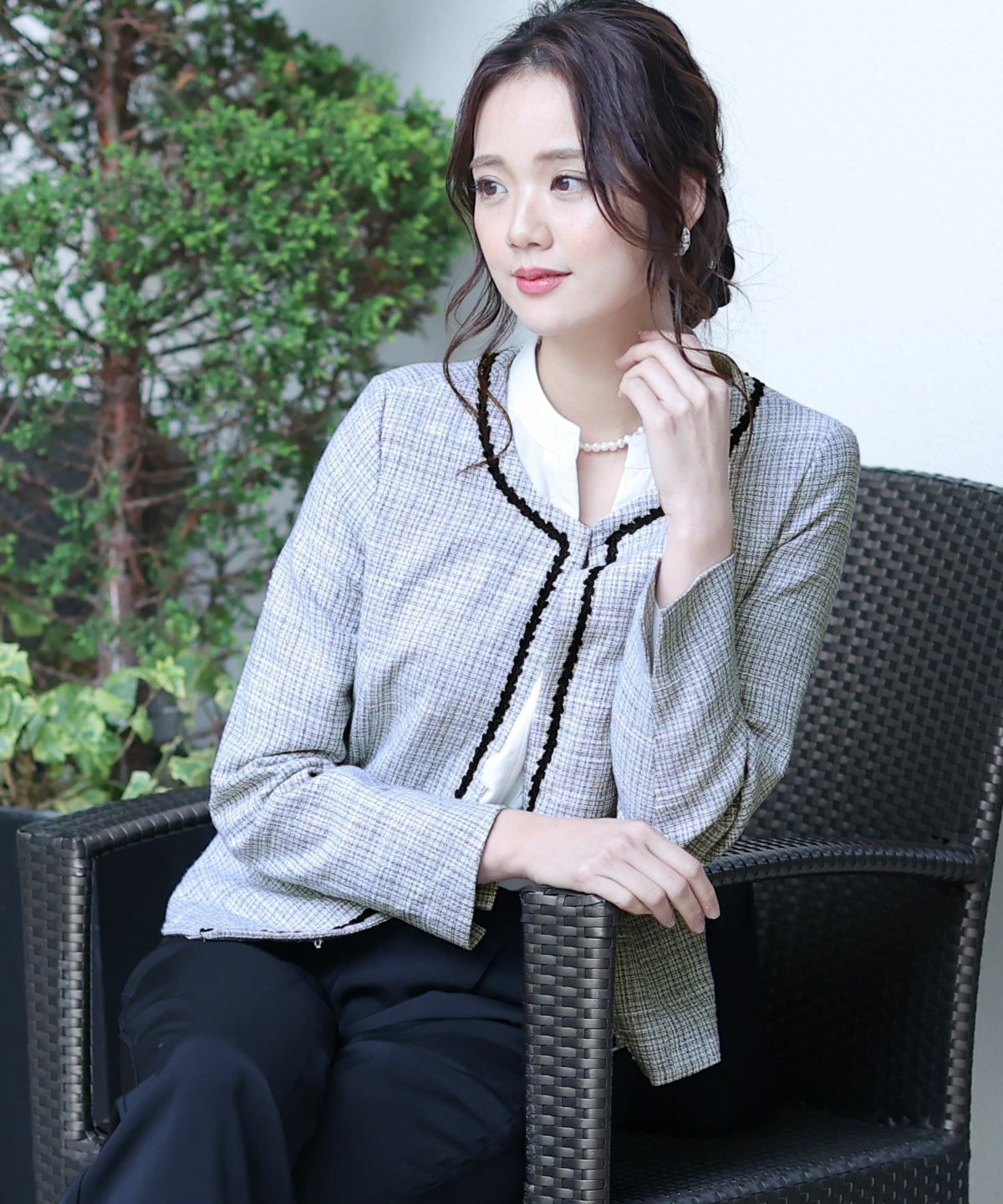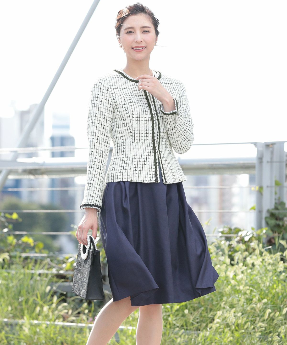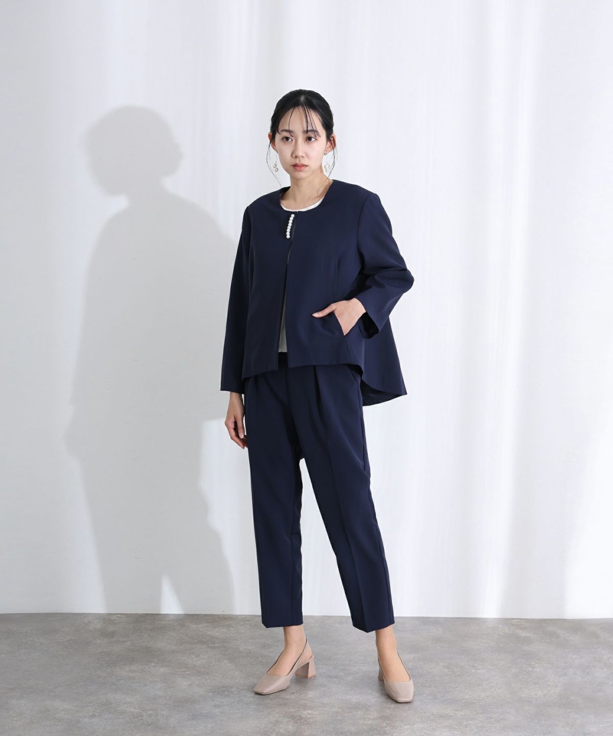 オフの日やカジュアルなイベントには、リラックス感のあるスーツがおすすめです。軽やかな素材と明るいカラーで、柔らかい雰囲気をプラス。