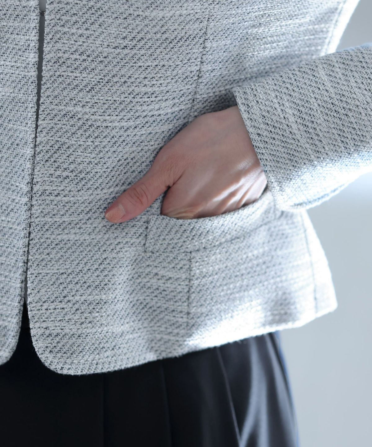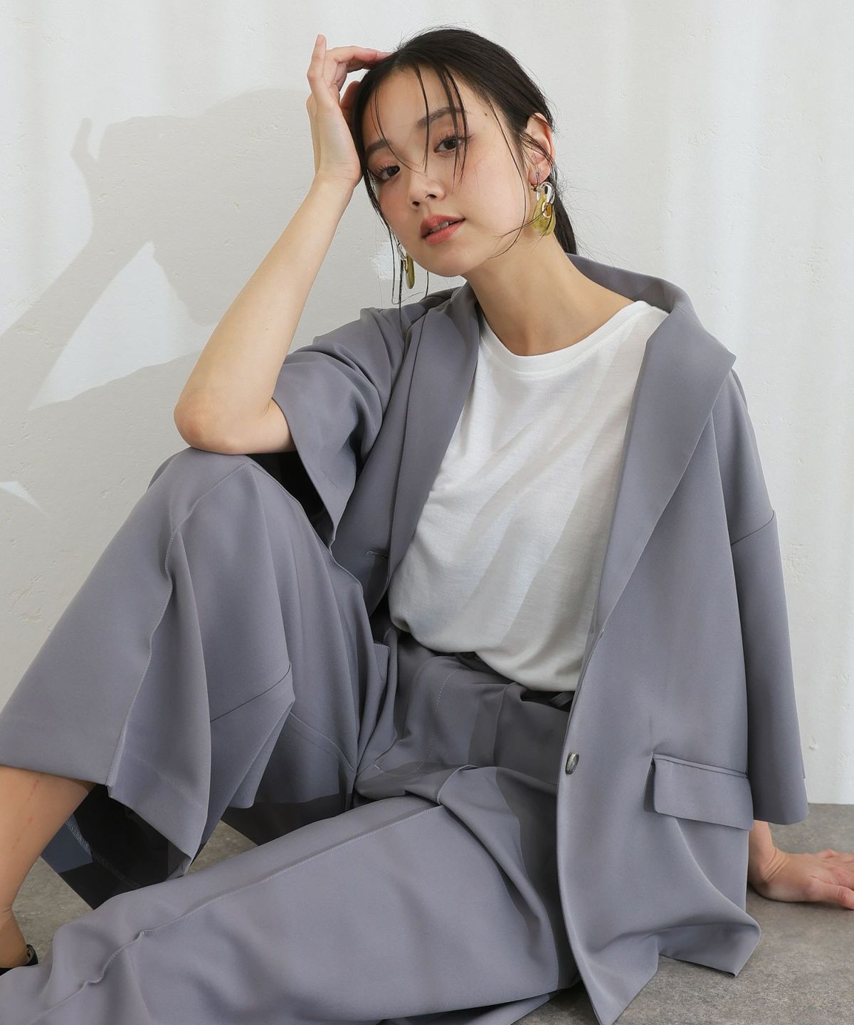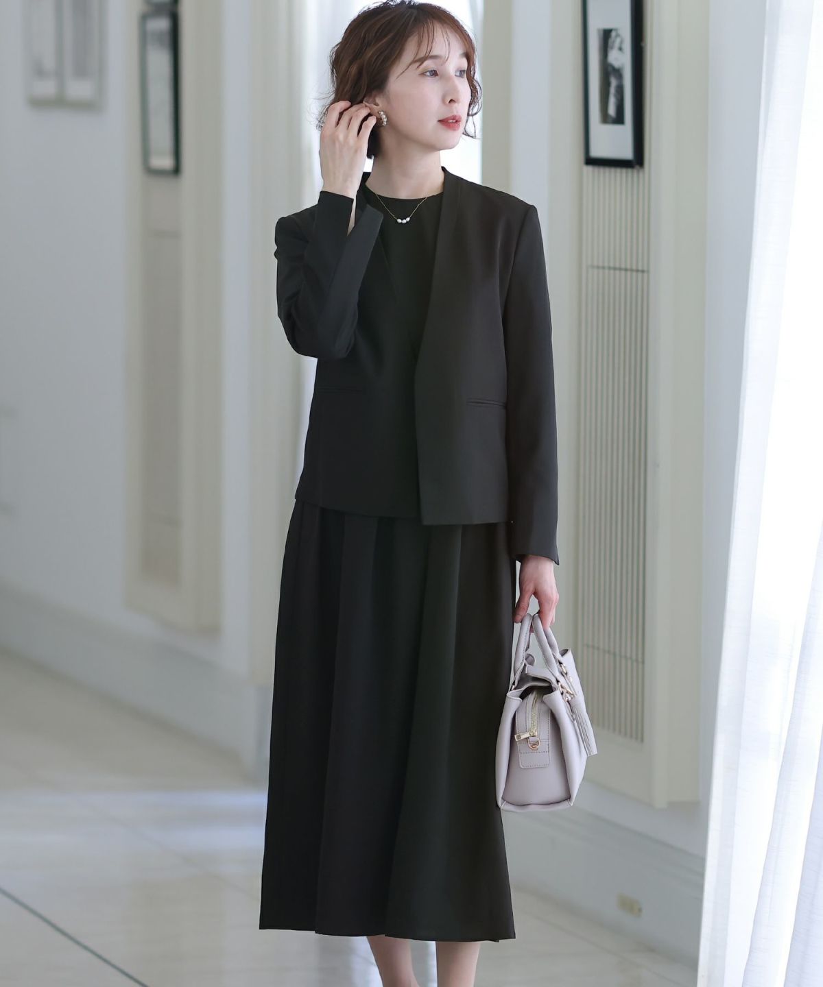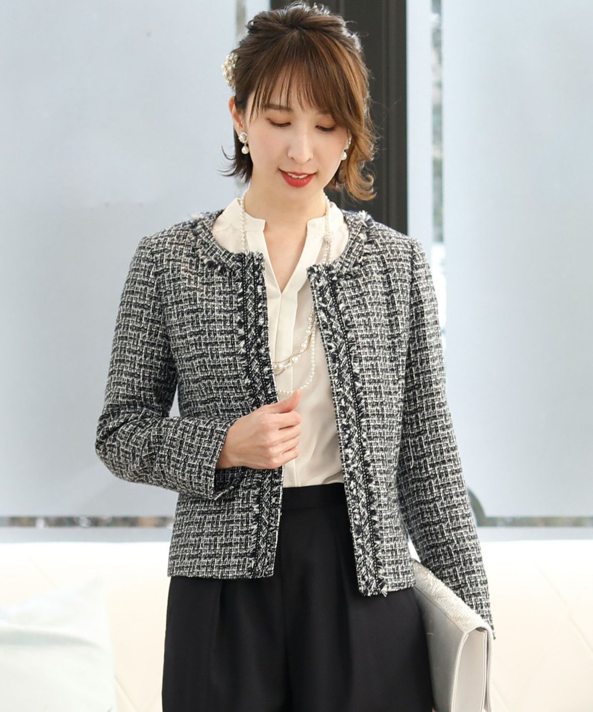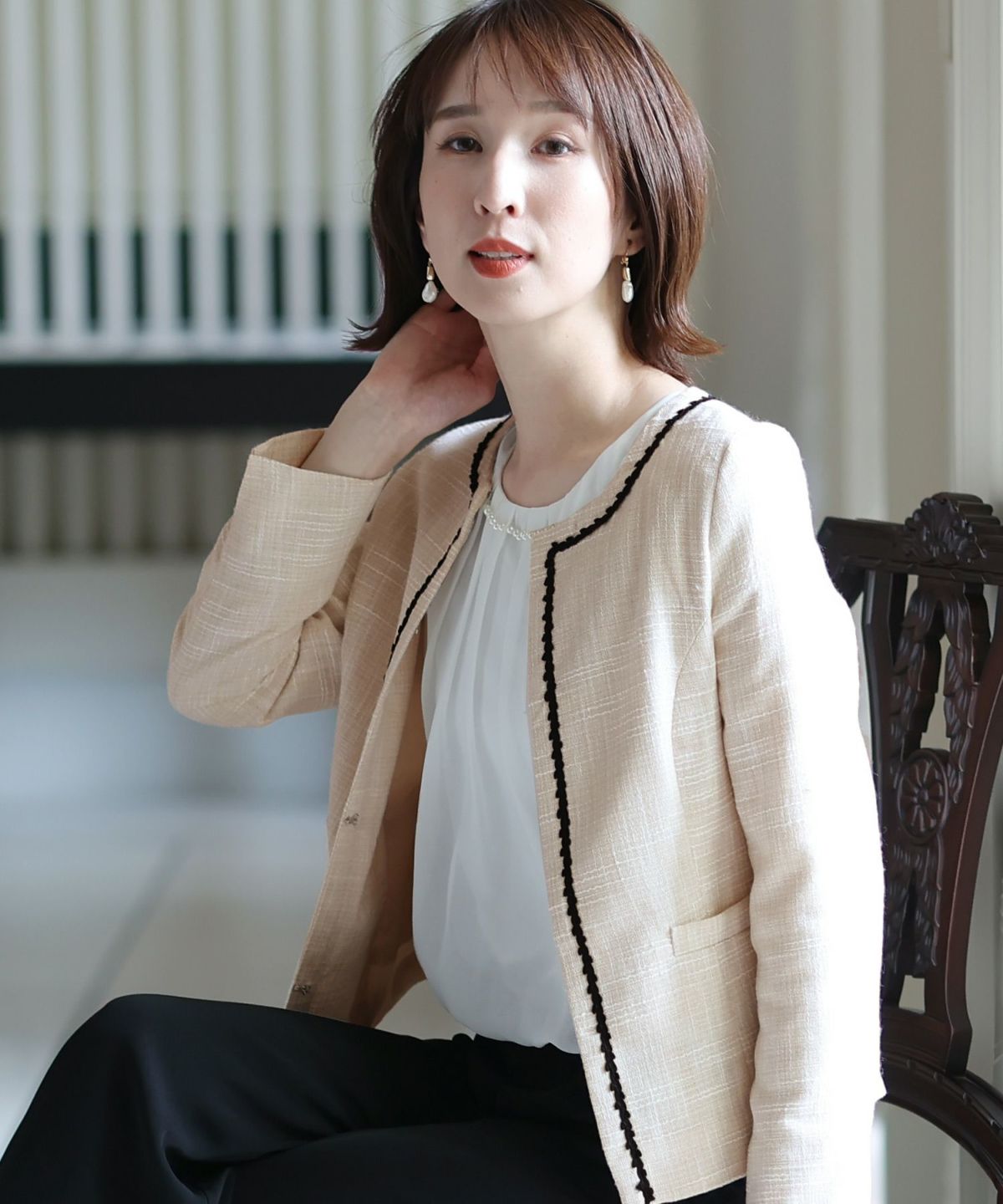オフの日やカジュアルなイベントには、リラックス感のあるスーツがおすすめです。軽やかな素材と明るいカラーで、柔らかい雰囲気をプラス。