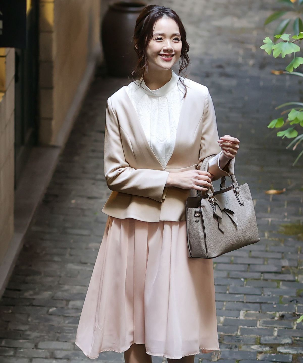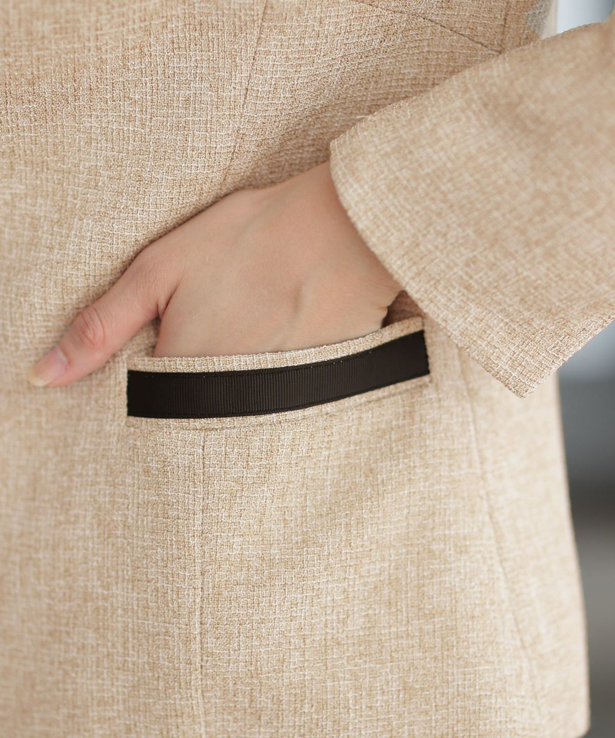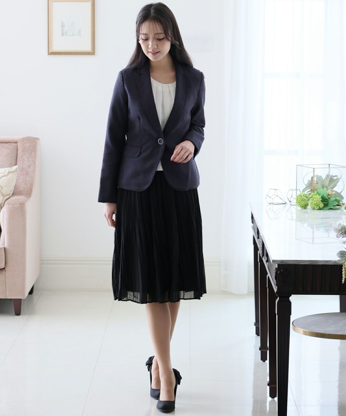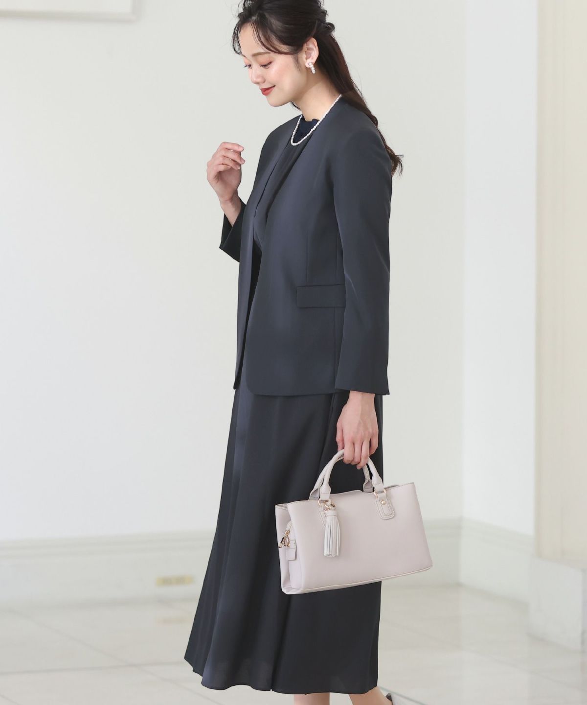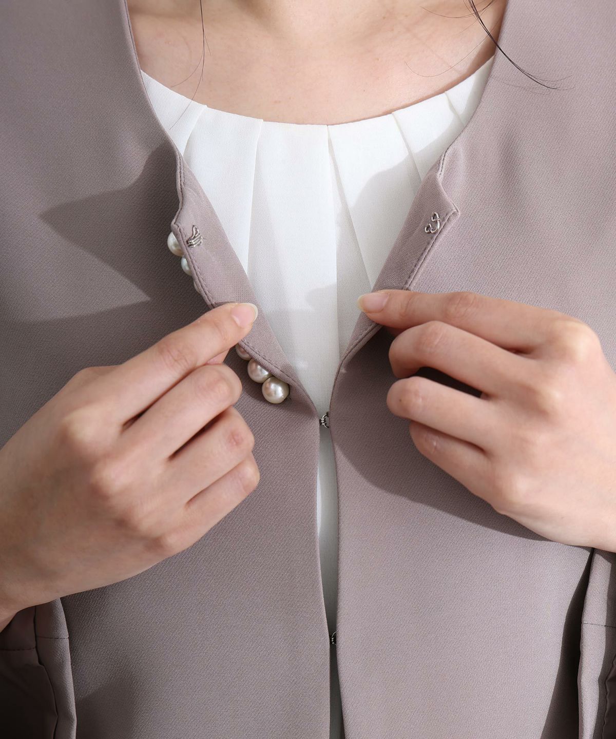 オフの日やカジュアルなイベントには、リラックス感のあるスーツがおすすめです。軽やかな素材と明るいカラーで、柔らかい雰囲気をプラス。