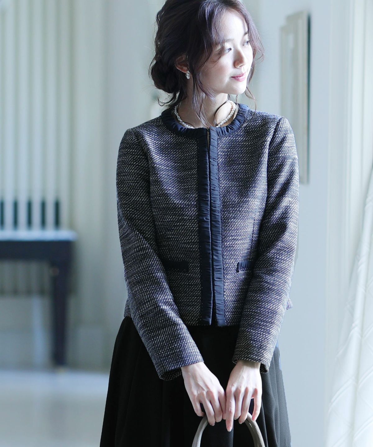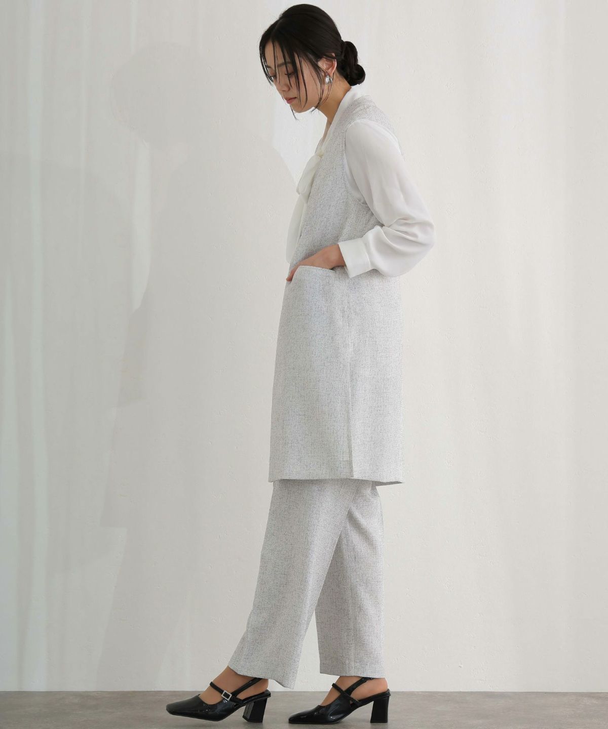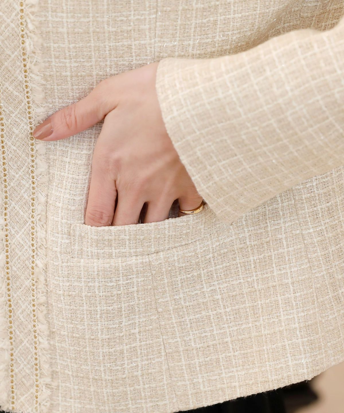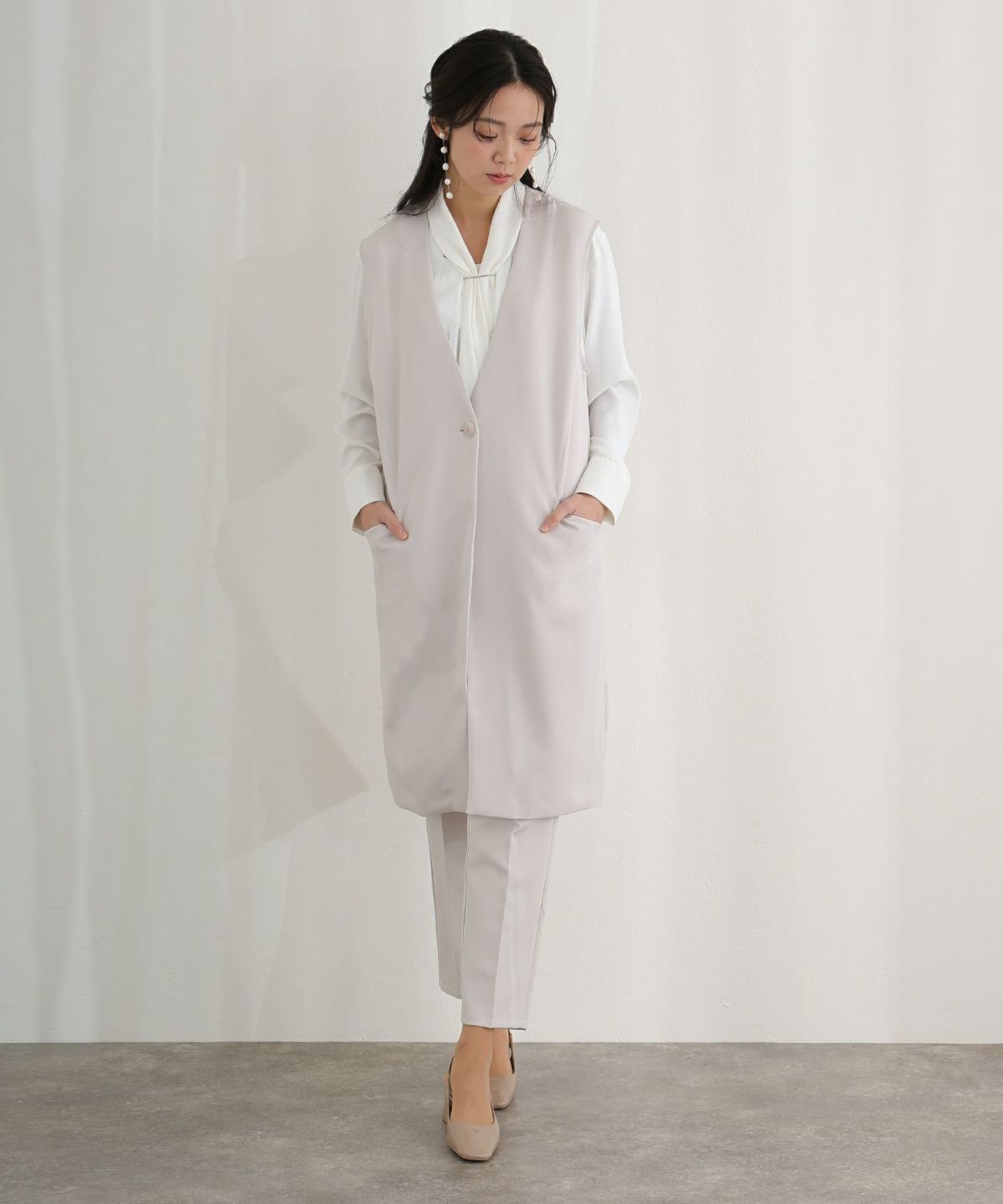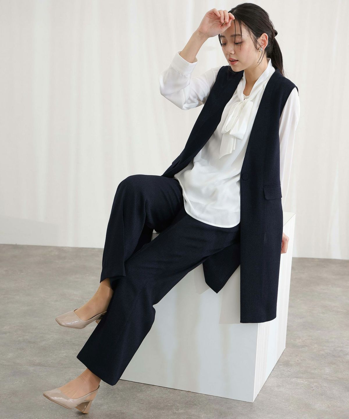 オフの日やカジュアルなイベントには、リラックス感のあるスーツがおすすめです。軽やかな素材と明るいカラーで、柔らかい雰囲気をプラス。