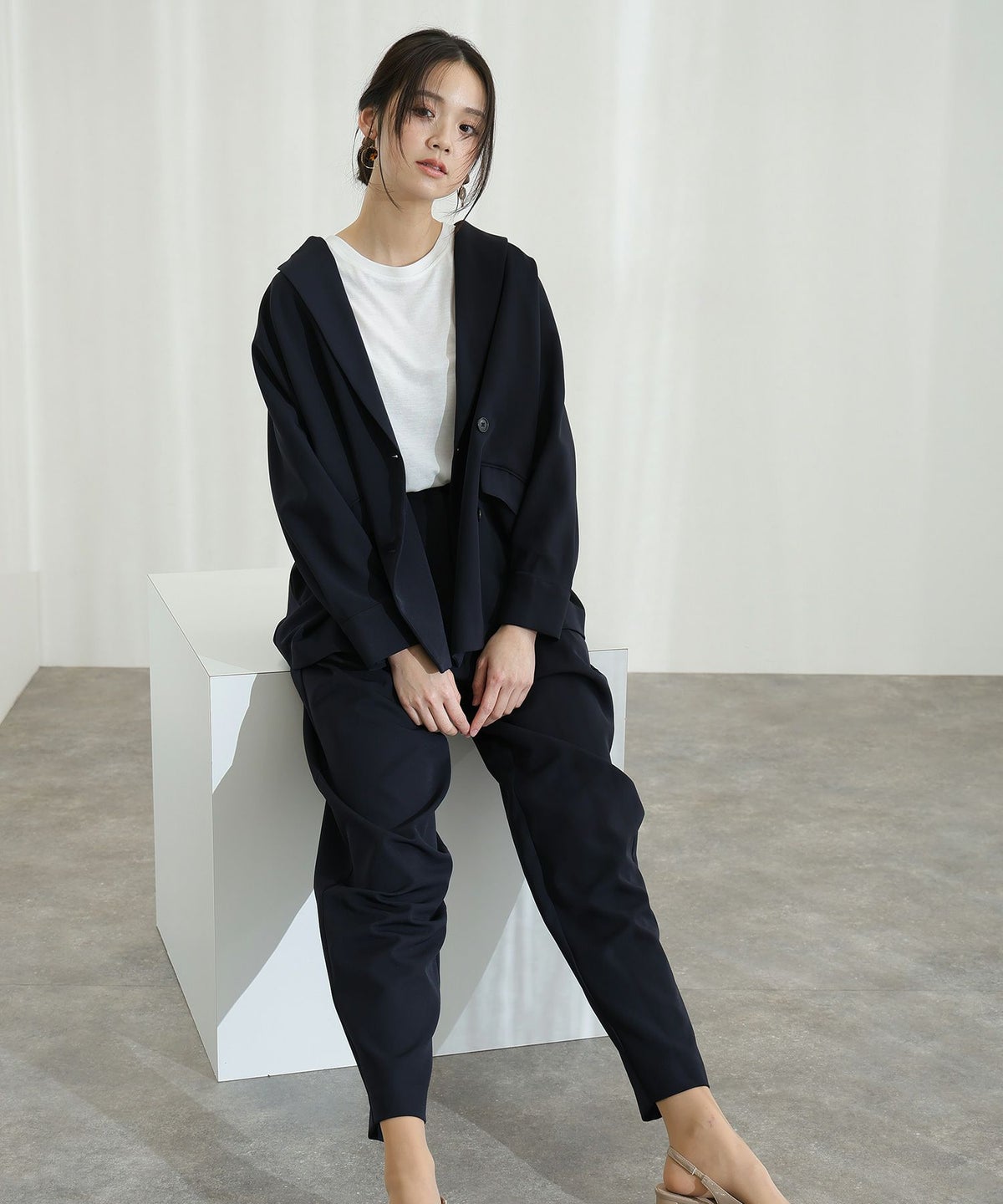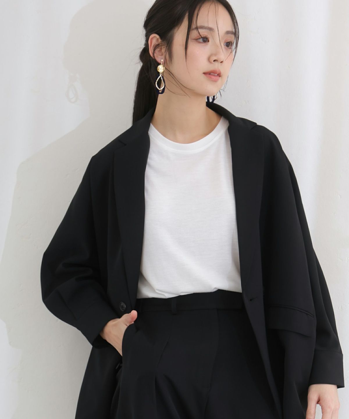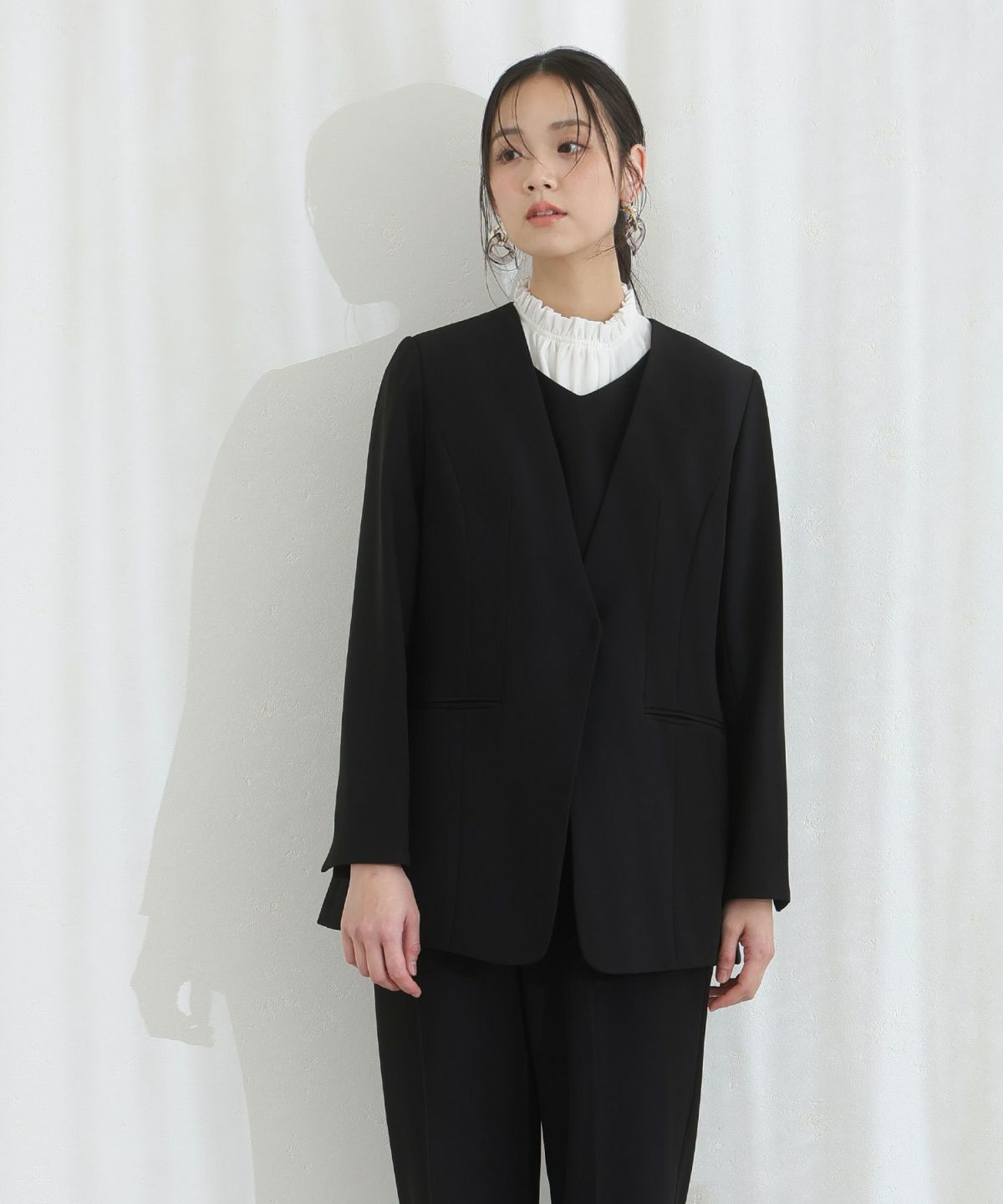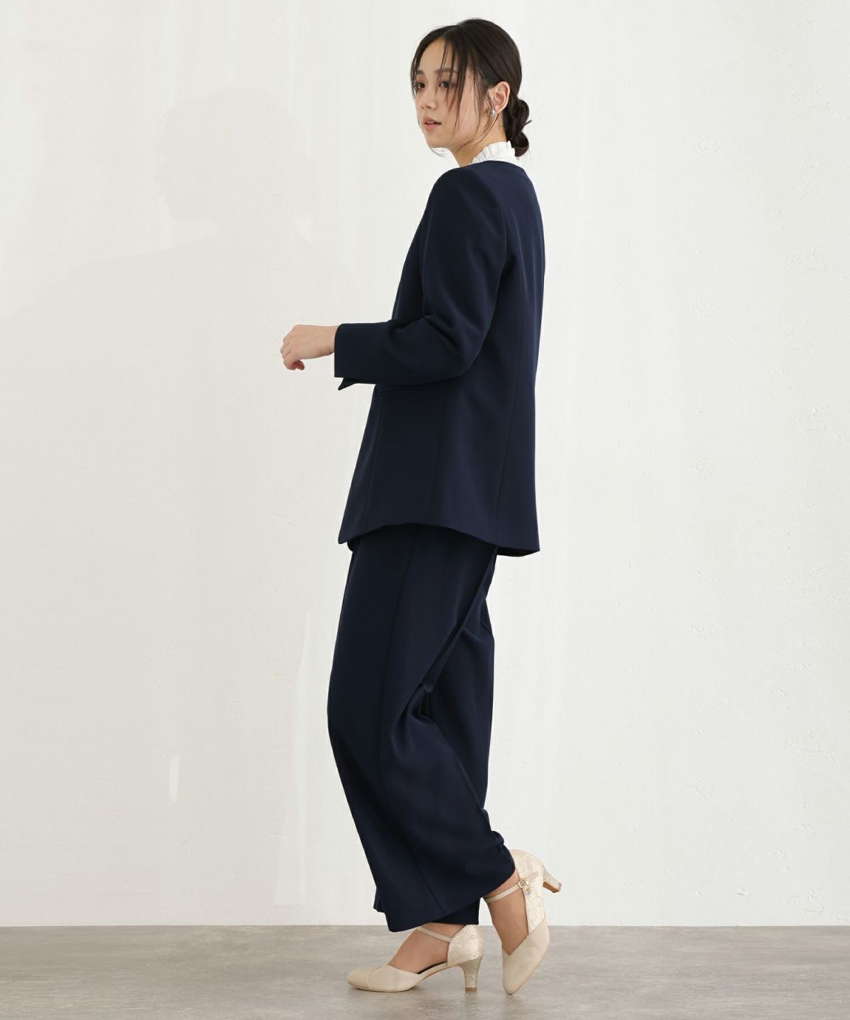 クラシックなジャケットとパンツの組み合わせに、現代的な要素を加えたデザインが魅力。シンプルな中にも洗練されたディテールが光ります。