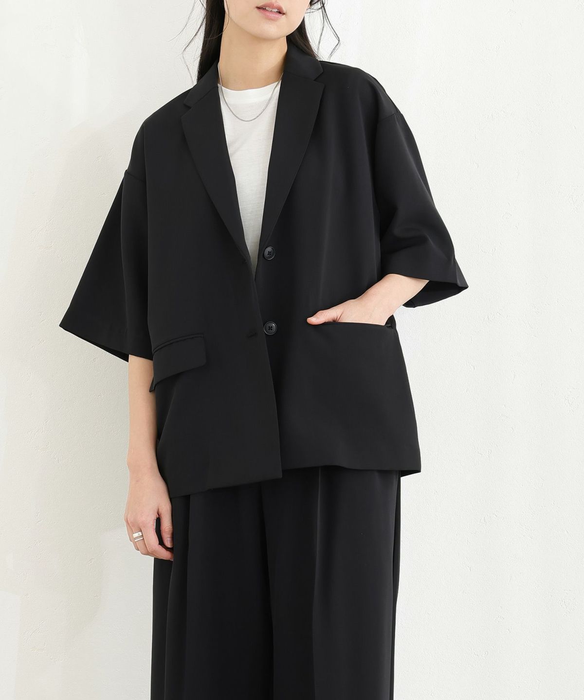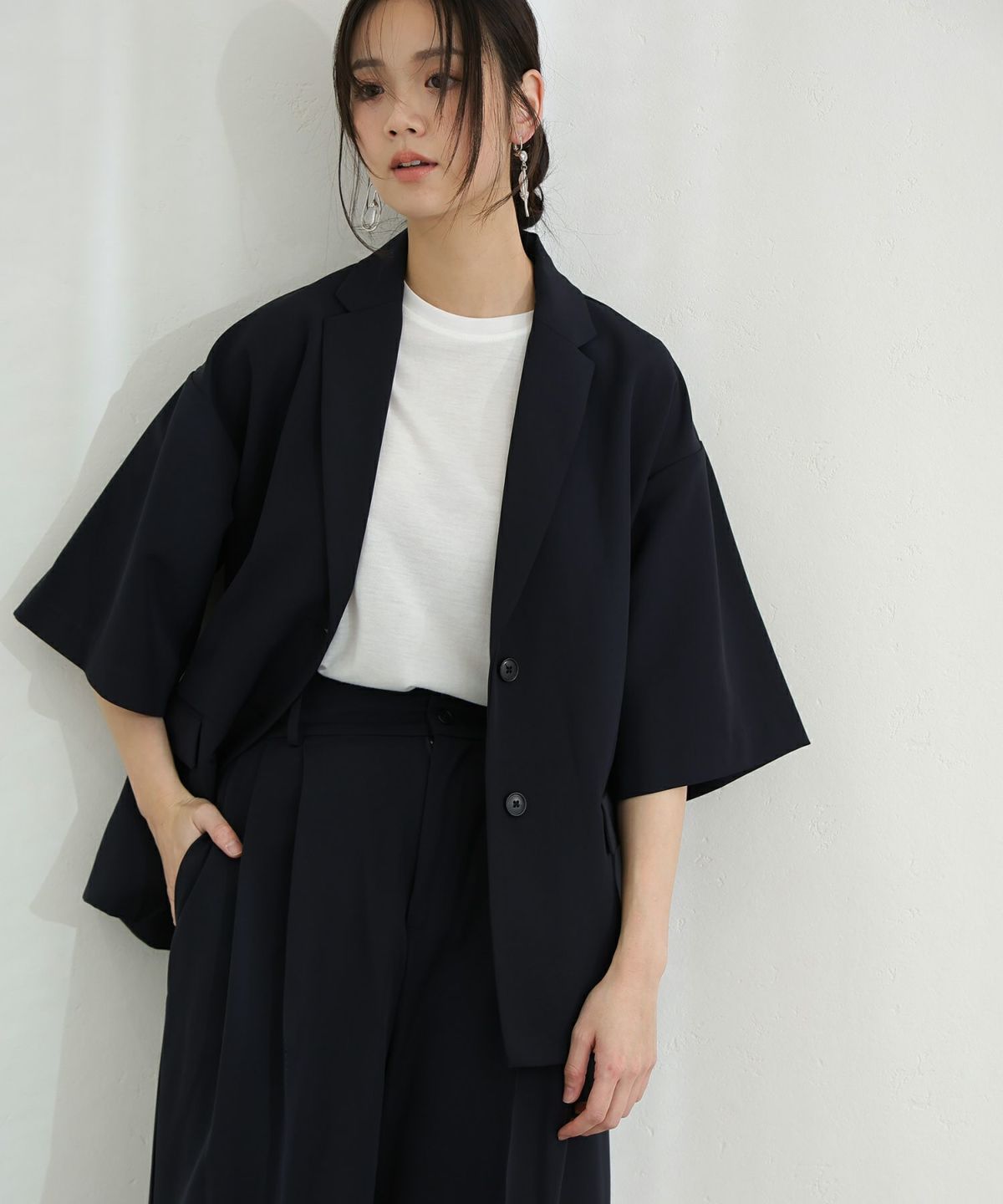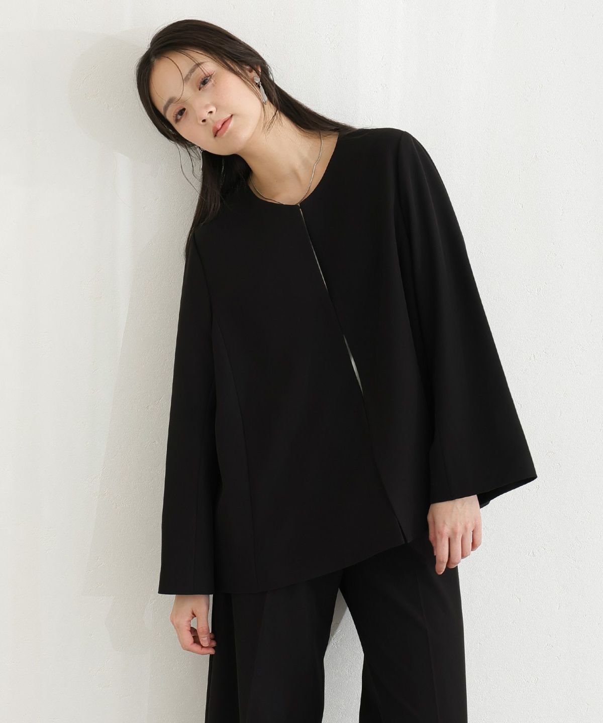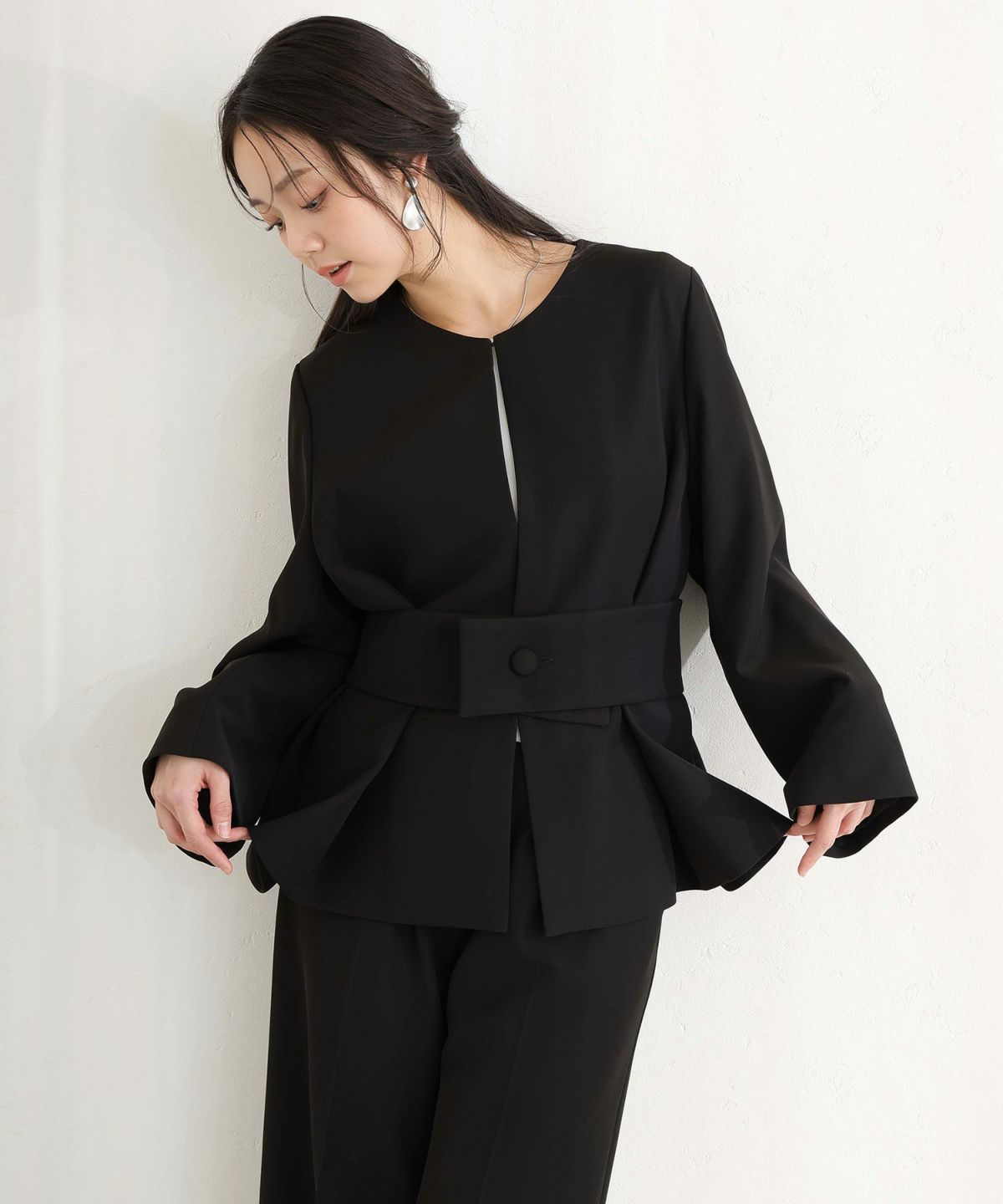 クラシックなジャケットとパンツの組み合わせに、現代的な要素を加えたデザインが魅力。シンプルな中にも洗練されたディテールが光ります。