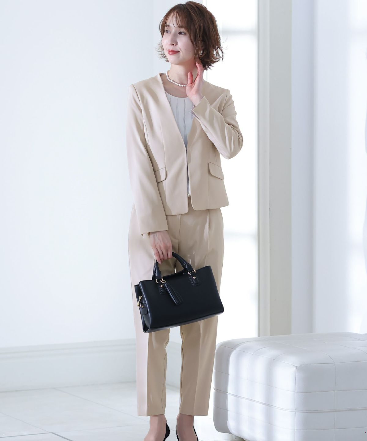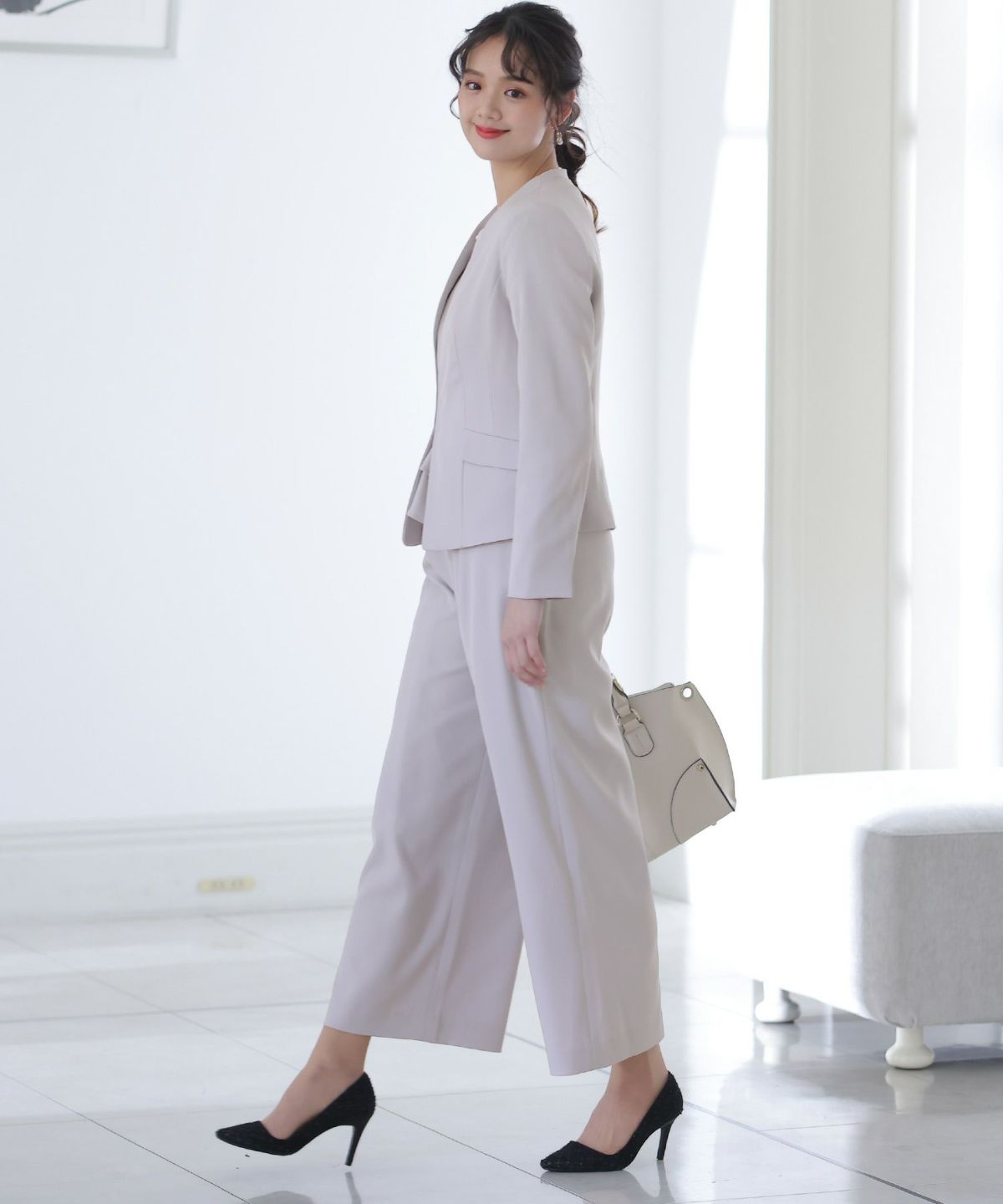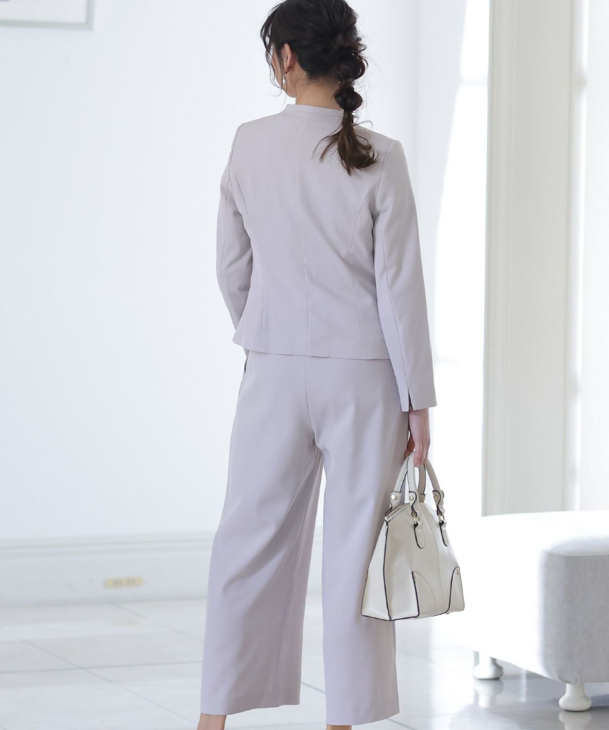 ■2タイプパンツ×ノーカラーJK気分やTPOで選べる2種類のパンツとノーカラージャケットの3点セットです。セットアップではもちろん、それぞれ単品での着回しも◎すっきりとしたデザインがスタイリッシュと女性らしさを両立させます。オケージョンシーンではもちろん、ビジネスや様々なシーンで大活躍♪