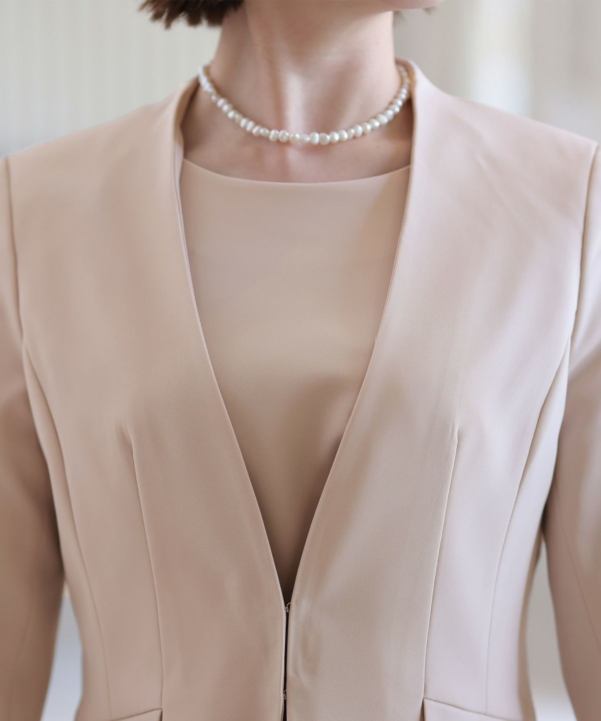 ■さらっと羽織れるスタイリッシュで上品なジャケット体型カバーポイント:【脚】【ウエスト】ノーカラーの深めVネックが顔周りをすっきりみせます。カジュアル過ぎないショートな丈感で脚長効果◎