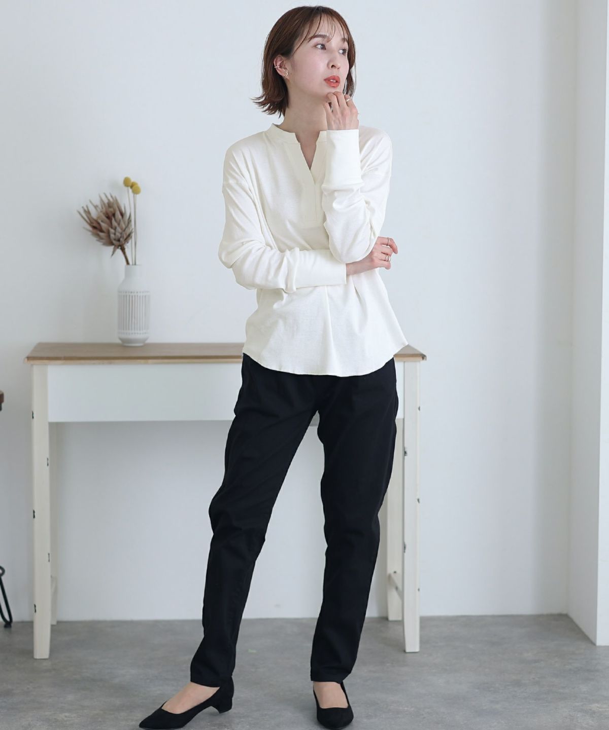 ■1枚でサマになるカジュアルトップス長めの袖でこなれ感を演出。キーネックのネックラインがデコルテ部分を綺麗に見せてくれます。裾がラウンドヘムになっているので重ね着にもおすすめです。