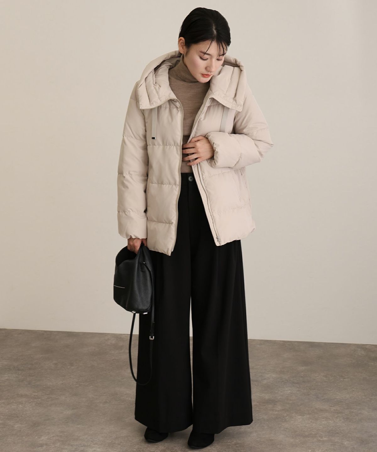 しなやかな風合いで、マットな質感が上品なフード付きダウンジャケット。