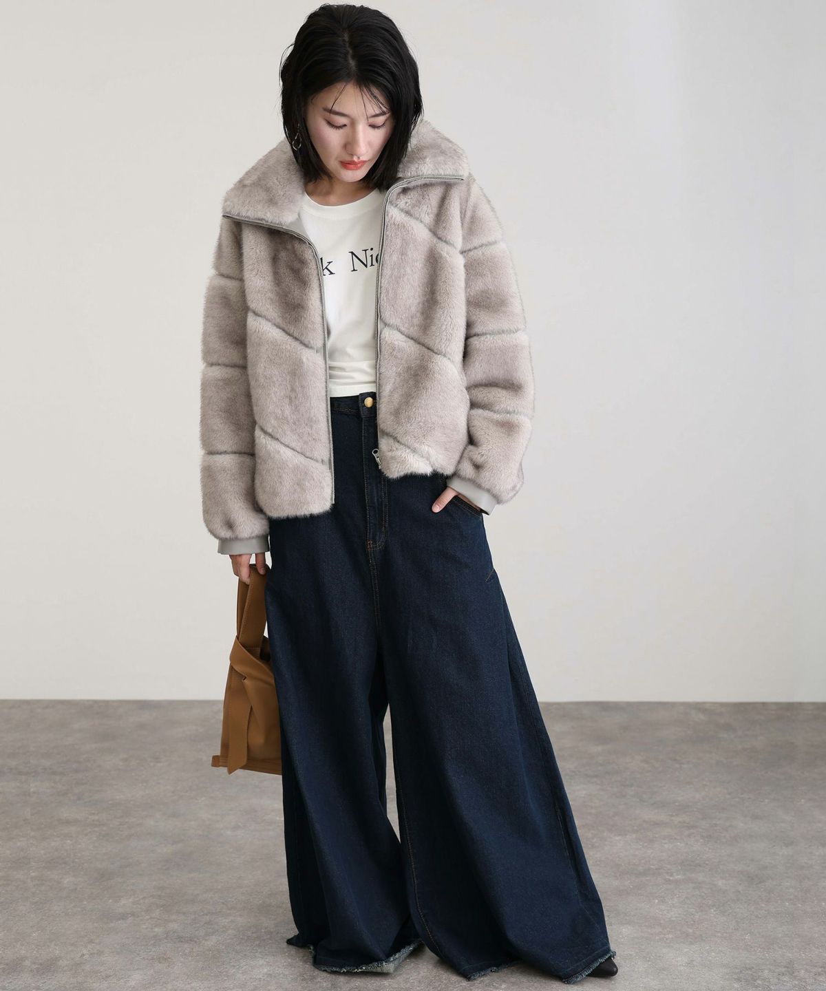 斜めのラインが個性的でコーデのアクセントに ミンク風フェイクファージャケット