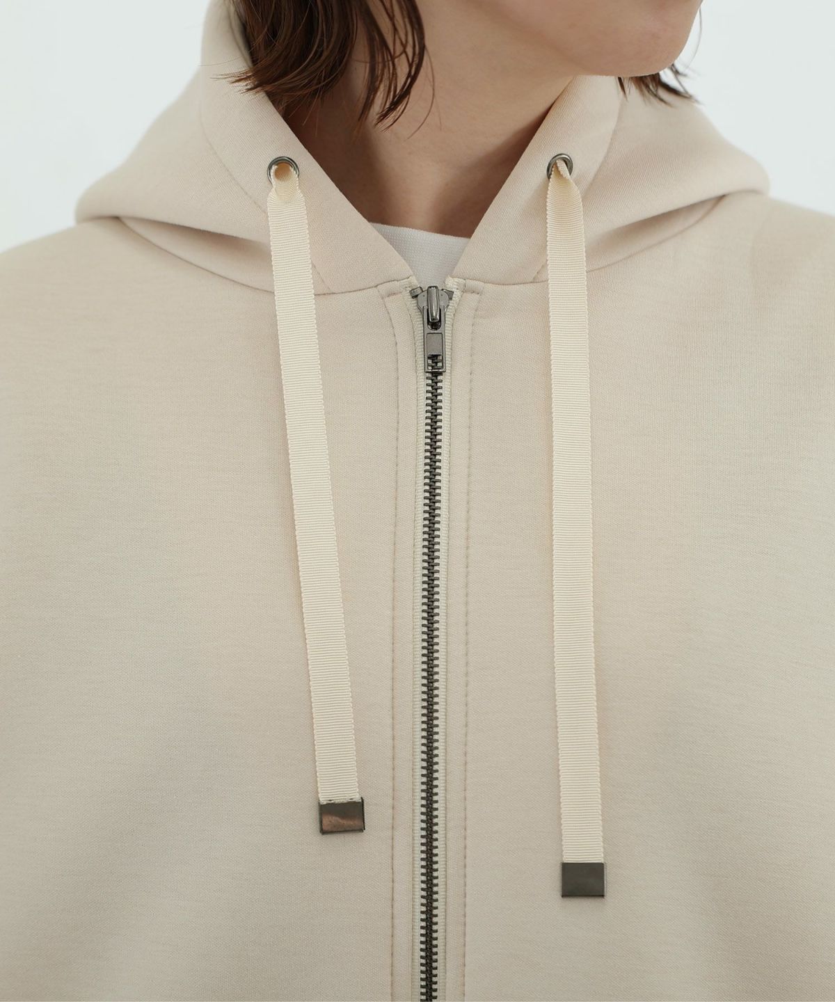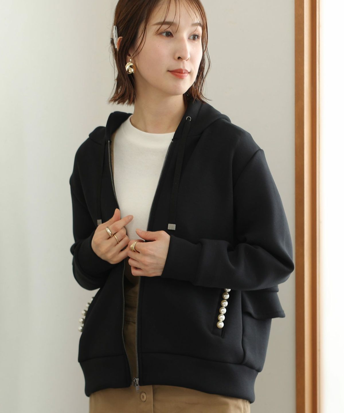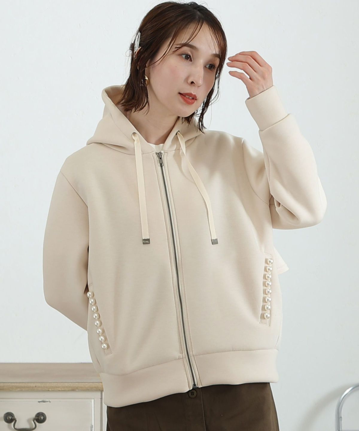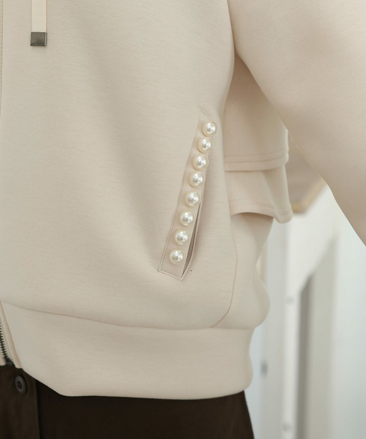 もちもちとした肌ざわりが気持ちいい パール付きバックフリルパーカー