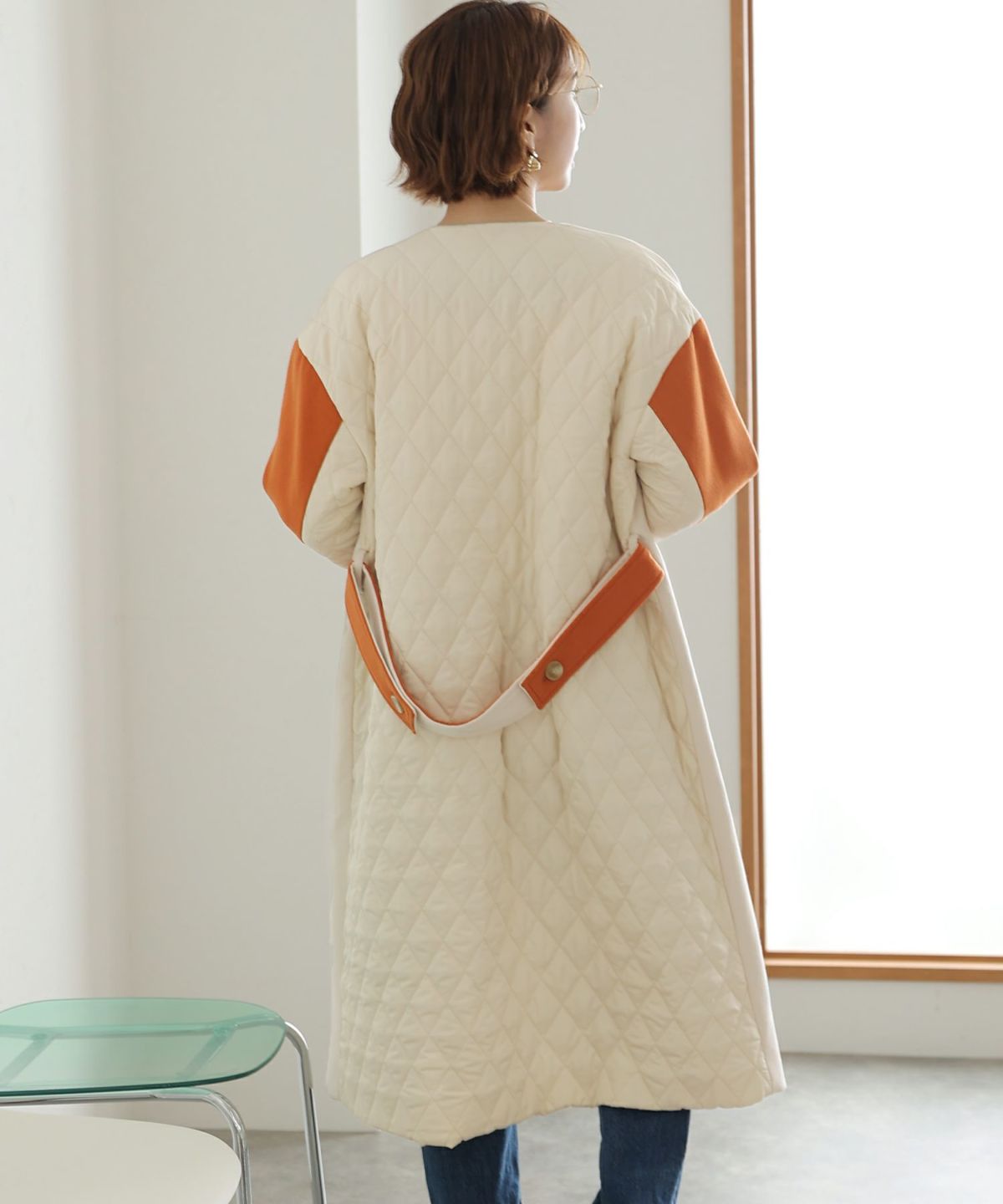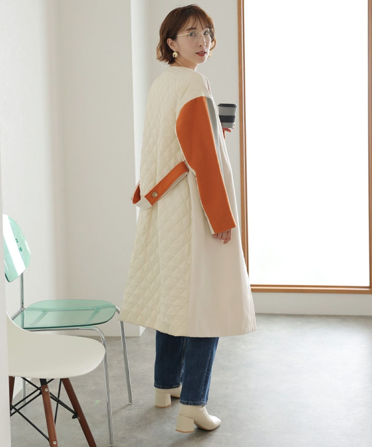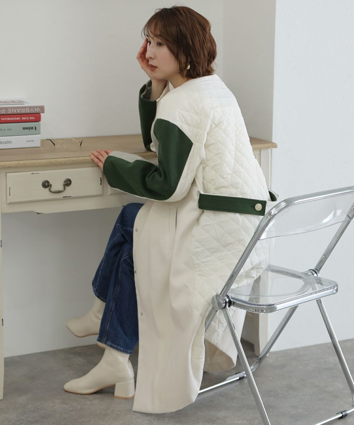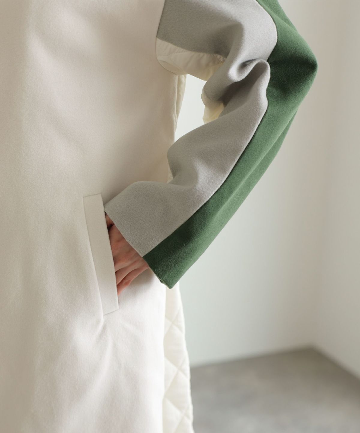 袖の配色がこだわりのロングコート 後キルティング配色コート