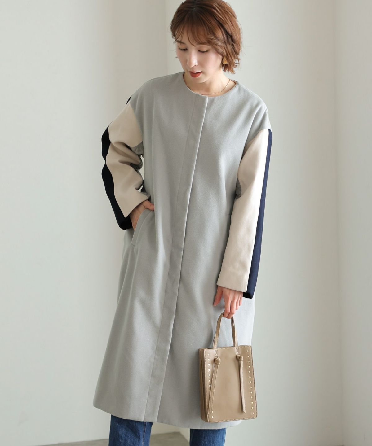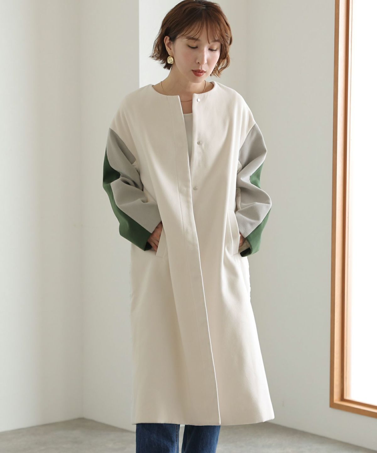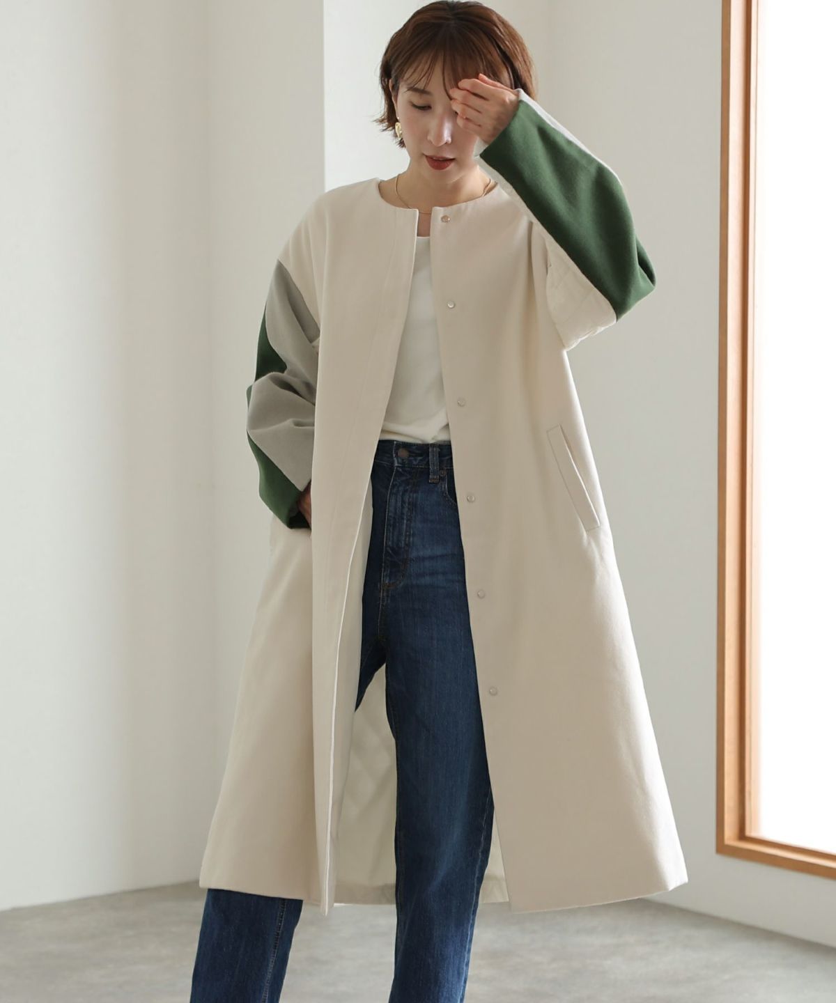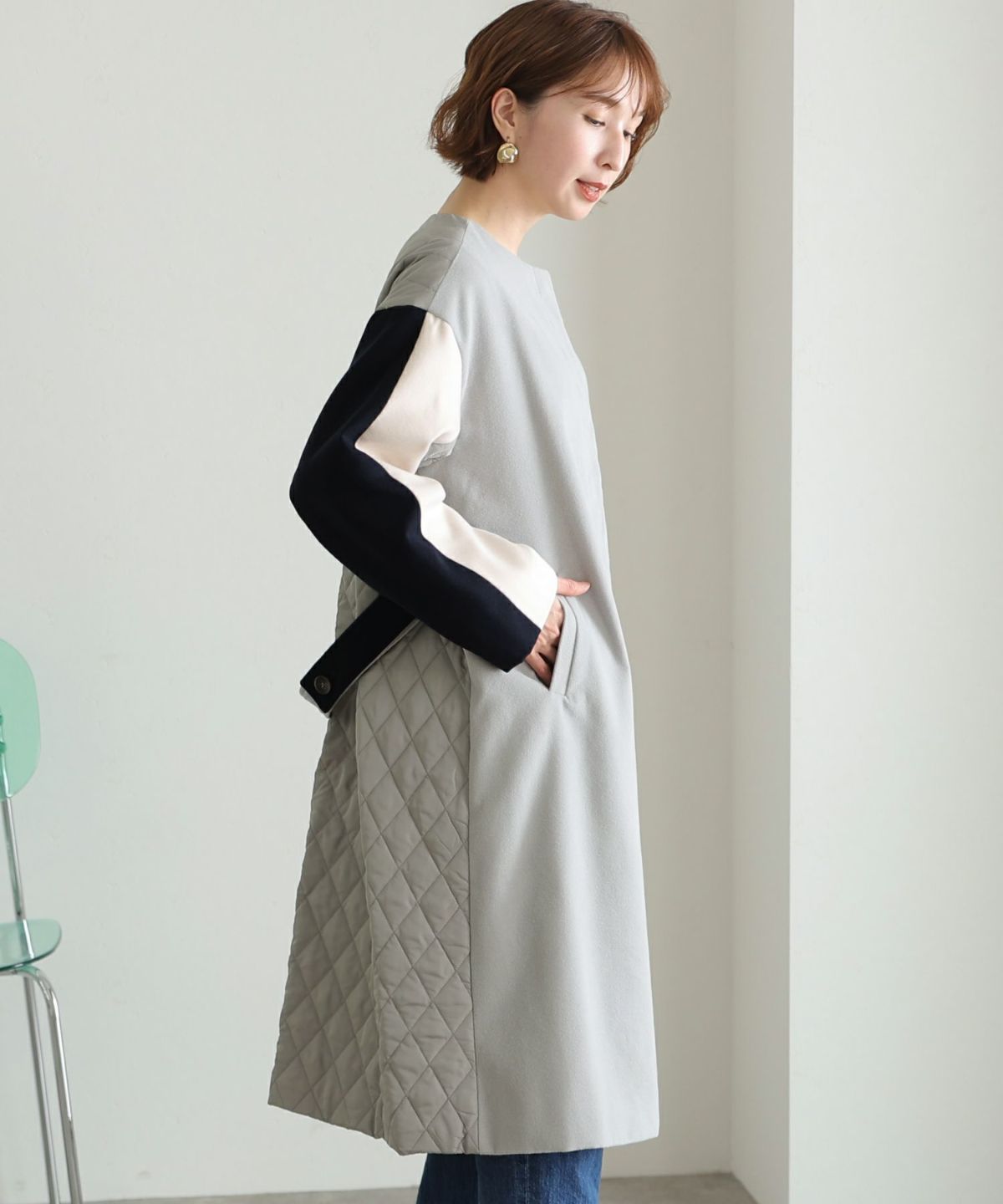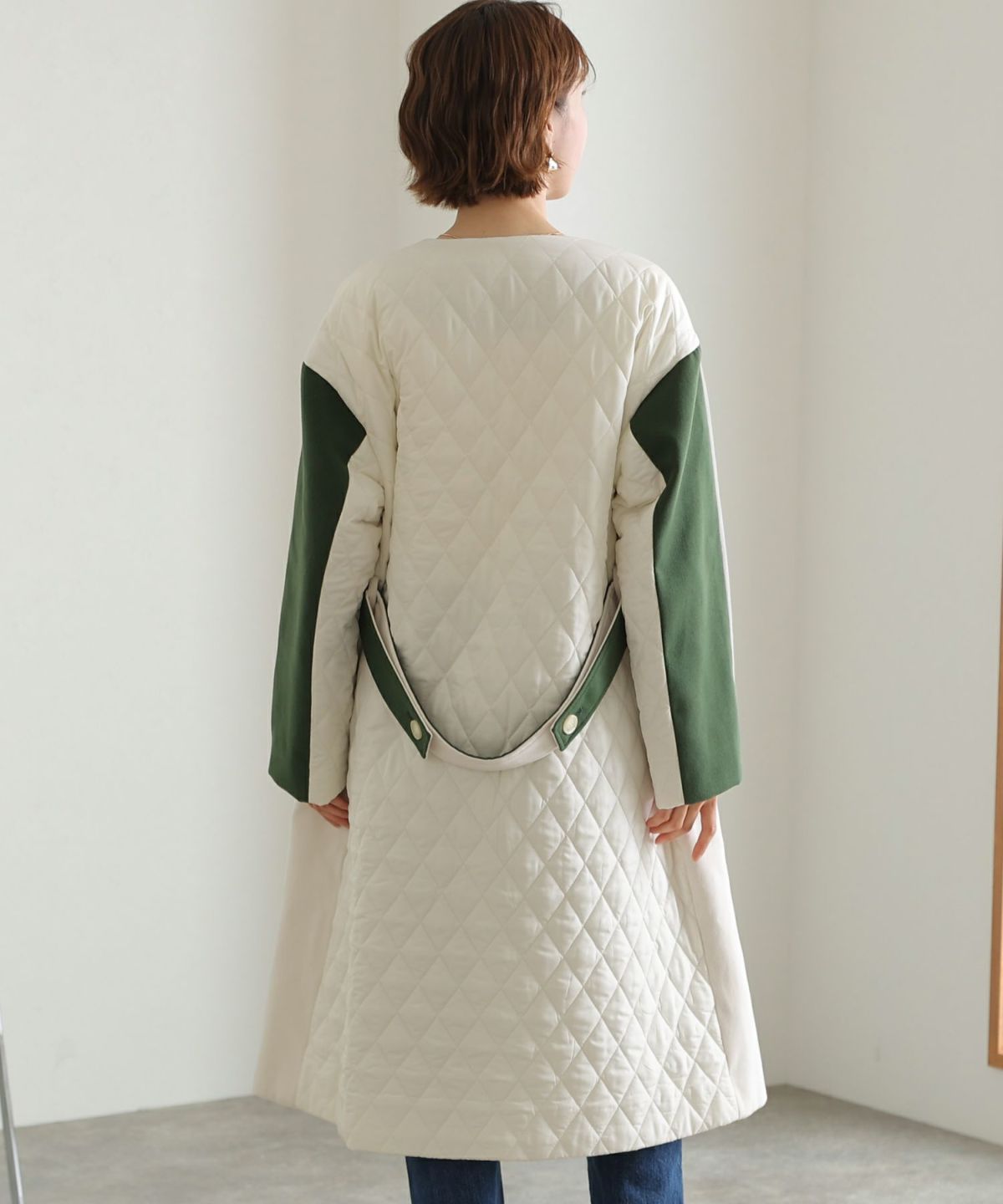 袖の配色がこだわりのロングコート 後キルティング配色コート