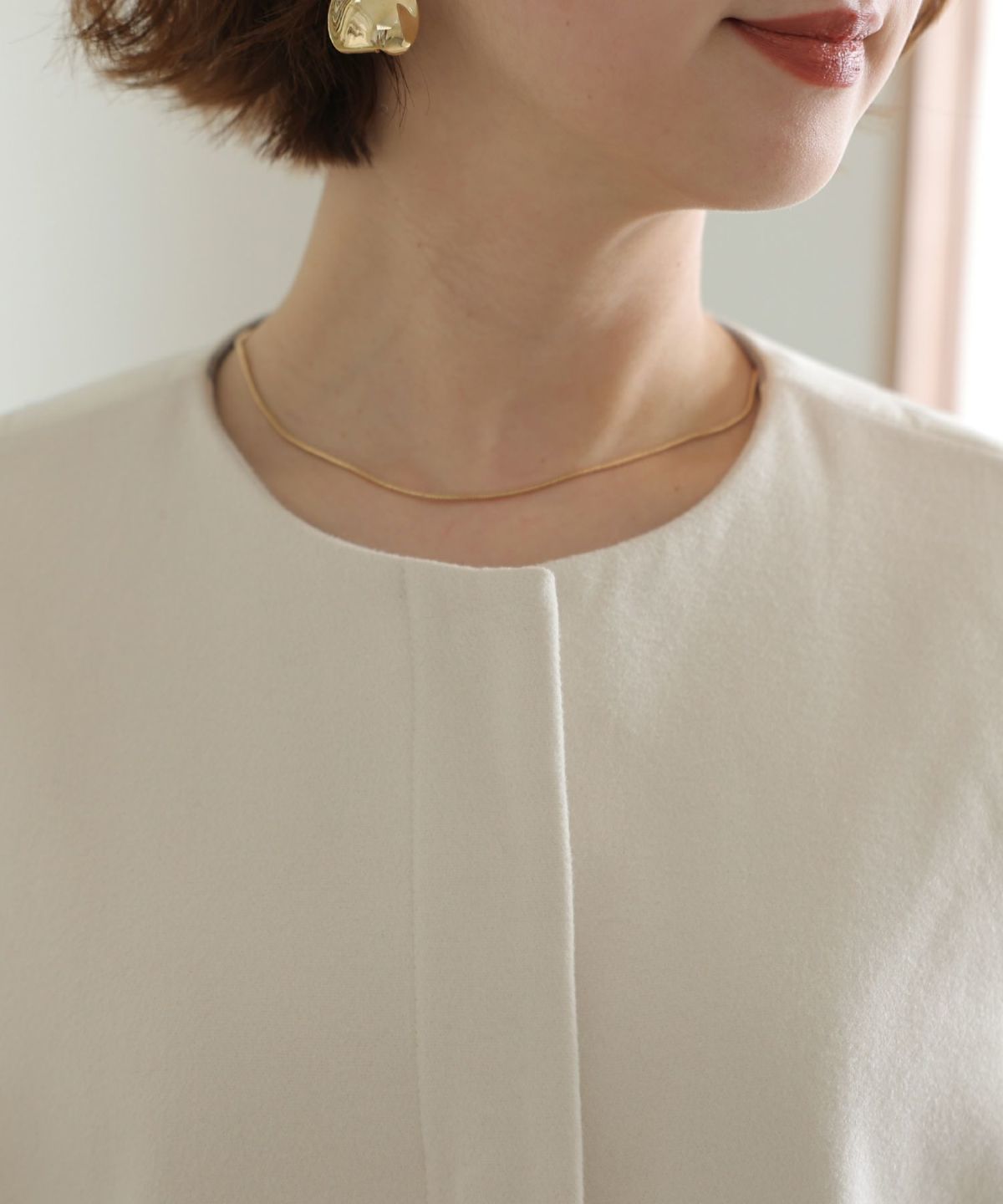 ■キルティングの切り替えでバックスタイルもかわいいロング丈で足元もあたたかく、ノーカラーで首元をすっきり見せてくれます。