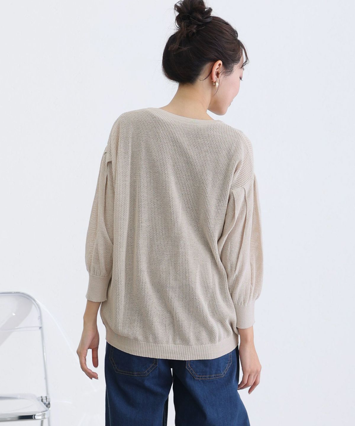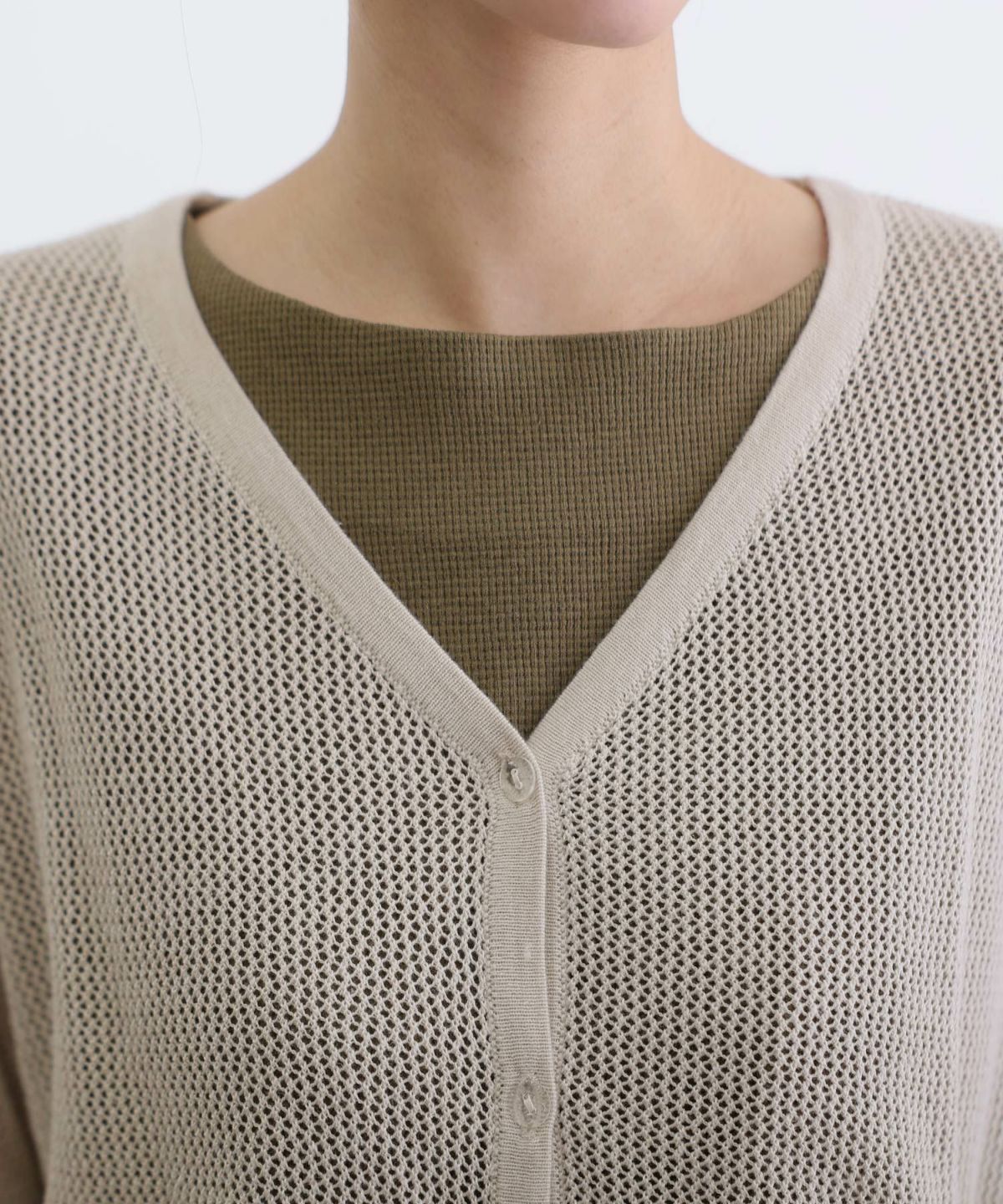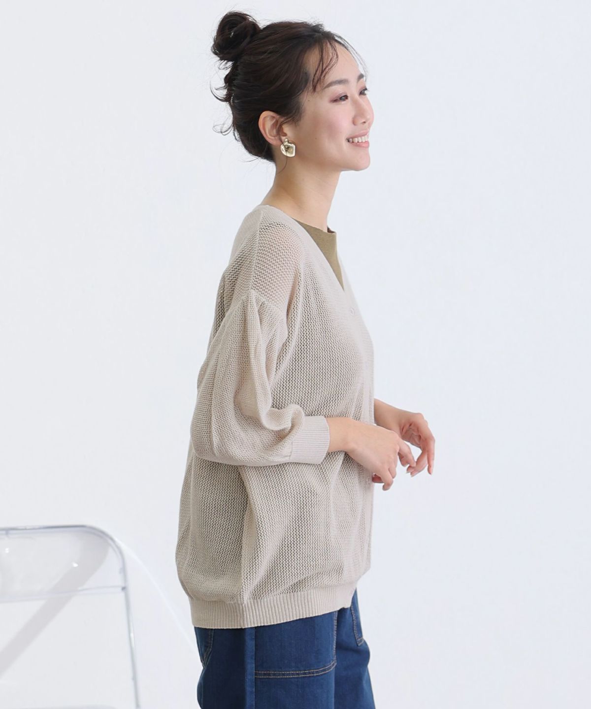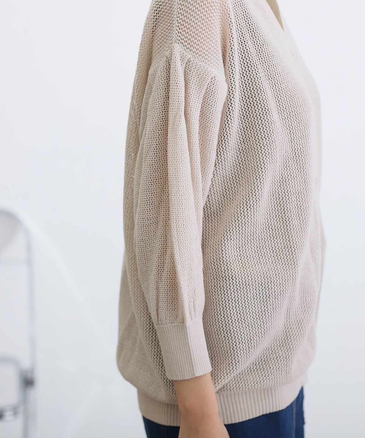 袖がタックデザインでゆとりがあり大き目のシルエットが可愛い メッシュ編みVネックカーディガン
