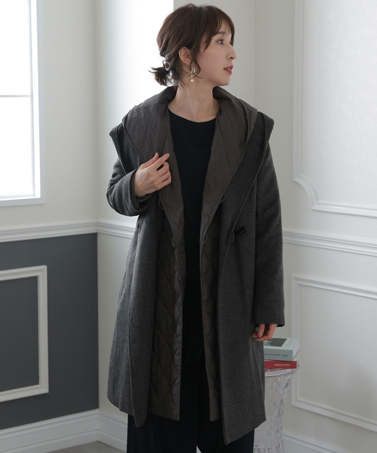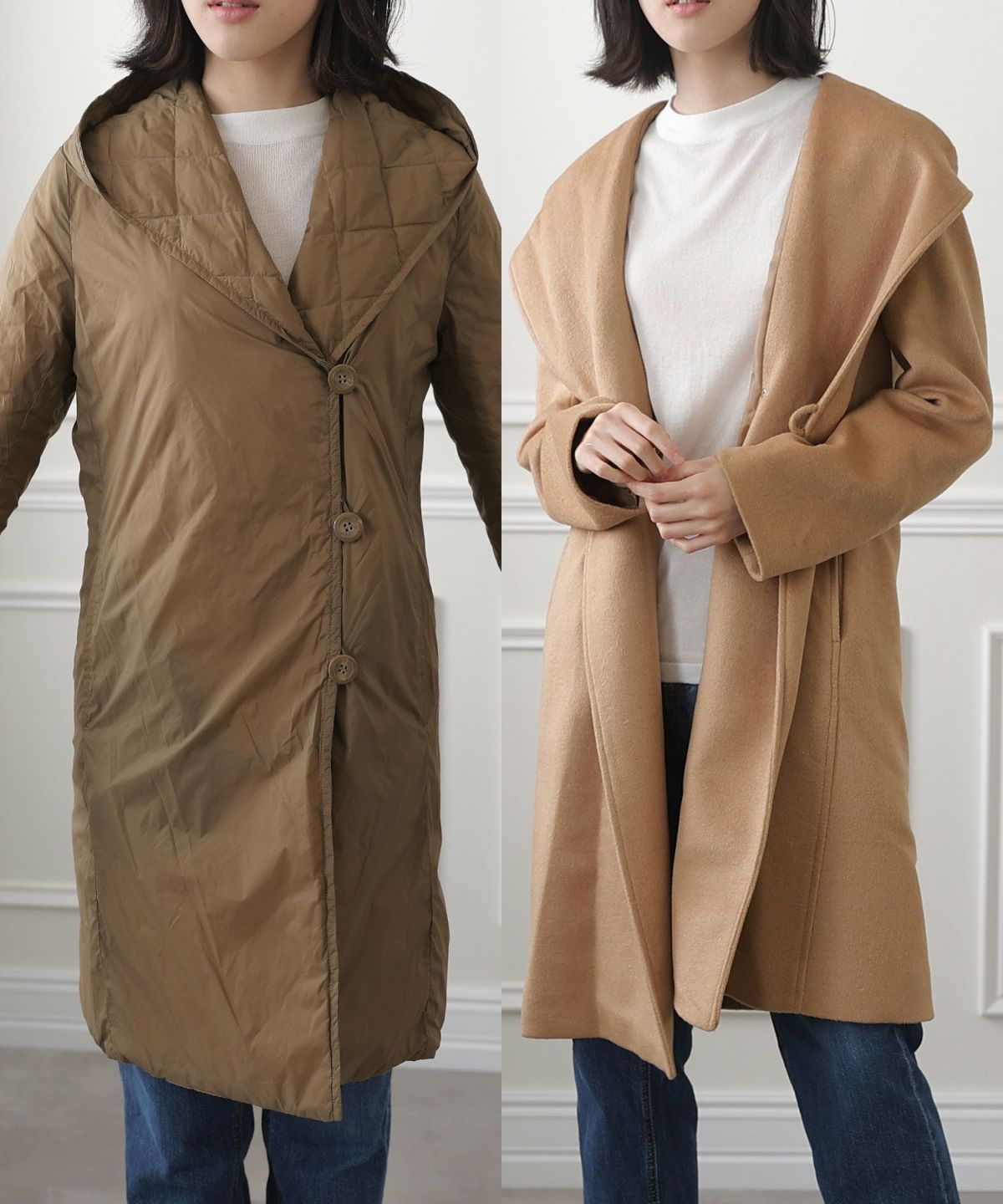ウール31%のガウンコートとキルティングダウンがセットになったコート。重ねても単体でも着られ、さらにダウンはリバーシブルでの着用もできます。