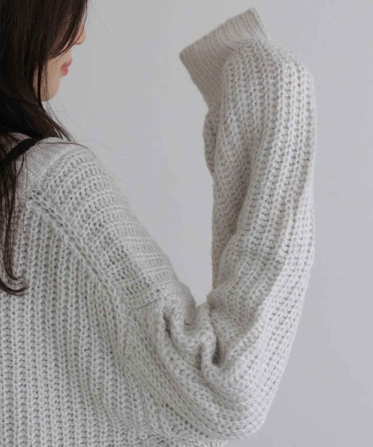 光沢感のあるモヘアのような質感のアクリル糸を使用したカーディガン