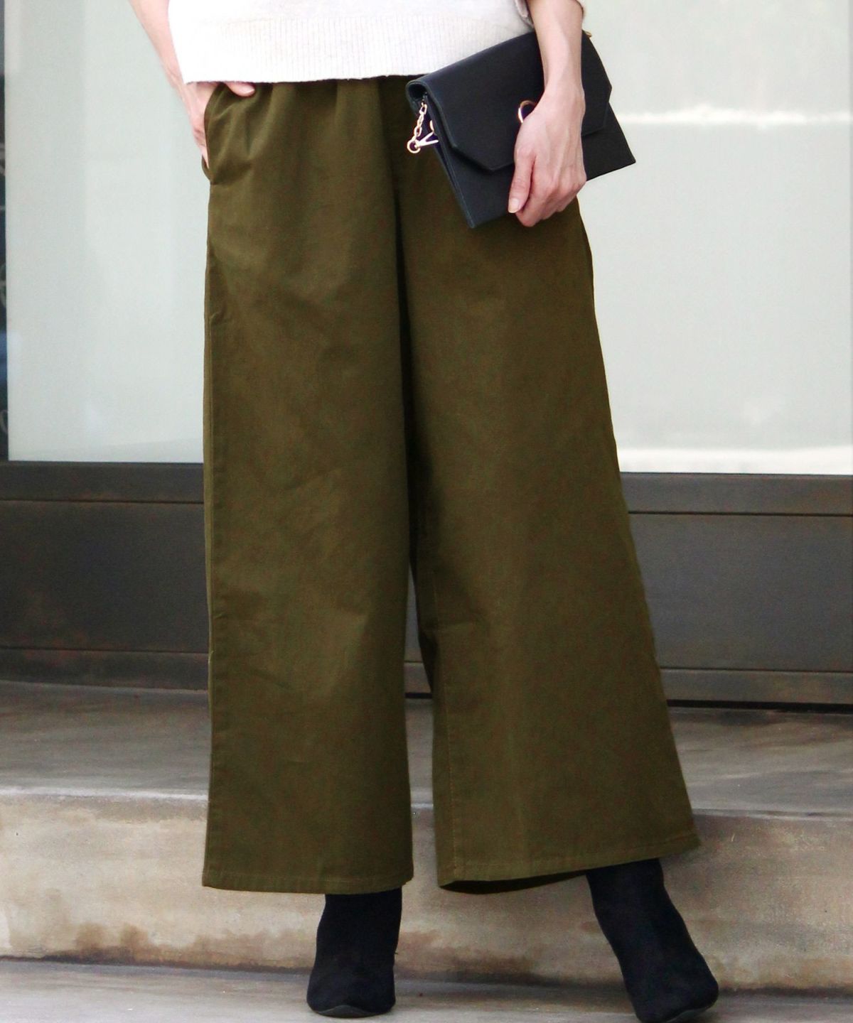 ウエストはゴム仕様になっており、裾がワイドになっているので体型カバーに嬉しいデザイン。取り外し可能なリボンがアクセントに♪ギャザー加工でこなれ感を出します。