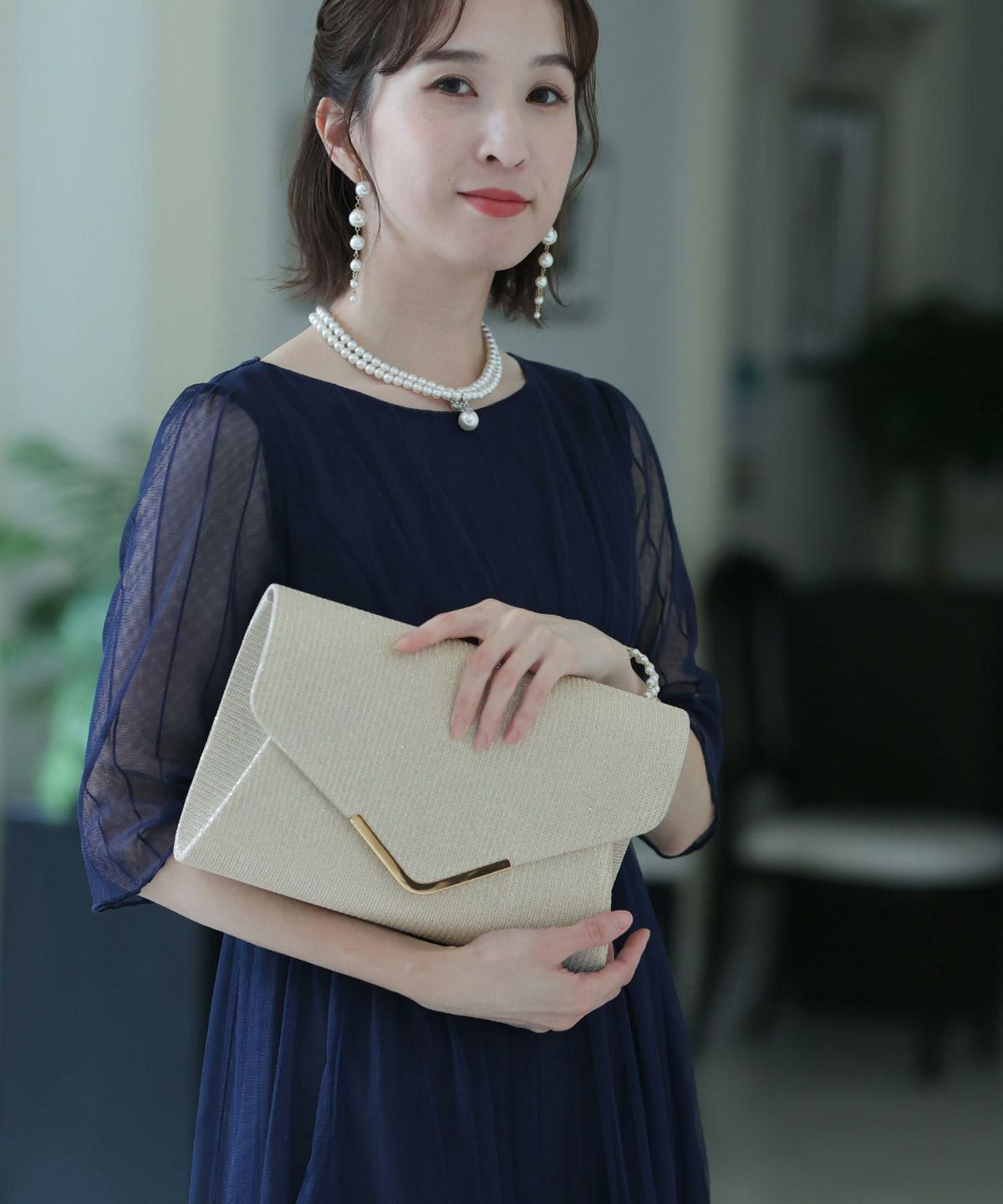 パーティーや結婚式のお呼ばれ。ネックレスを控えめに、存在感あるイヤリングやピアスで。