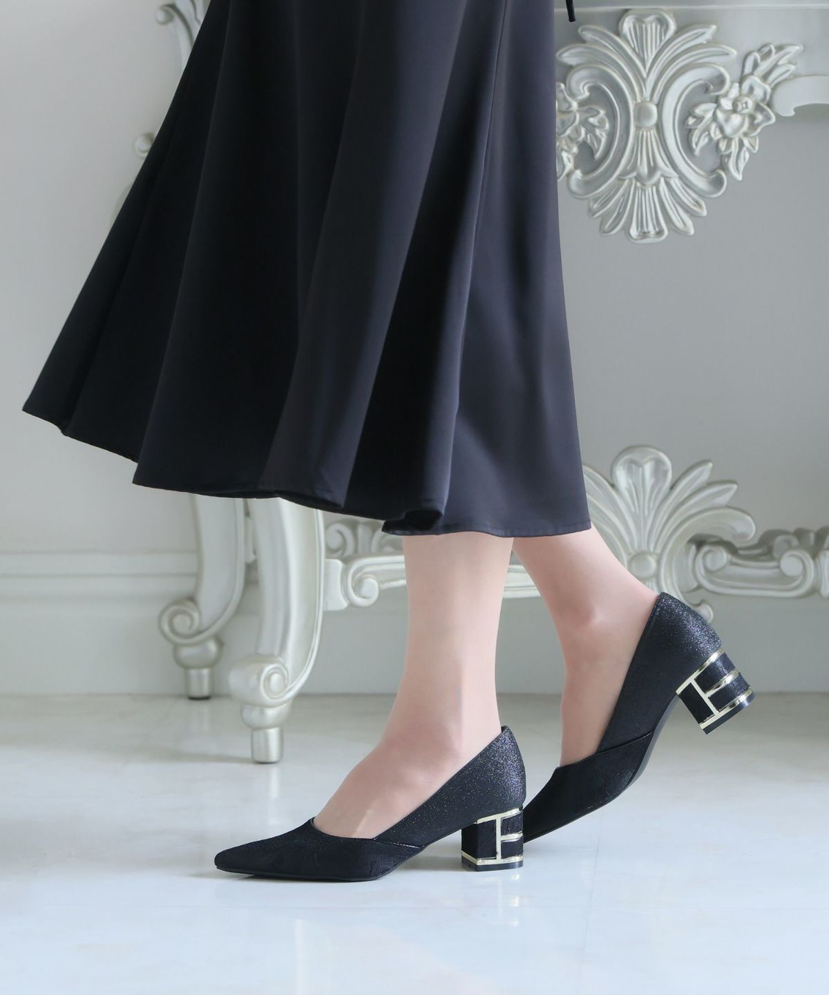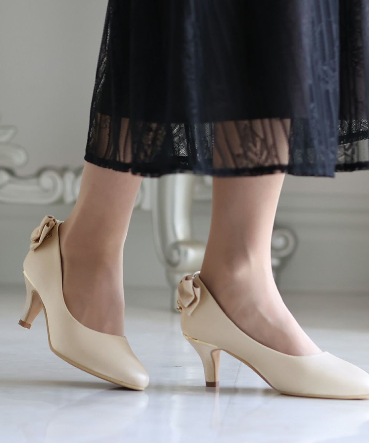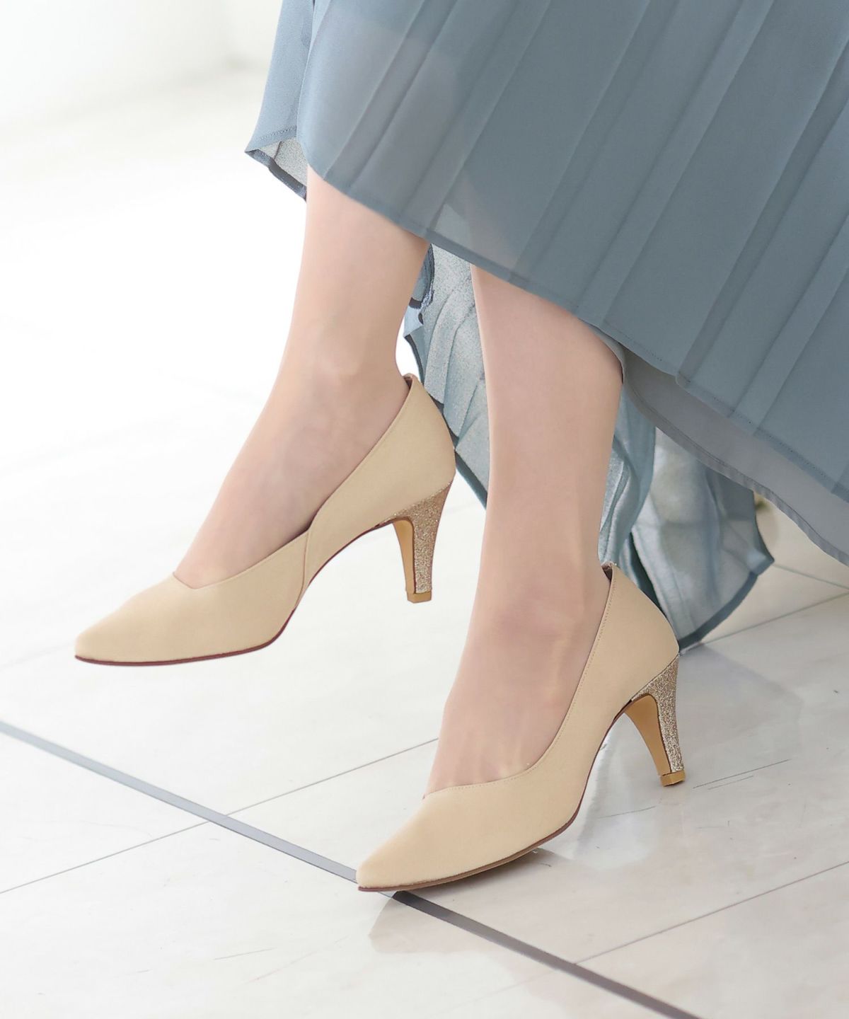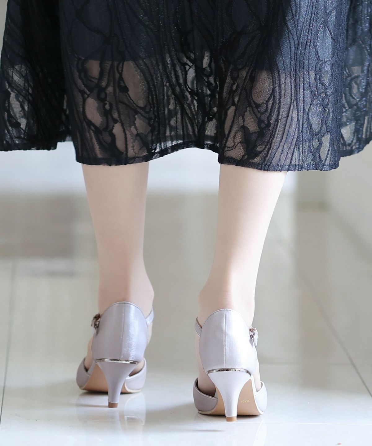 パーティードレスにぴったりのシューズで足元を美しく。ヒールの高さやデザインを選び、ドレスとのバランスを整えます。特に、同系色のパンプスやサンダルは、足を長く見せ、エレガントな印象を与えます。