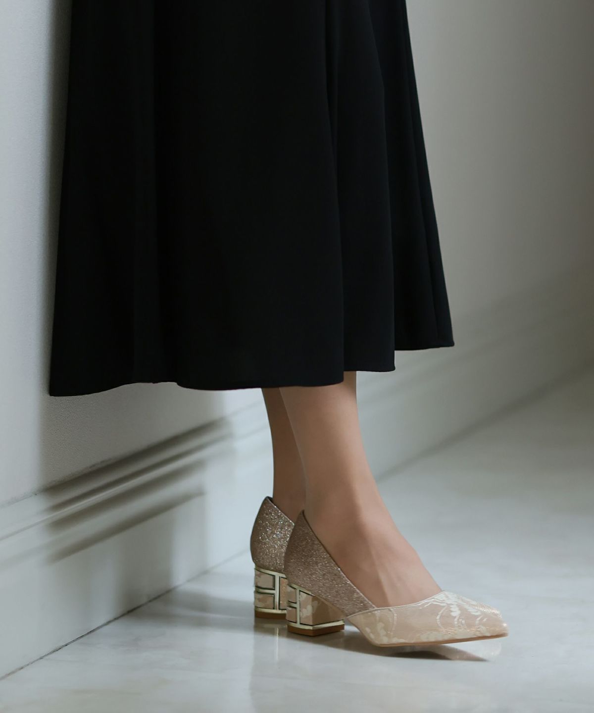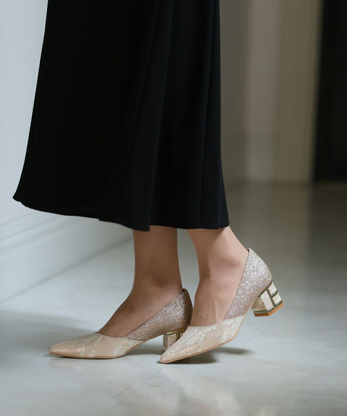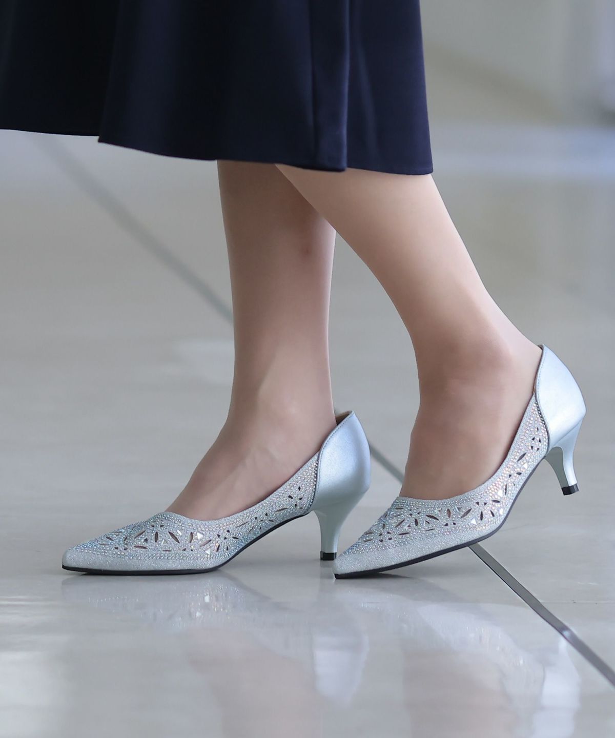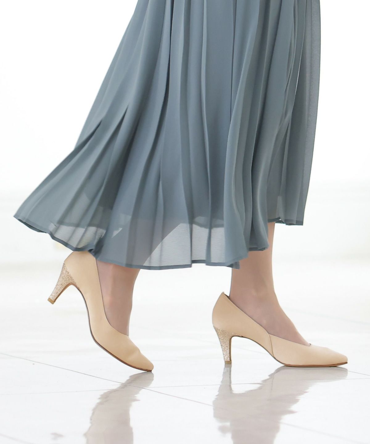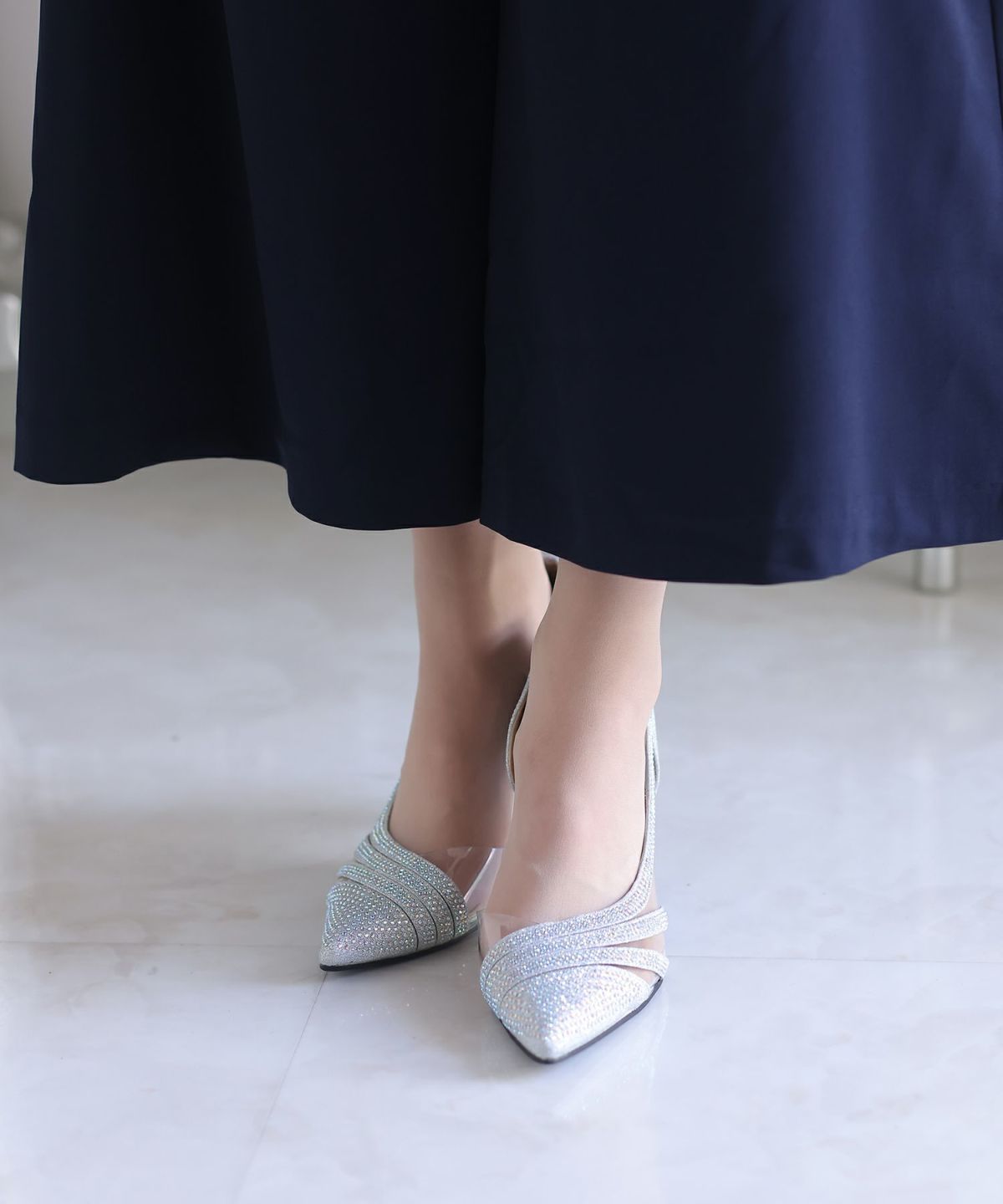 パーティードレスにぴったりのシューズで足元を美しく。ヒールの高さやデザインを選び、ドレスとのバランスを整えます。特に、同系色のパンプスやサンダルは、足を長く見せ、エレガントな印象を与えます。