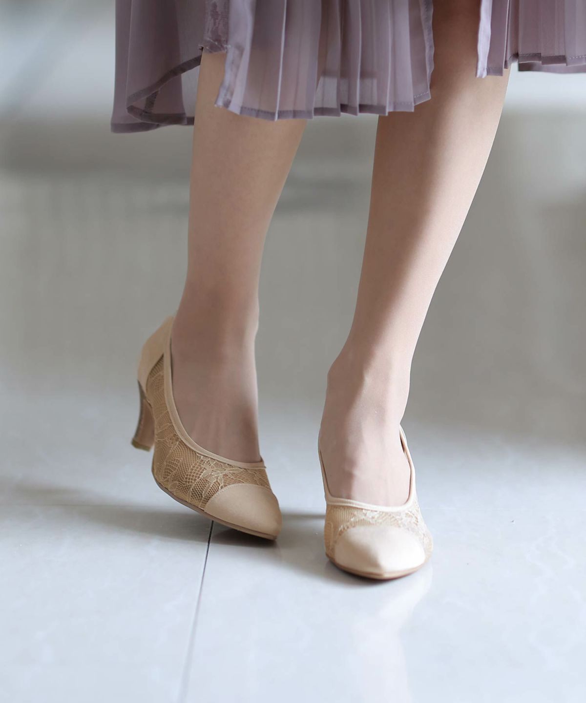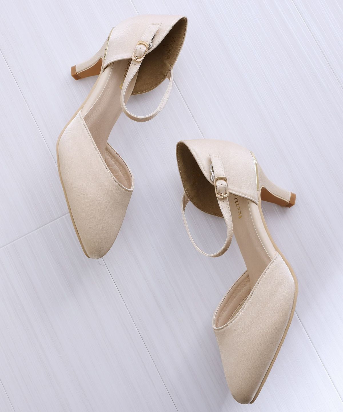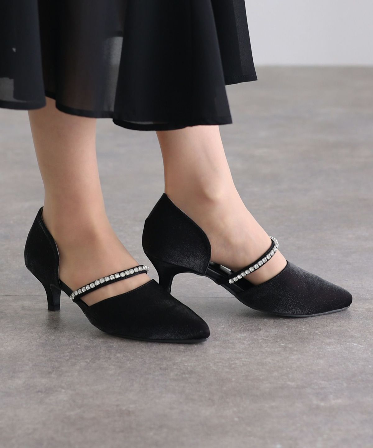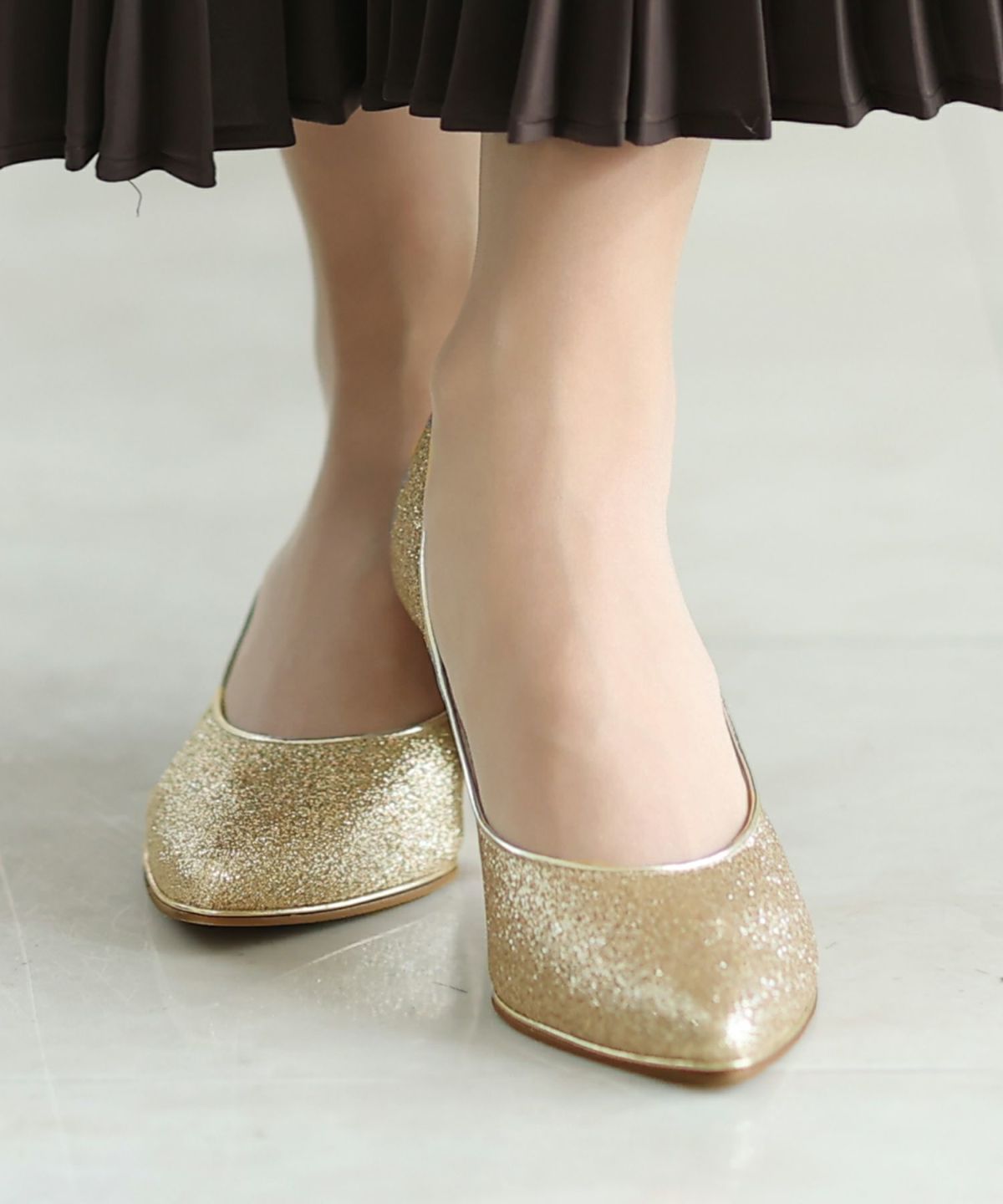 パーティードレスにぴったりのシューズで足元を美しく。ヒールの高さやデザインを選び、ドレスとのバランスを整えます。特に、同系色のパンプスやサンダルは、足を長く見せ、エレガントな印象を与えます。