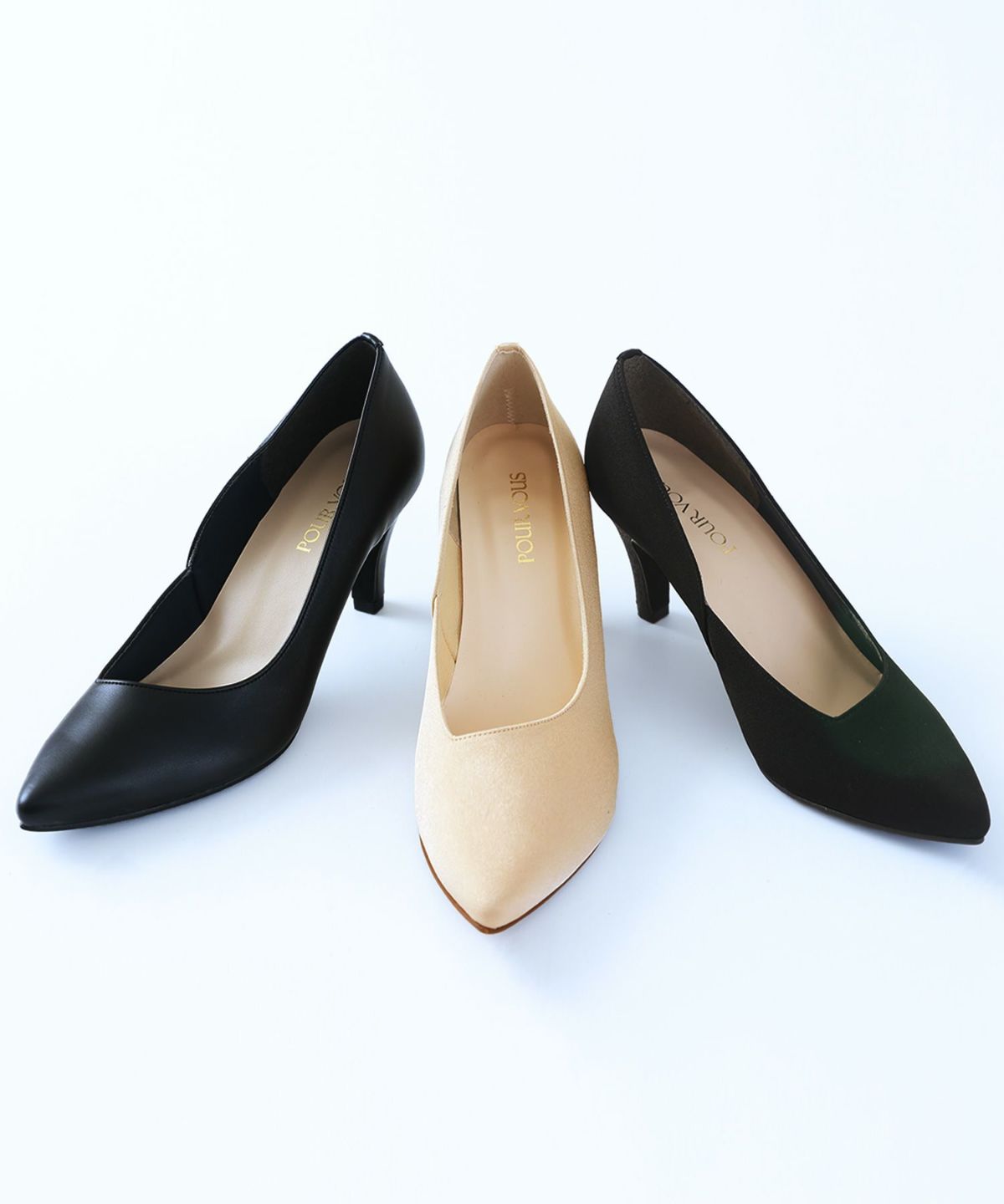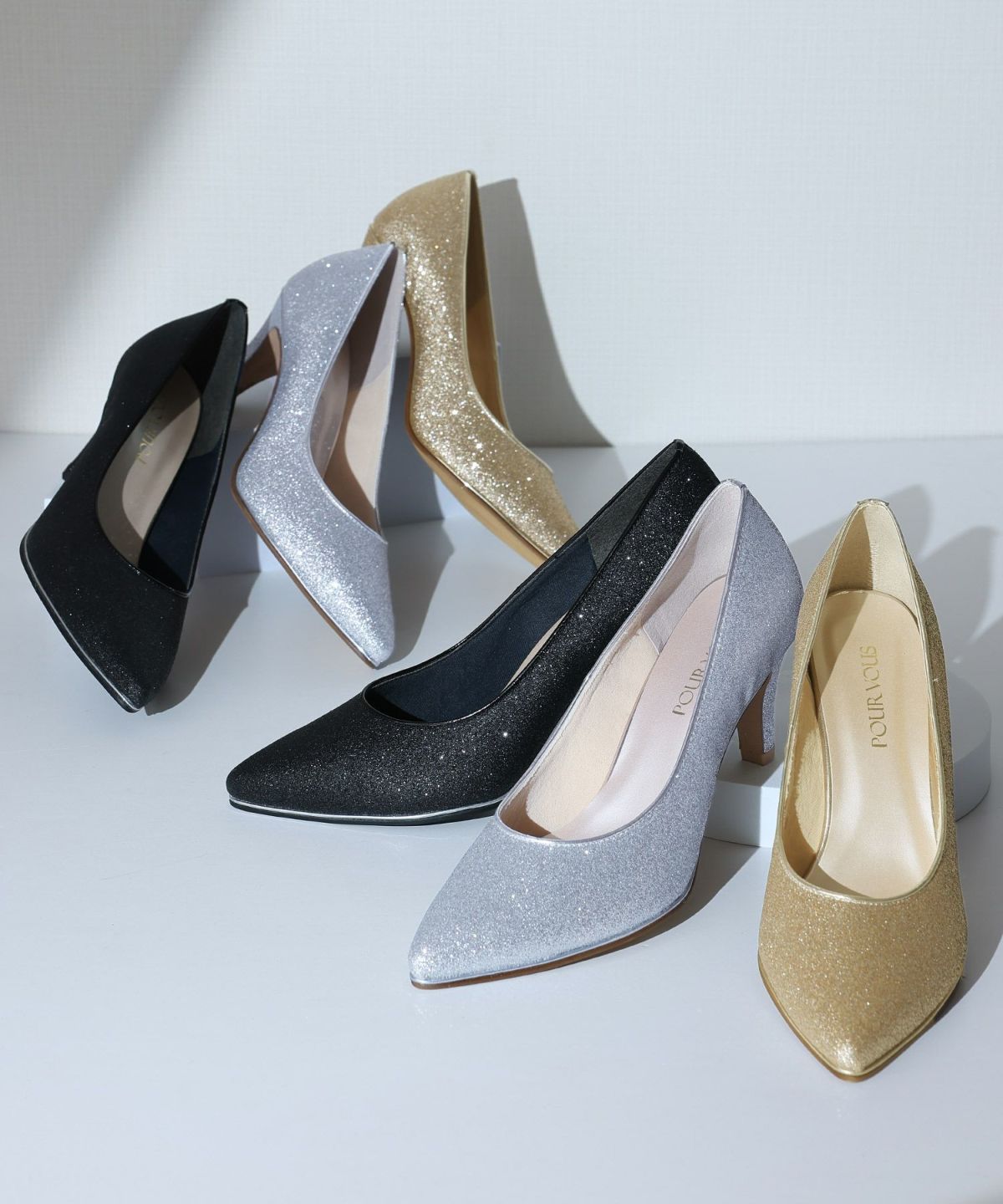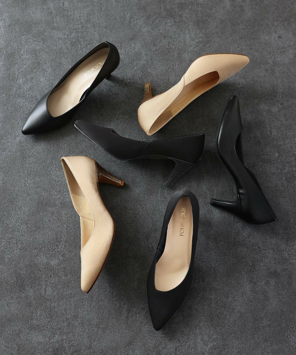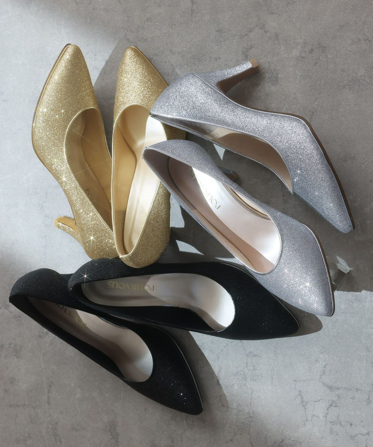 PourVousでは、定番のパンプスはもちろん、結婚式・二次会向けの華やかデザインまで多彩。