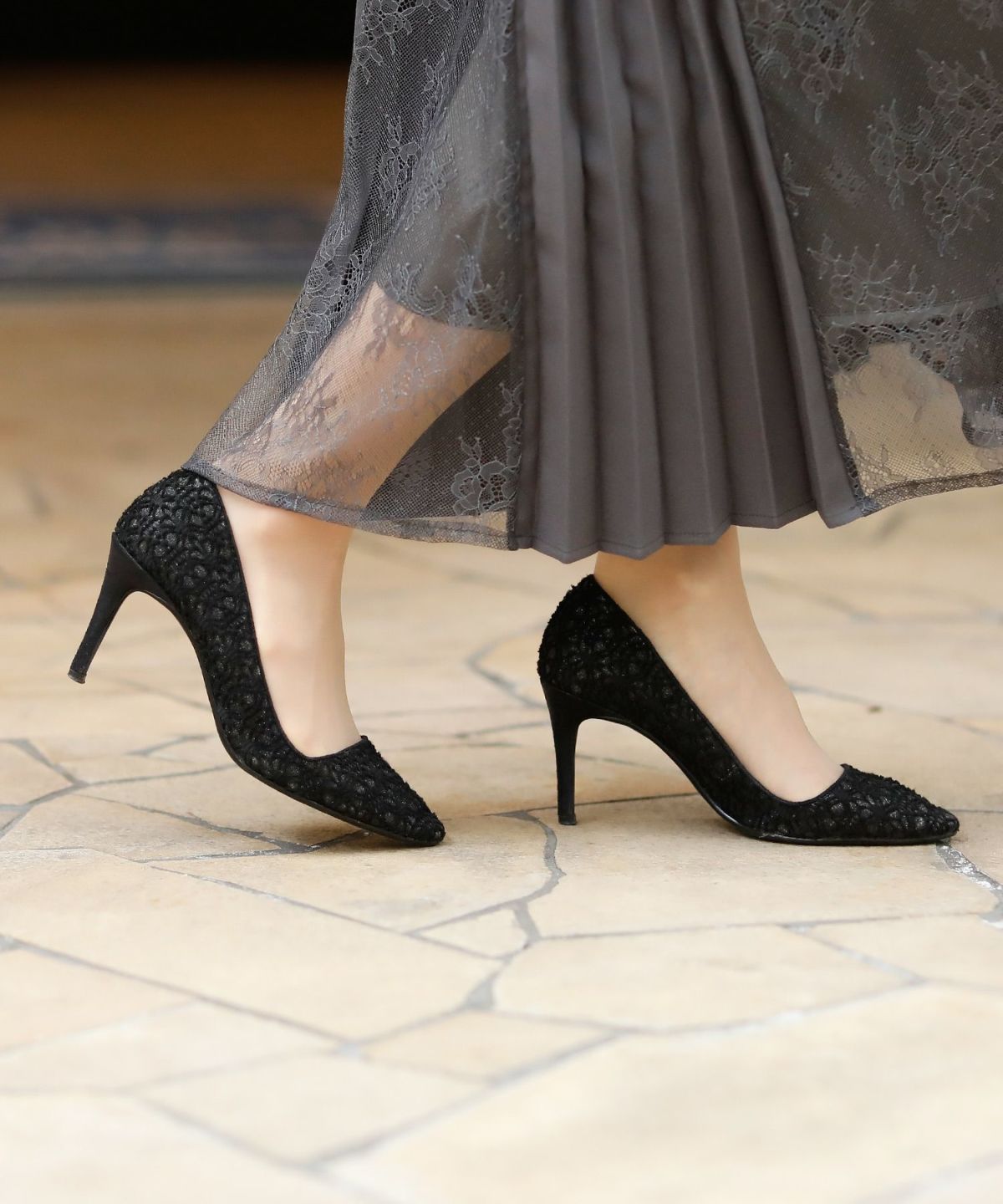 パーティードレスにぴったりのシューズで足元を美しく。ヒールの高さやデザインを選び、ドレスとのバランスを整えます。特に、同系色のパンプスやサンダルは、足を長く見せ、エレガントな印象を与えます。