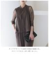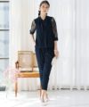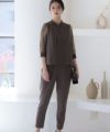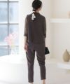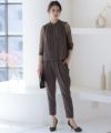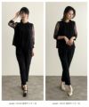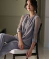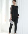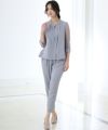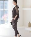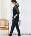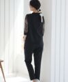 セットアップのパンツドレスにレースの切り替えで上品な装いに。
