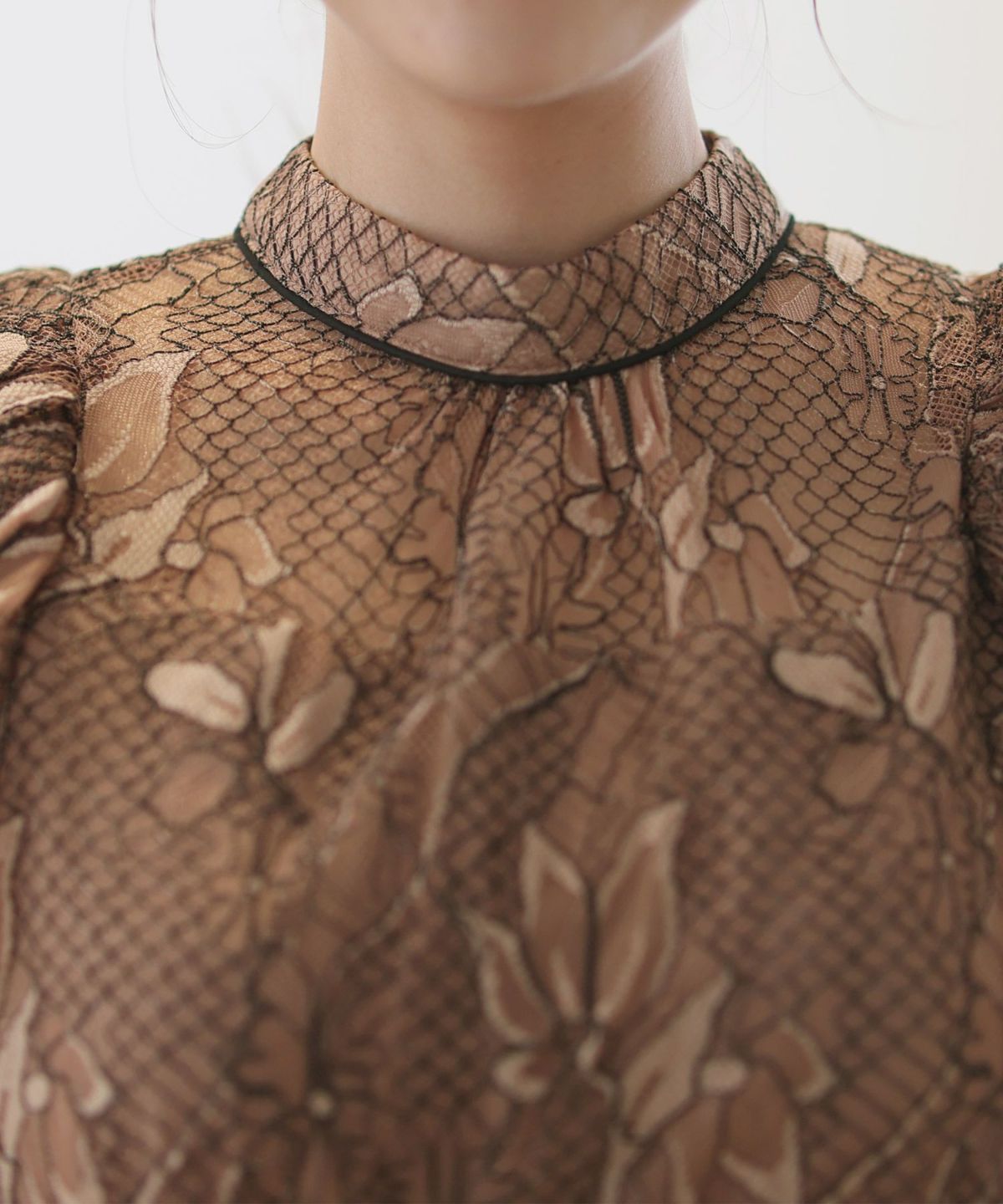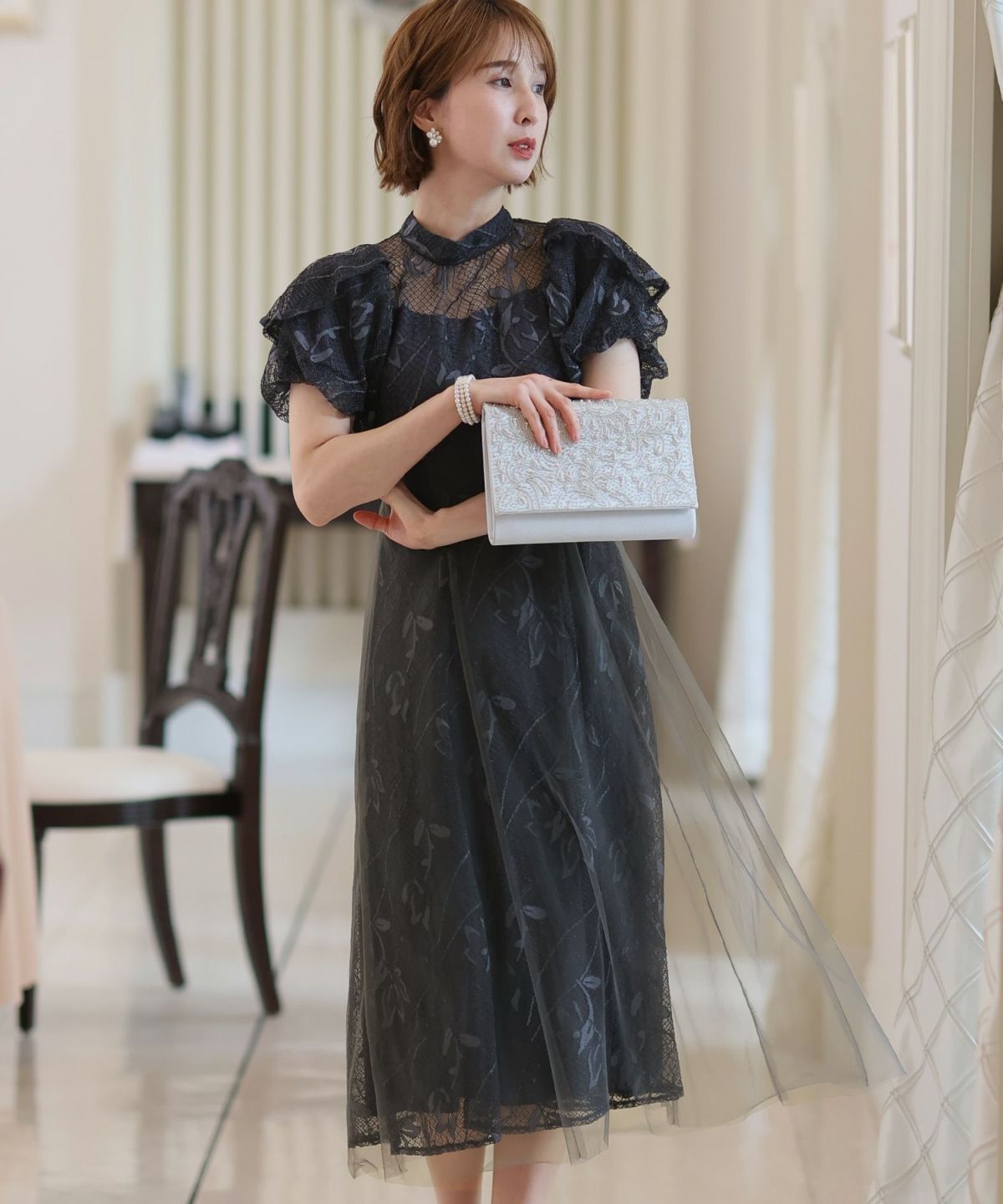 ■ハイネックとデコルテの程よい透け感が上品体型カバーポイント:【二の腕】【脚】【ウエスト】【ヒップ】ボリュームのある袖が可愛く二の腕をカバーしてくれます。胸下の切り替えデザインで脚長効果も◎