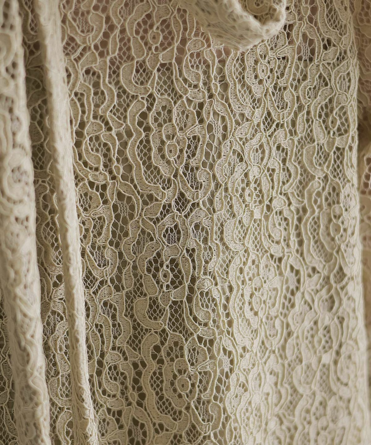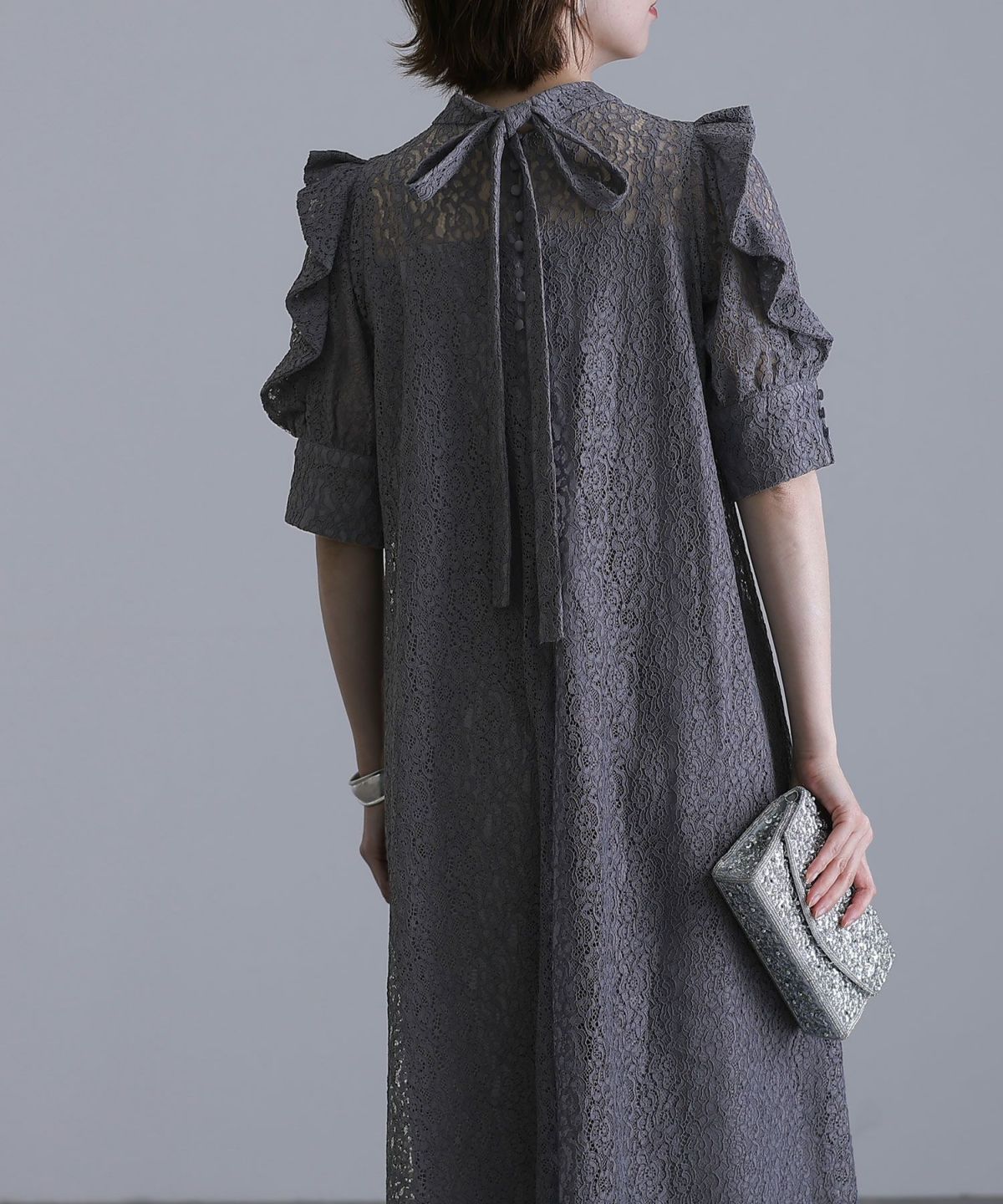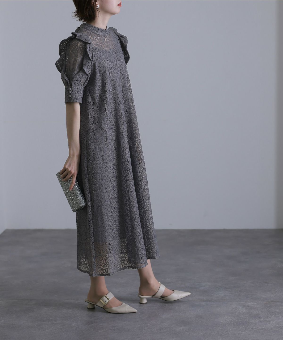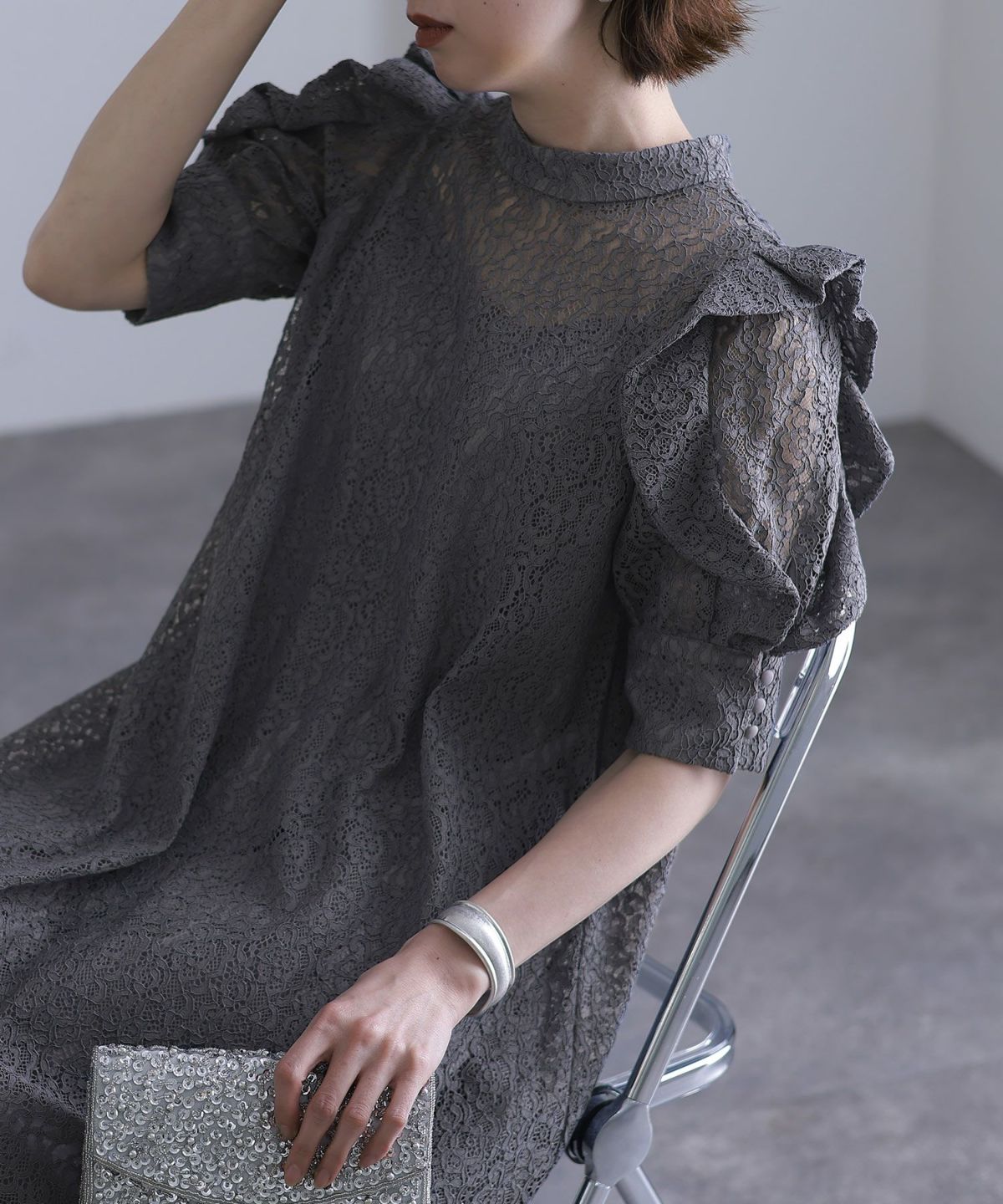 ■デコルテ~袖の透け感が女性らしい体型カバーポイント:【二の腕】【脚】【ウエスト】【ヒップ】ふんわりしたスリーブでさりげなく二の腕をカバーしてくれます。レーストップスのウエストマークでスタイルアップ効果も。