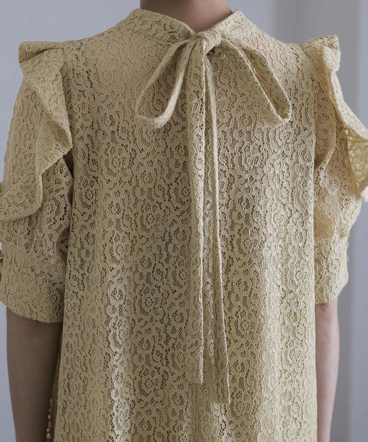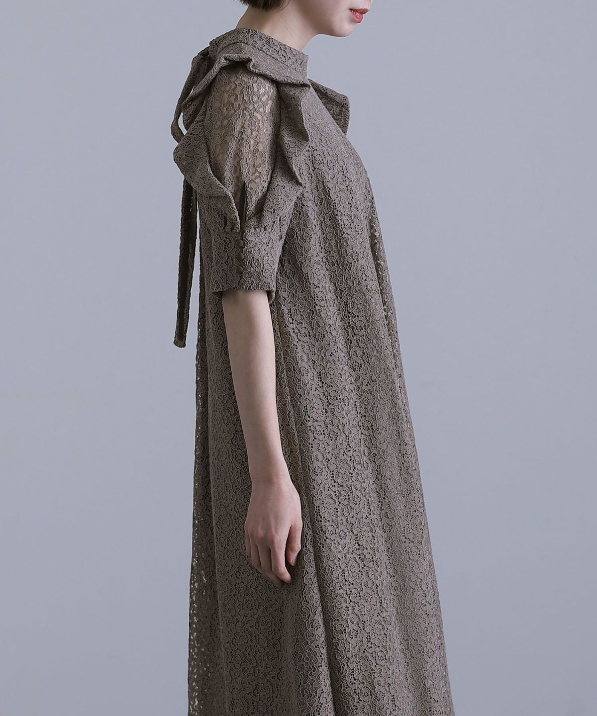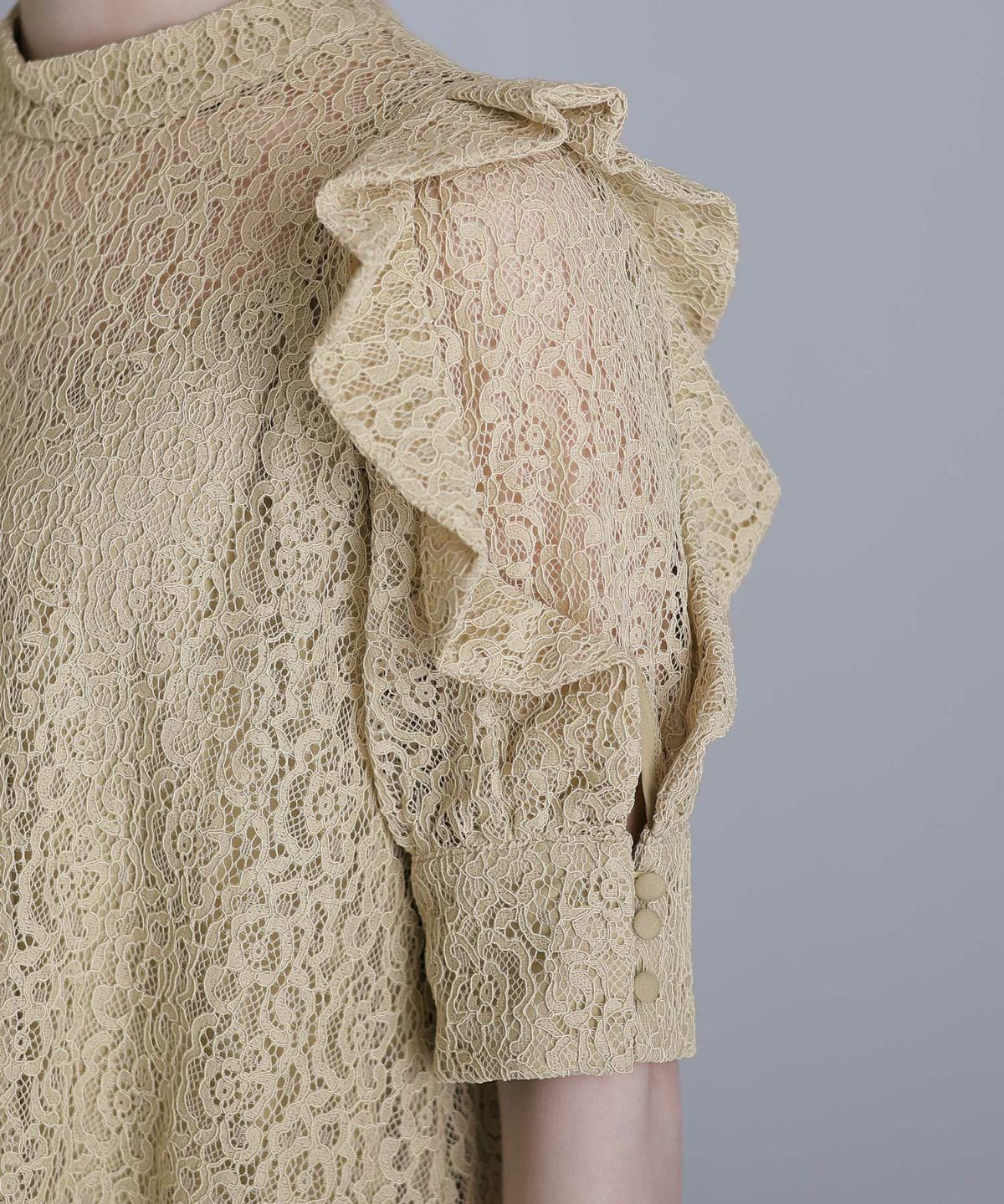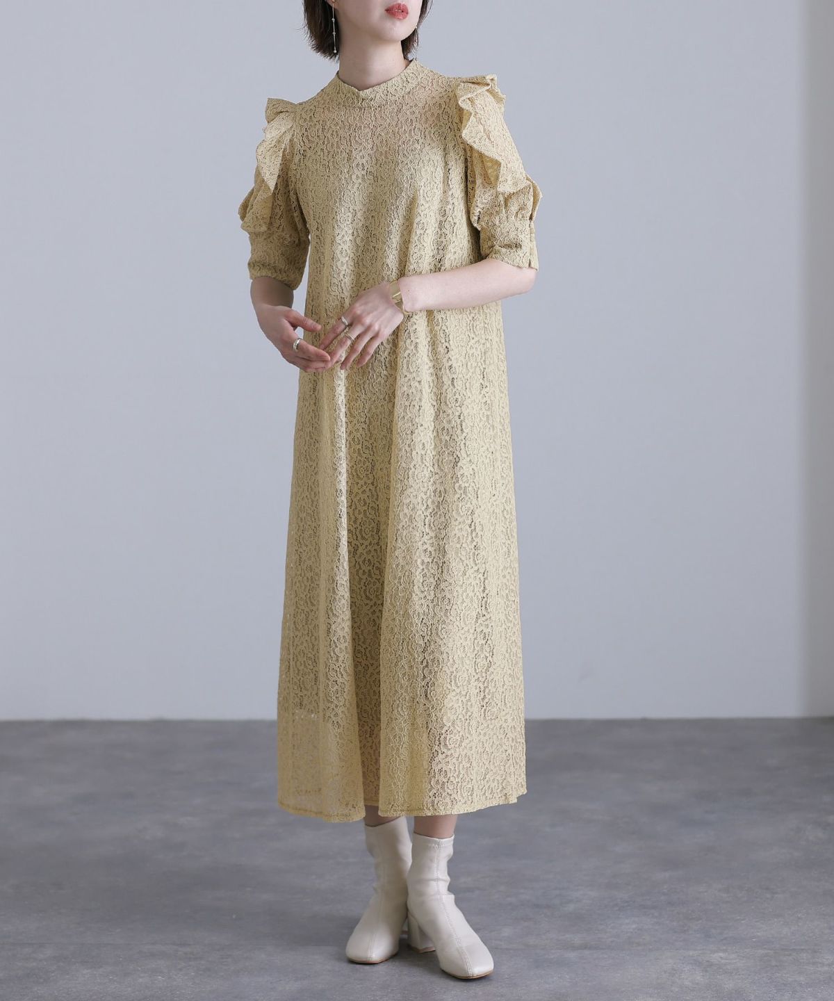 ■デコルテ~袖の透け感が女性らしい体型カバーポイント:【二の腕】【脚】【ウエスト】【ヒップ】ふんわりしたスリーブでさりげなく二の腕をカバーしてくれます。レーストップスのウエストマークでスタイルアップ効果も。