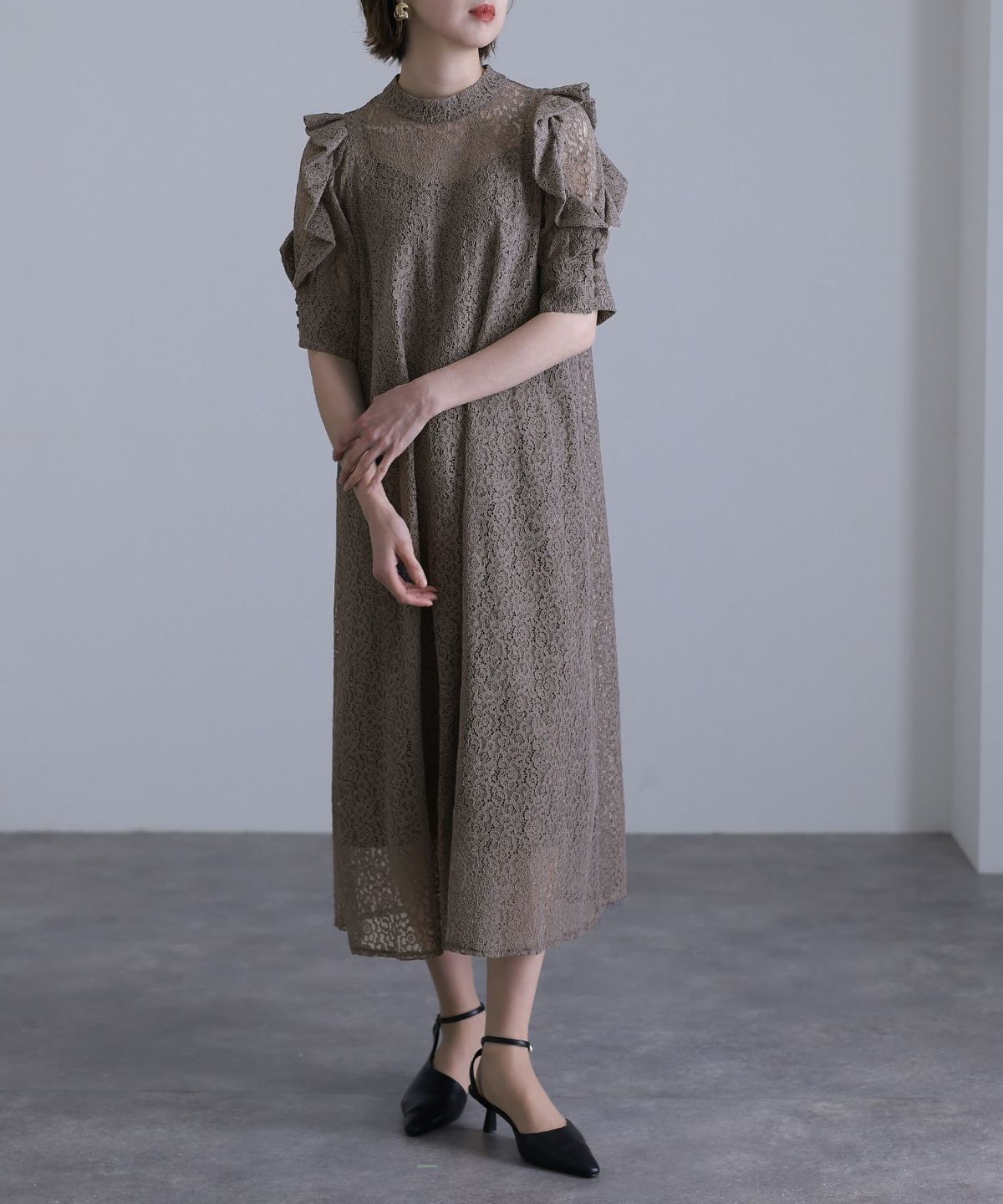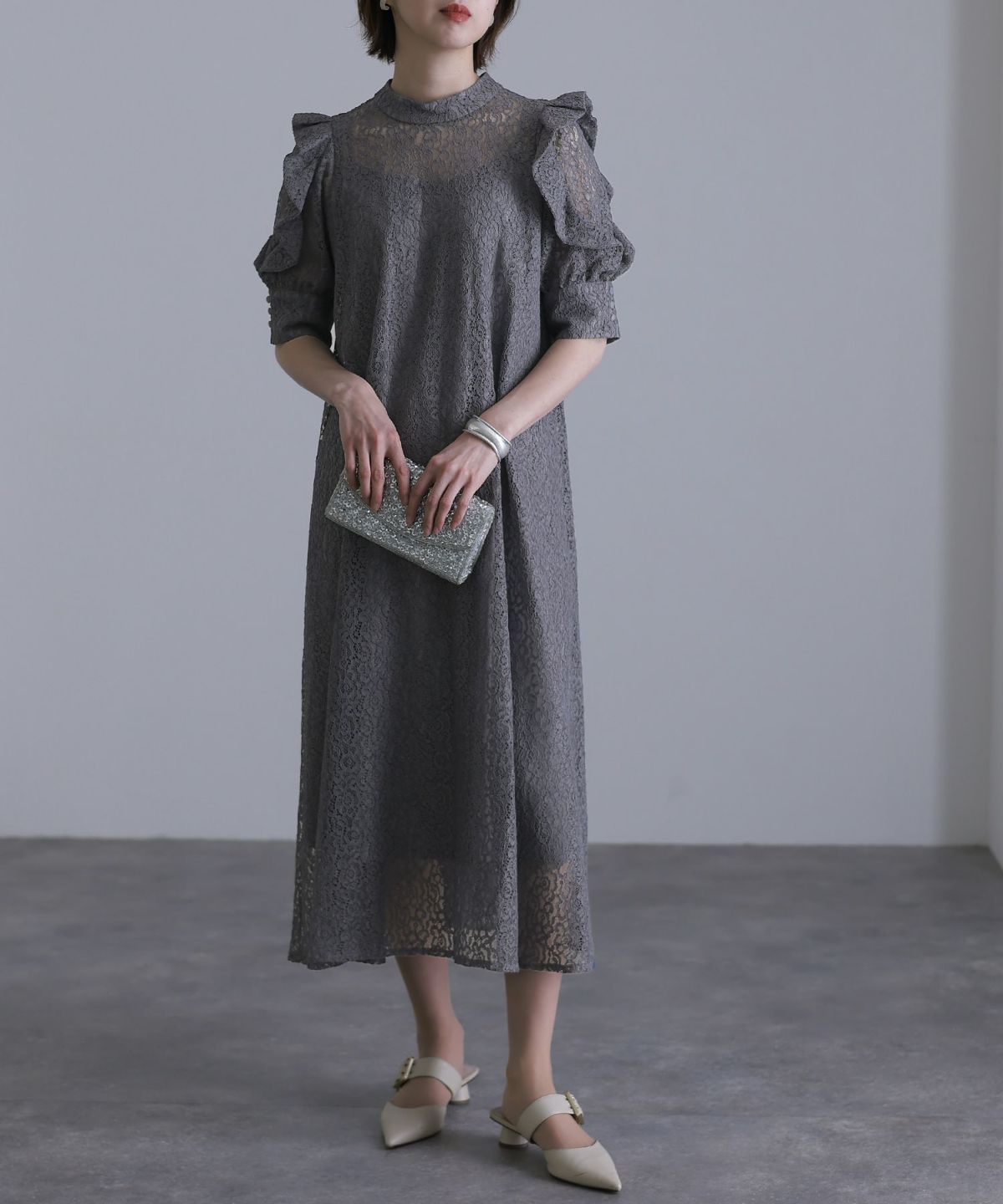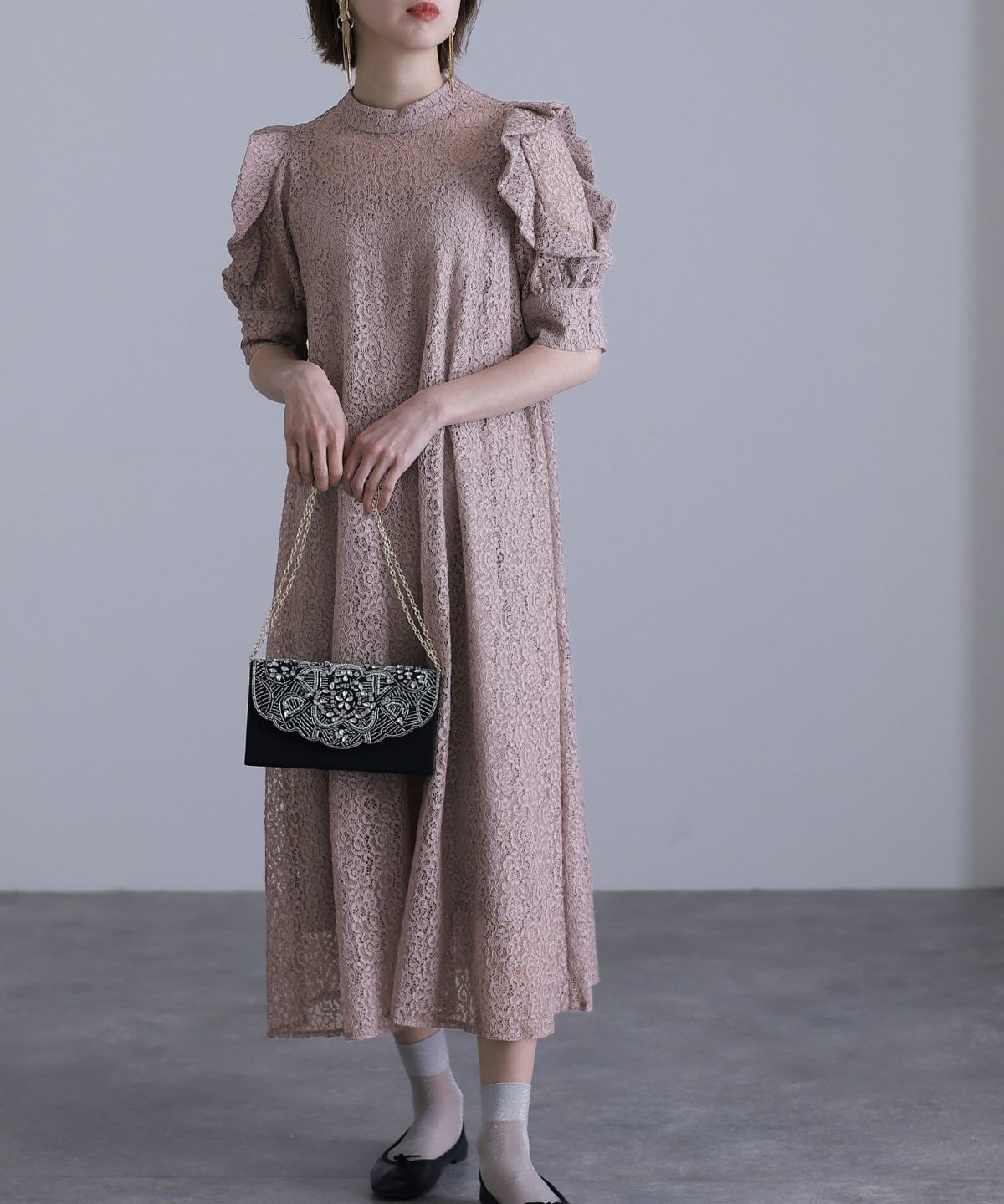 フリルの下のカフス袖がさりげなくオシャレ ハイネックショルダーフリルワンピース